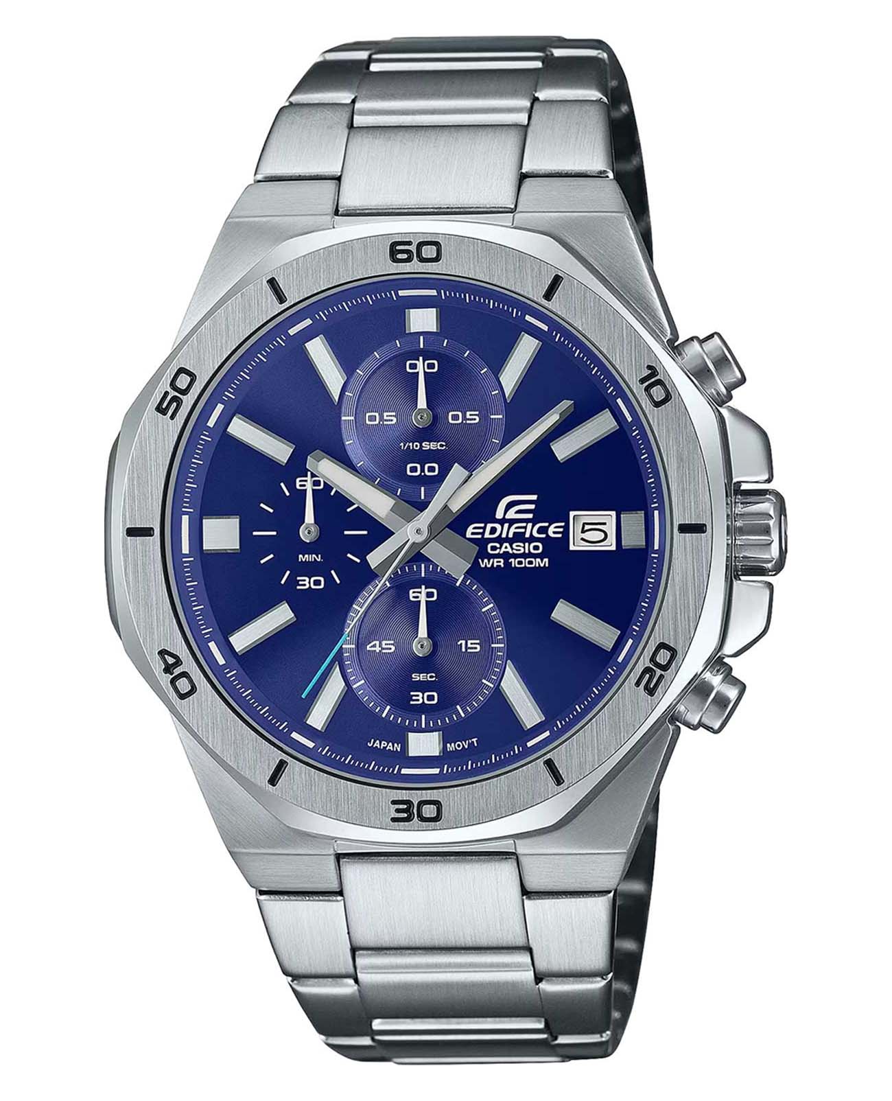 Мужские часы-хронографХронографФункция позволяет измерять отрезки времени с особой точностью: часы, минуты, секунды. Верным признаком хронографа является наличие на циферблате 3 дополнительных окошек-счётчиков. Casio Edifice EFV-640D-2A, кварцевый механизм с высокой точностью. Минеральное стеклоМинеральное стеклоМинеральное стекло представляет собой искусственно выращенный минерал кварца. Такое стекло отличается особой устойчивостью к повреждениям и царапинам. Уступает по некоторым качествам сапфировому стеклу. устойчивое к появлению царапин, обладающее высокой прозрачностью. СекундомерСекундомерСекундоме́р — прибор, способный измерять интервалы времени с точностью до долей секунды. с точностью показаний 1/10с и временем измерения 1ч. Корпус изготовлен из нержавеющей стали. Светонакопительное покрытие NeobriteПодсветка NeobriteИспользование светонакопительных составов на основе сульфида цинка или алюмината стронция, яркий свет можно наблюдать на протяжении 6-10 часов после «зарядки» часов около источника света. продолжает светиться в темноте даже после непродолжительного пребывания на свету. На циферблате находится три дополнительных индикатора. Окошко даты находится в положении 3 часов. Класс водозащиты: 100 метров, позволит плавать, нырять и заниматься другими водными видами спорта. Заводная головка с защитой. Стальной браслет на раскладной застёжкеРаскладная застёжкаТакой тип застёжки используется только на браслетах из металла. Она никогда не раскрывается полностью, происходит разделение на 2 и более частей. Раскладывающая застёжка снизит вероятность потери часов к минимуму..