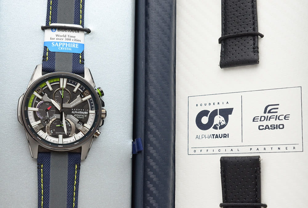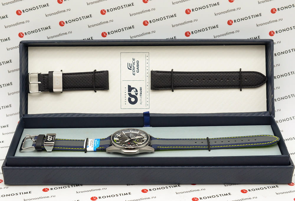 Флагманская модель в коллекции Edifice несомненно идеально будет смотреться на сильном мужском запястье. Часы Casio Edifice Scuderia Alpha Tauri EFS-S580AT-1AER из лимитированной серии, созданной в коллаборации с итальянской гоночной командой Формулы-1 Scuderia AlphaTauri. Внутренний корпус часов изготовлен из того же углеродного волокна 6K, что используется в аэродинамических крыльях гоночной машины Scuderia AlphaTauri. Элементы циферблата и секундная стрелка окрашены в флуоресцентный желтый цвет, который используется на трассах Формулы-1 для безопасности. Тканевый ремешок со светоотражающей полоской и классической застежкой. В комплекте сменный кожаный ремешок. Лимитированная серия. Часы созданы при сотрудничестве с гоночной командой Scuderia AlphaTauri Formula 1, которую поддерживает EDIFICE. Циферблат и застежка украшены логотипом команды. Карбон 6K используемый для изготовления циферблата точно такой же, который используется при создании болида команды Scuderia AlphaTauri. Флуоресцентный желтый цвет - цвет, который используется на гоночной трассе для безопасности, а последние 15 секунд подсвечиваются в соответствии с правилом F1, согласно которому члены экипажа должны покинуть сетку за 15 секунд до начала гонки. Питание от солнечной энергии Tough SolarTough SolarТехнология основана на подзарядке аккумулятора от источника солнечного света, специальная панель улавливает солнечные лучи и преобразует их в энергию для работы часов. Достаточно пары минут нахождения на солнце для функционирования часов в течении суток. - солнечные батарейки большой мощности, индикатор низкого заряда батареи. Время работы аккумулятора без подзарядки до 5 месяцев, при включенной функции сохранения энергии до 19 месяцев. Подсветка NeobriteПодсветка NeobriteИспользование светонакопительных составов на основе сульфида цинка или алюмината стронция, яркий свет можно наблюдать на протяжении 6-10 часов после «зарядки» часов около источника света. обеспечивает длительное послесвечение в темноте даже после кратковременного нахождения на свету. Часы-хронографХронографФункция позволяет измерять отрезки времени с особой точностью: часы, минуты, секунды. Верным признаком хронографа является наличие на циферблате 3 дополнительных окошек-счётчиков. с секундомеромСекундомерСекундоме́р — прибор, способный измерять интервалы времени с точностью до долей секунды. и тахиметромТахиметрРазмеченная шкала, располагается на ободке или безеле часов. Тахиметр позволяет рассчитать скорость на определённом участке пути, расстояние измеряется в километрах или милях.. СекундомерСекундомерСекундоме́р — прибор, способный измерять интервалы времени с точностью до долей секунды. с точностью показаний 1/1000с и временем измерения 24ч. Память на 200 кругов. 12-ти и 24-х часовой формат времени. Второй часовой поясВторой часовой поясФункция, позволяющая отображать время двух часовых поясов одновременно. и мировое времяМировое время Полезное часовое усложнение, отображающее время в основных городах и известных областях по всему миру, оно связано с часовыми поясами, удобно для путешественников и бизнесменов. , одновременное отображение текущего времени и времени в другом часовом поясе. Беспроводная технология BluetoothBluetoothСовременная технология, позволяющая синхронизировать часы с телефоном и переносить данные. Часы с Bluetooth расширяют возможности 