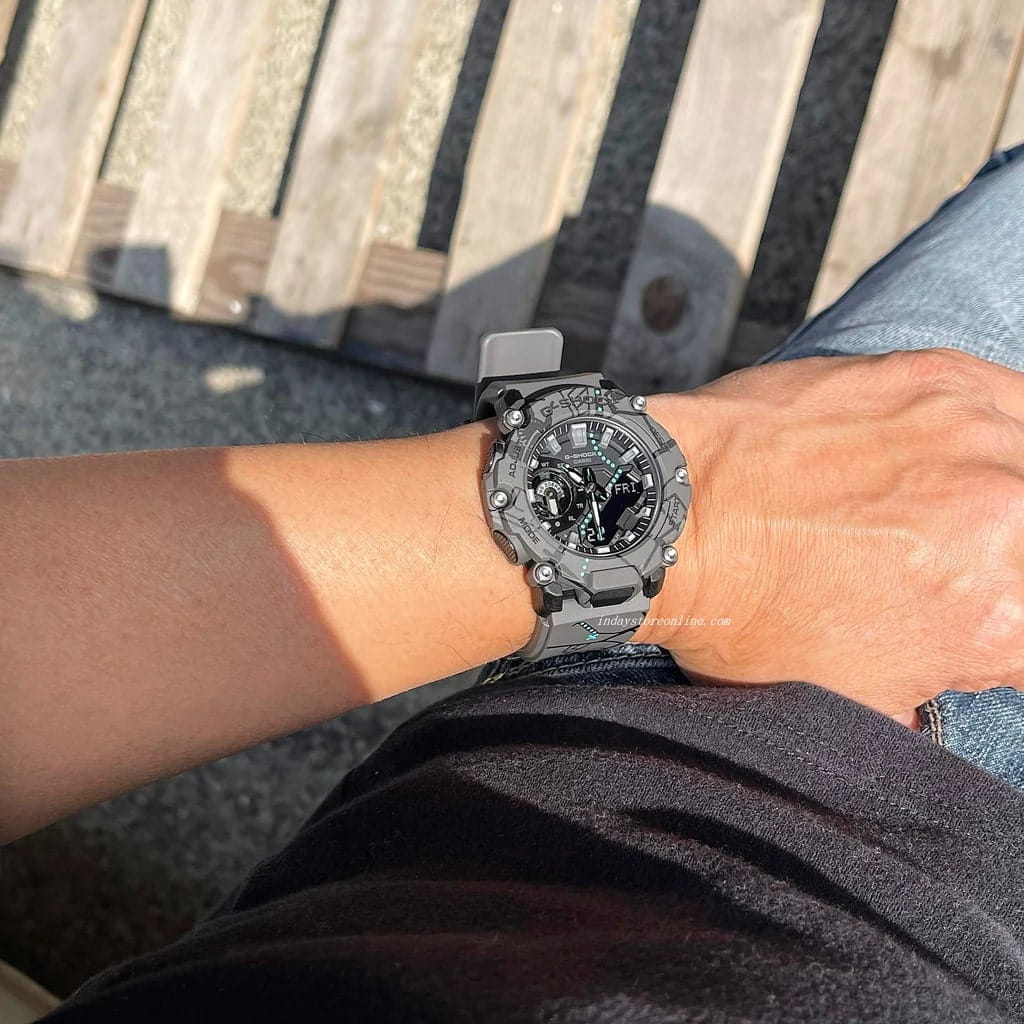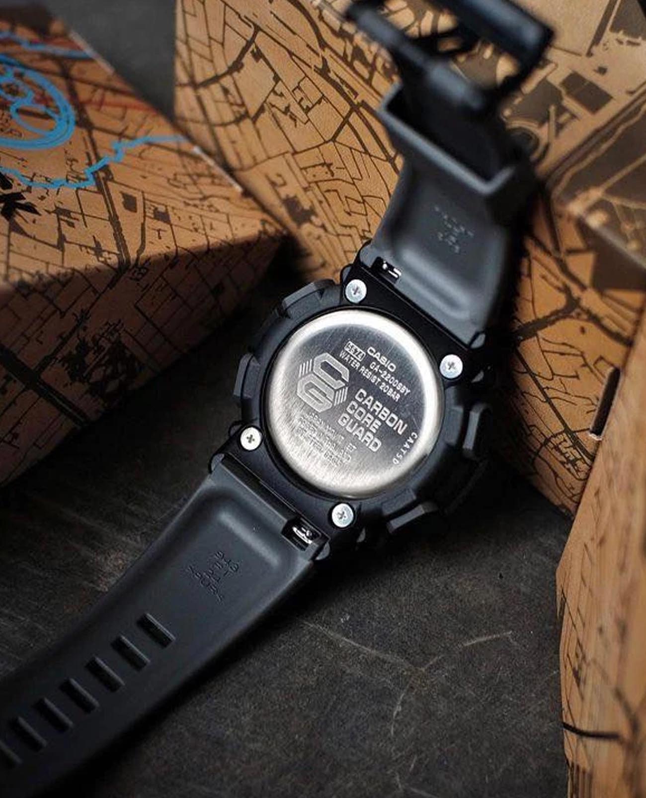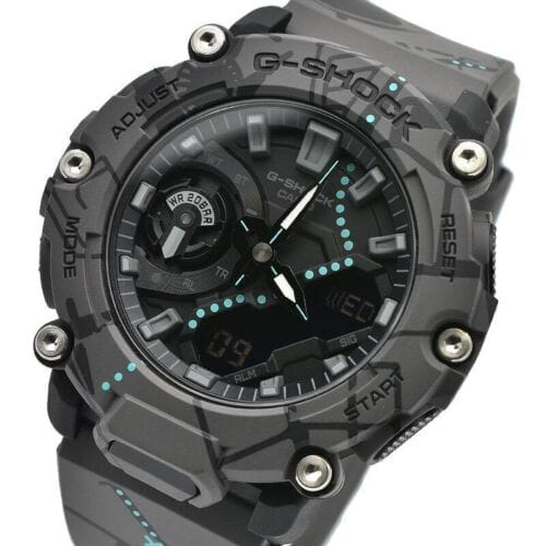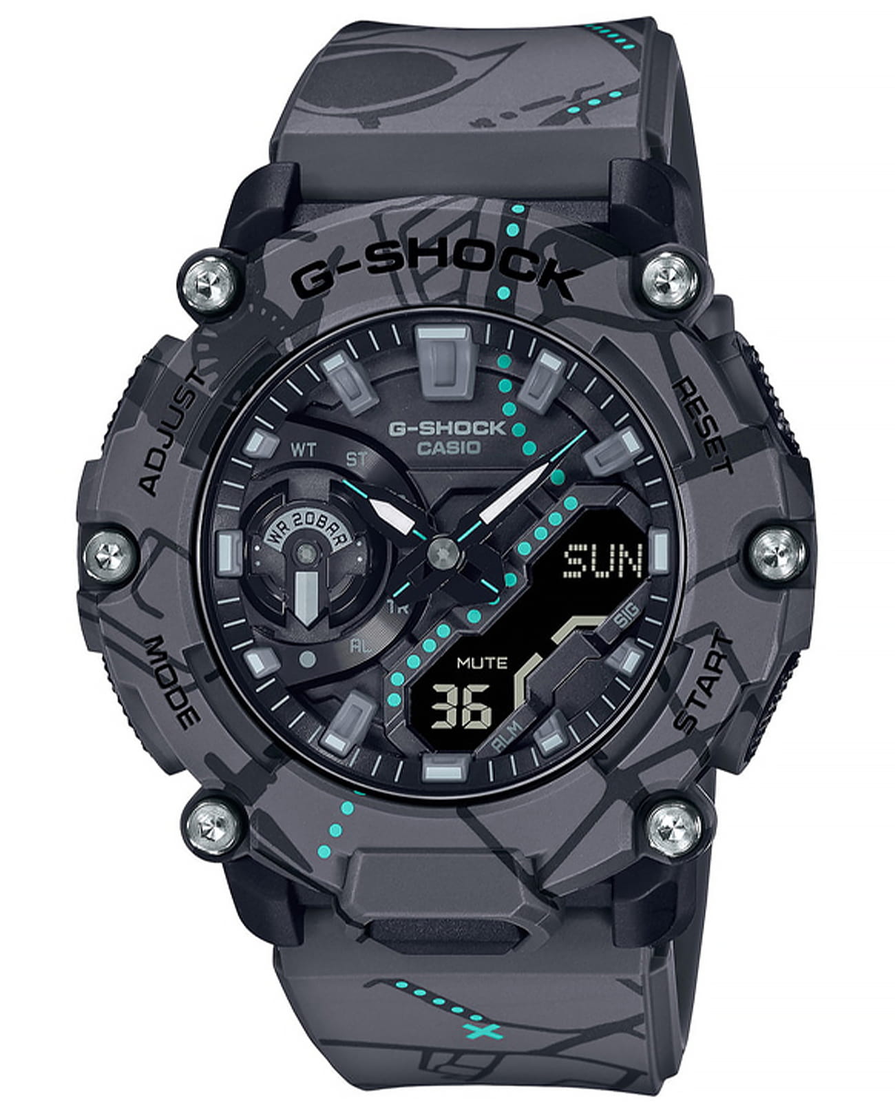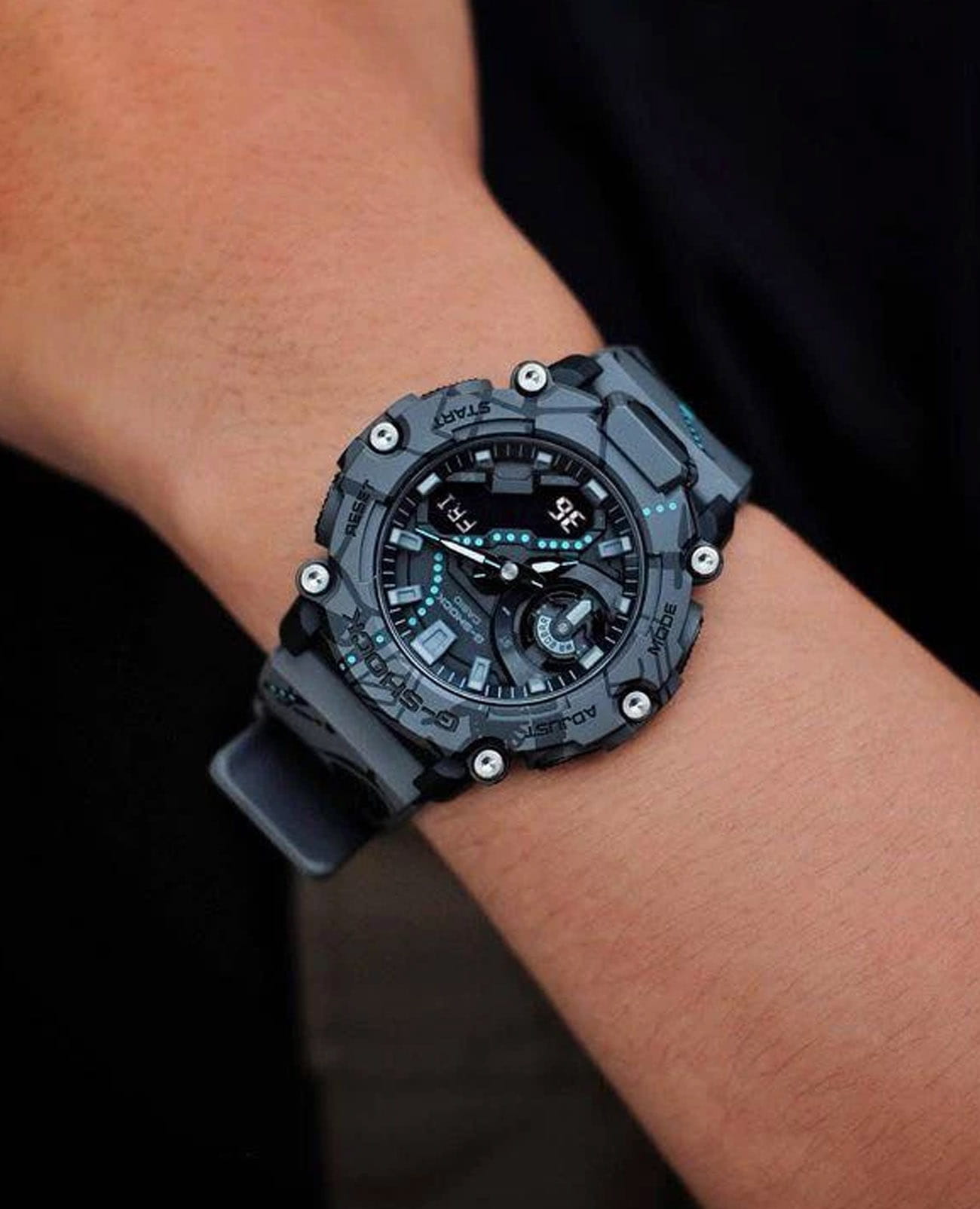 Японские мужские часы-хронографХронографФункция позволяет измерять отрезки времени с особой точностью: часы, минуты, секунды. Верным признаком хронографа является наличие на циферблате 3 дополнительных окошек-счётчиков. Casio G-Shock  G-SHOCK GA-2200SBY-8A R из коллекции G-Shock. Корпус и циферблат украшены картой района Сибуя, который главным центром моды Токио. Структура Carbon Core Guard. Минеральное стеклоМинеральное стеклоМинеральное стекло представляет собой искусственно выращенный минерал кварца. Такое стекло отличается особой устойчивостью к повреждениям и царапинам. Уступает по некоторым качествам сапфировому стеклу. устойчивое к появлению царапин, обладающее высокой прозрачностью. Корпус часов изготовлен из полимерного материала. Светодиодная автоподсветка NeobriteПодсветка NeobriteИспользование светонакопительных составов на основе сульфида цинка или алюмината стронция, яркий свет можно наблюдать на протяжении 6-10 часов после «зарядки» часов около источника света.  - при повороте часов в сторону лица подсветка дисплея осуществляется автоматически. Настраиваемое послесвечение 1,5 или 3сек. Ударопрочный корпусУдаропрочный корпусМеханизм заключён в корпус, выполненный из современных материалов, устойчивых к ударам, механическим повреждениям и падению с высоты: инновационный пластик, карбон, нержавеющая сталь, титан. защищает механизм от ударов и вибрации. СекундомерСекундомерСекундоме́р — прибор, способный измерять интервалы времени с точностью до долей секунды. с точностью измерения 1/100 секунды и измерением до 23 часов 59 минут 59,99 cек. ТаймерТаймерОтсчитывает секунды в обратном направлении в заданном интервале времени. обратного отсчета (диапазон времени 24 часа), автоматический календарь, 12/24 отображение времени, будильникБудильникБуди́льник — часы, в заданный момент времени подающие звуковой, световой и/или в редких случаях другой сигнал.. Типы сигналов: ежедневный, ежемесячный, каждый день определенного месяца, на определенную дату. Световая индикация сигнала. Батарея рассчитана на 3 года. Стальная задняя крышка крепится на 4-х винтах. Класс водозащиты: 200 метров, позволит плавать, нырять и заниматься другими водными видами спорта. Ремешок из полимерного материала на стандартной застежке.