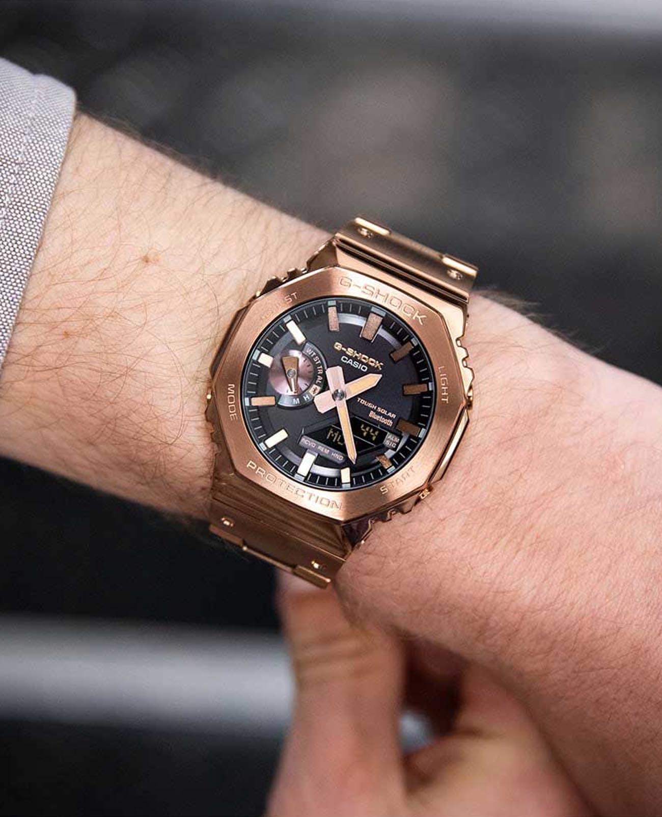 Японские мужские часы-хронографХронографФункция позволяет измерять отрезки времени с особой точностью: часы, минуты, секунды. Верным признаком хронографа является наличие на циферблате 3 дополнительных окошек-счётчиков. Casio G-Shock GM-B2100GD-5ADR. Стильный дизайн этих часов идеально дополняет функциональность и надежность. Часы для активной молодежи G-Shock. Стальной корпус с IP-покрытиемIP-покрытиеМетод ионного напыления. Демонстрирует повышенную устойчивость к истиранию, окислению и химическим веществам. Под воздействием высокого давления и температуры около 1500°C молекулы металла надёжно соединяются с частицами корпуса часов.. Питание от солнечной энергии Tough SolarTough SolarТехнология основана на подзарядке аккумулятора от источника солнечного света, специальная панель улавливает солнечные лучи и преобразует их в энергию для работы часов. Достаточно пары минут нахождения на солнце для функционирования часов в течении суток. - солнечные батарейки большой мощности. Индикатор заряда батареи. Функция автоматического сохранения энергии. Время работы аккумулятора без подзарядки - 7 месяцев, при включенной функции сохранения энергии - 18 месяцев. Минеральное стеклоМинеральное стеклоМинеральное стекло представляет собой искусственно выращенный минерал кварца. Такое стекло отличается особой устойчивостью к повреждениям и царапинам. Уступает по некоторым качествам сапфировому стеклу. устойчивое к появлению царапин, обладающее высокой прозрачностью. Ударопрочный корпусУдаропрочный корпусМеханизм заключён в корпус, выполненный из современных материалов, устойчивых к ударам, механическим повреждениям и падению с высоты: инновационный пластик, карбон, нержавеющая сталь, титан. защищает механизм от ударов и вибрации. Светодиодная автоподсветка NeobriteПодсветка NeobriteИспользование светонакопительных составов на основе сульфида цинка или алюмината стронция, яркий свет можно наблюдать на протяжении 6-10 часов после «зарядки» часов около источника света. - при повороте часов в сторону лица подсветка дисплея осуществляется автоматически. Настраиваемое послесвечение 1,5 или 3сек. Мировое время Мировое время Полезное часовое усложнение, отображающее время в основных городах и известных областях по всему миру, оно связано с часовыми поясами, удобно для путешественников и бизнесменов. 38 городов (38 часовых поясов), всемирное координированное время UTCUTCВсемирное кординационное время, не имеющее привязки к географическому положению Гринвича, основывается на атомном отсчёте времени. Регулировка времени осуществляется более точно, чем устаревшее GMT.