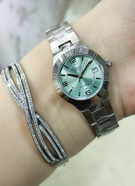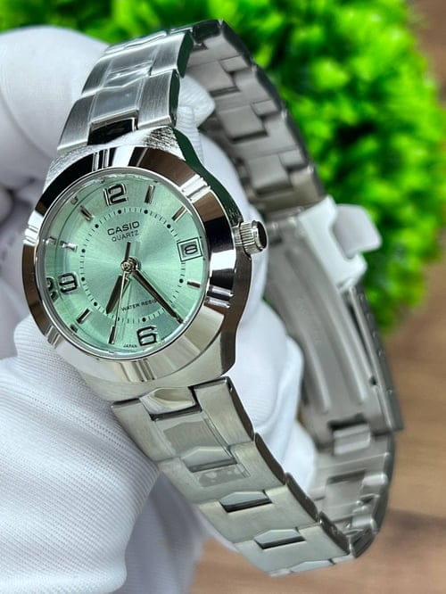 Японские женские часы Casio Collection LTP-1241D-3A изящно смотрятся на запястье, они привлекают классическим исполнением и правильной геометрией. Минималистичная модель станет отличным решением для любого случая: на работу, переговоры с деловыми партнёрами, прогулку с друзьями или праздничный вечер. Отсутствуют лишние детали, что позволяет часам быть актуальными на долгие годы. Циферблат дополнен минеральным стекломМинеральное стеклоМинеральное стекло представляет собой искусственно выращенный минерал кварца. Такое стекло отличается особой устойчивостью к повреждениям и царапинам. Уступает по некоторым качествам сапфировому стеклу. , устойчивым к мелким механическим повреждениям. Корпус выполнен из нержавеющей стали 316L, отличающейся долговечностью и устойчивостью к повреждениям и царапинам. Модель комплектуется надёжным механизмом, точность хода которого составляет +/- 20 сек/мес. Окошко даты находится в положении 3 часа. Класс водозащиты 30 метров, позволит защитить корпус от случайных брызг или капель дождя.