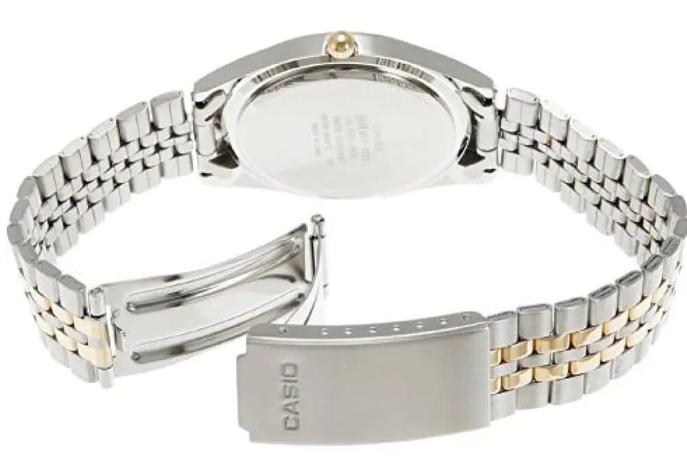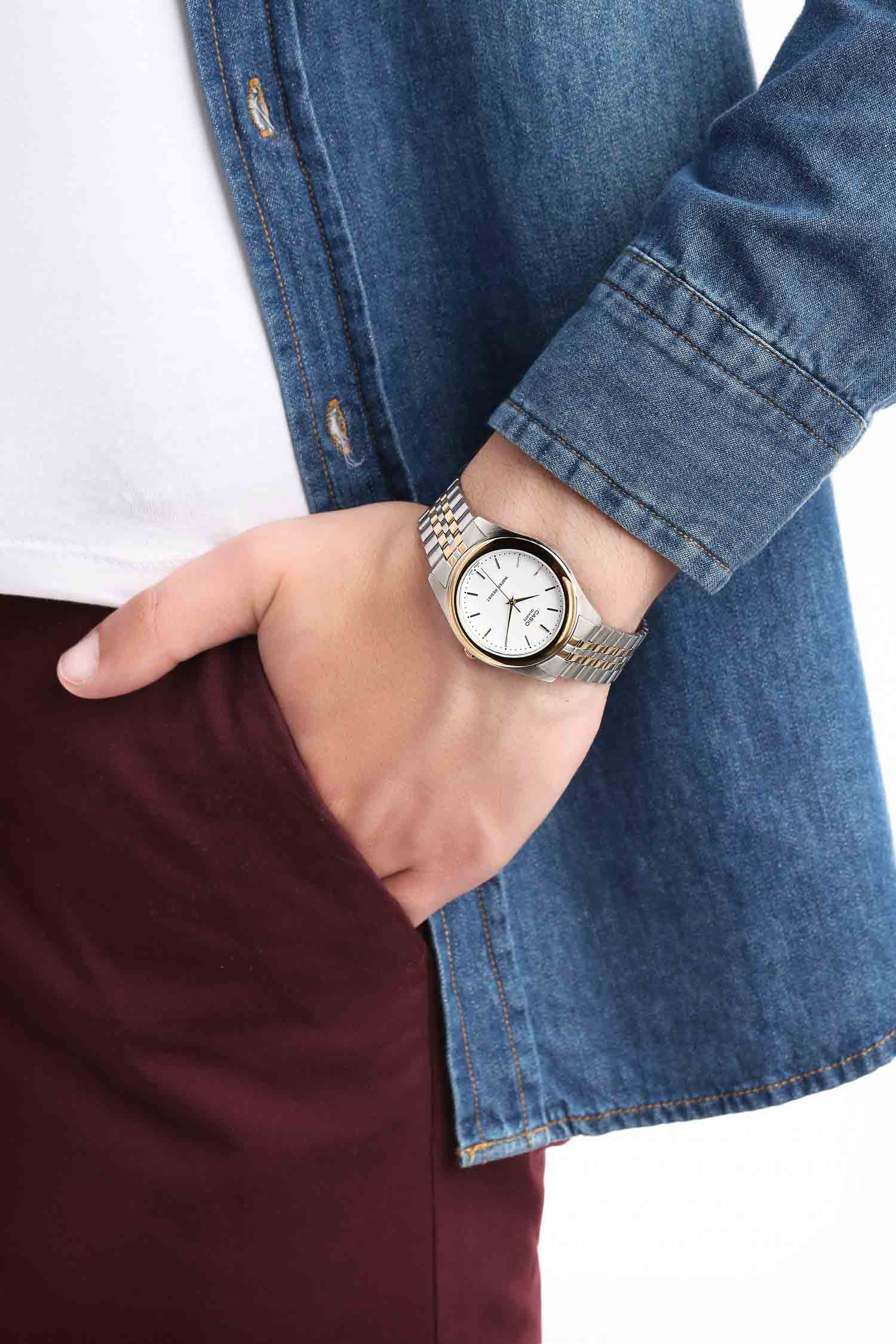 Японские мужские часы с минеральным стекломМинеральное стеклоМинеральное стекло представляет собой искусственно выращенный минерал кварца. Такое стекло отличается особой устойчивостью к повреждениям и царапинам. Уступает по некоторым качествам сапфировому стеклу. Casio Collection MTP-1129G-7B, кварцевый механизм с высокой точностью. Класс водозащиты: 30 метров, позволит защитить корпус от случайных брызг или капель дождя. Корпус часов изготовлен из стали. Стальной браслет на раскладной застёжкеРаскладная застёжкаТакой тип застёжки используется только на браслетах из металла. Она никогда не раскрывается полностью, происходит разделение на 2 и более частей. Раскладывающая застёжка снизит вероятность потери часов к минимуму. с IP-покрытиемIP-покрытиеМетод ионного напыления. Демонстрирует повышенную устойчивость к истиранию, окислению и химическим веществам. Под воздействием высокого давления и температуры около 1500°C молекулы металла надёжно соединяются с частицами корпуса часов.. БезельБезельВнешний ободок, закрепляющий стекло. В спортивных часах так называется поворотное кольцо с делениями на циферблате, выполняет роль таймера – замеряет отрезки времени на шкале. Неподвижный безель – элемент декора. Однонаправленно вращающийся безель на дайверских часах позволяет фиксировать моменты погружения и выныривания на поверхность. с IP-покрытиемIP-покрытиеМетод ионного напыления. Демонстрирует повышенную устойчивость к истиранию, окислению и химическим веществам. Под воздействием высокого давления и температуры около 1500°C молекулы металла надёжно соединяются с частицами корпуса часов..
