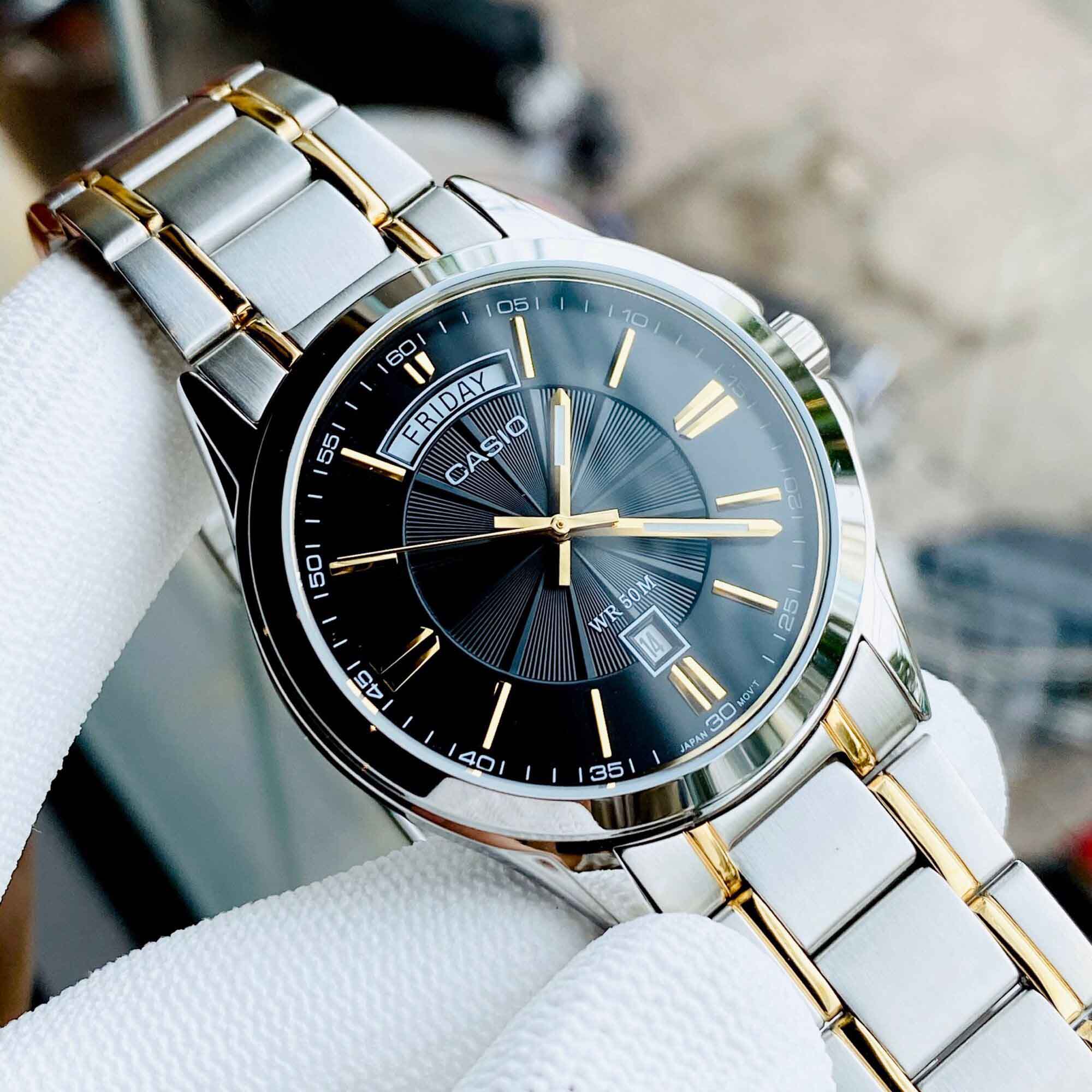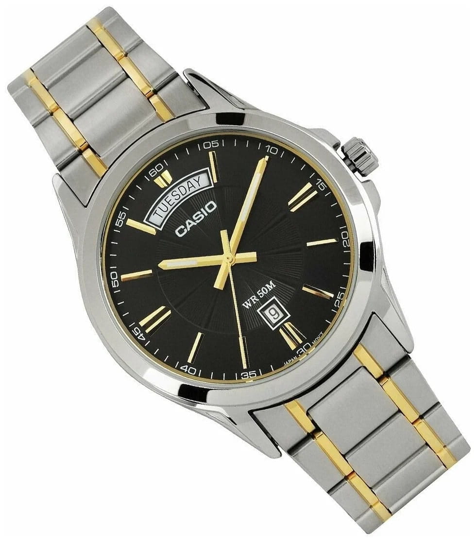 Японские мужские наручные часы с минеральным стекломМинеральное стеклоМинеральное стекло представляет собой искусственно выращенный минерал кварца. Такое стекло отличается особой устойчивостью к повреждениям и царапинам. Уступает по некоторым качествам сапфировому стеклу. Casio MTP-1381G-1A, кварцевый механизм с высокой точностью. Класс водозащиты: 50 метров, позволит защитить корпус от случайных брызг или капель дождя. Корпус часов изготовлен из стали. Стальной браслет на раскладной застёжкеРаскладная застёжкаТакой тип застёжки используется только на браслетах из металла. Она никогда не раскрывается полностью, происходит разделение на 2 и более частей. Раскладывающая застёжка снизит вероятность потери часов к минимуму. с IP-покрытиемIP-покрытиеМетод ионного напыления. Демонстрирует повышенную устойчивость к истиранию, окислению и химическим веществам. Под воздействием высокого давления и температуры около 1500°C молекулы металла надёжно соединяются с частицами корпуса часов.. Окошко даты находится в положении 6 часов.