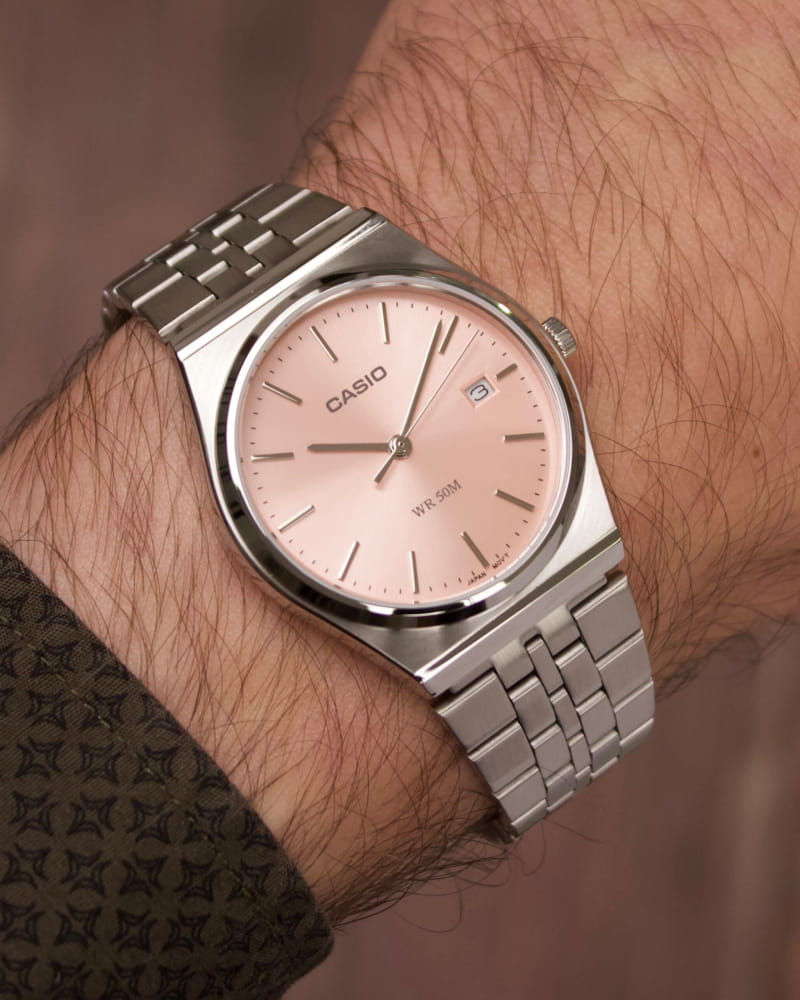 Японские мужские часы с минеральным стекломМинеральное стеклоМинеральное стекло представляет собой искусственно выращенный минерал кварца. Такое стекло отличается особой устойчивостью к повреждениям и царапинам. Уступает по некоторым качествам сапфировому стеклу. Casio Collection  MTP-B145D-4A, кварцевый механизм с высокой точностью. Корпус часов изготовлен из стали. Циферблат с метками в виде штрихов выполнен по технологии Sunray (солнечные лучи). Окошко даты находится в положении 3 часа. Батарейка рассчитана на 3 года. Класс водозащиты: 50 метров, позволит защитить корпус от случайных брызг или капель дождя. Стальной браслет на раскладной застёжкеРаскладная застёжкаТакой тип застёжки используется только на браслетах из металла. Она никогда не раскрывается полностью, происходит разделение на 2 и более частей. Раскладывающая застёжка снизит вероятность потери часов к минимуму..