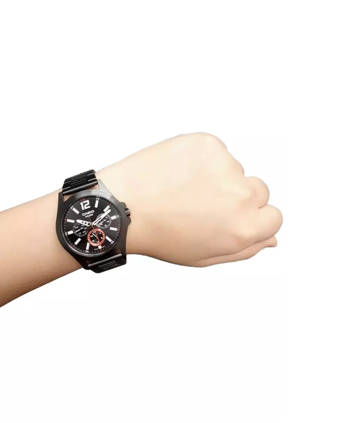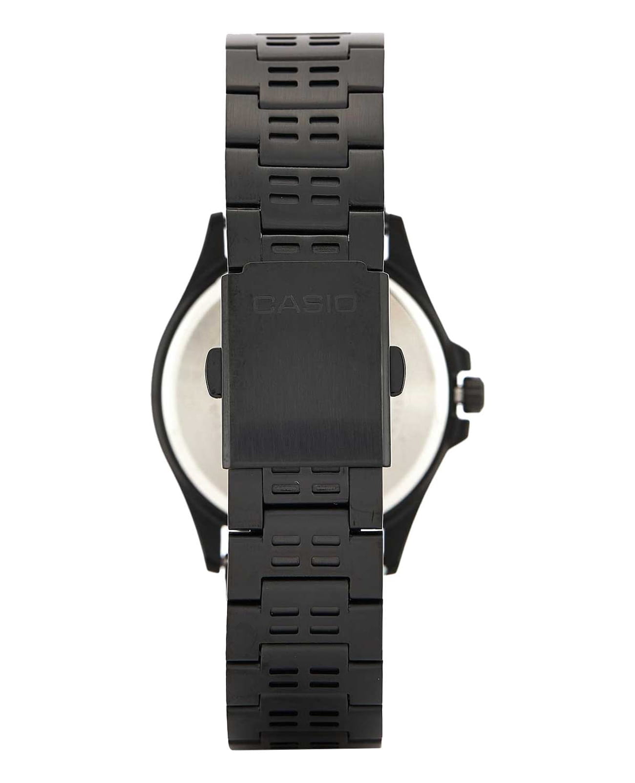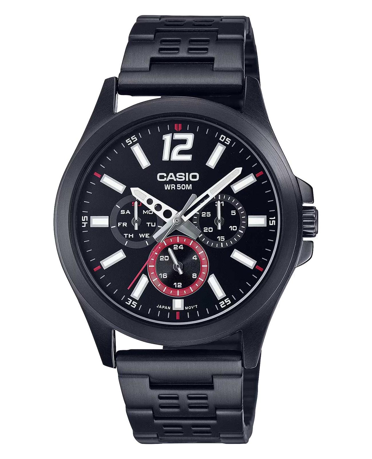 Японские мужские часы с минеральным стекломМинеральное стеклоМинеральное стекло представляет собой искусственно выращенный минерал кварца. Такое стекло отличается особой устойчивостью к повреждениям и царапинам. Уступает по некоторым качествам сапфировому стеклу. Casio Collection MTP-E350B-1B, кварцевый механизм с высокой точностью. Корпус часов изготовлен из стали с IP-покрытиемIP-покрытиеМетод ионного напыления. Демонстрирует повышенную устойчивость к истиранию, окислению и химическим веществам. Под воздействием высокого давления и температуры около 1500°C молекулы металла надёжно соединяются с частицами корпуса часов.. Стрелки и метки с люминесцентным покрытиемЛюминесцентное покрытиеПозволяет считывать показания времени в темноте. Производители наносят на стрелки, часовые индексы, безель или поверхность циферблата светонакопительный состав, дающий холодное свечение.. 12-ти и 24-х часовой формат времени, число и день недели вынесены на отдельные циферблаты. Заводная головка с защитой. Батарея рассчитана на 3 года. Класс водозащиты: 50 метров, позволит защитить корпус от случайных брызг или капель дождя. Стальной браслет с IP-покрытиемIP-покрытиеМетод ионного напыления. Демонстрирует повышенную устойчивость к истиранию, окислению и химическим веществам. Под воздействием высокого давления и температуры около 1500°C молекулы металла надёжно соединяются с частицами корпуса часов. на раскладной застёжкеРаскладная застёжкаТакой тип застёжки используется только на браслетах из металла. Она никогда не раскрывается полностью, происходит разделение на 2 и более частей. Раскладывающая застёжка снизит вероятность потери часов к минимуму..