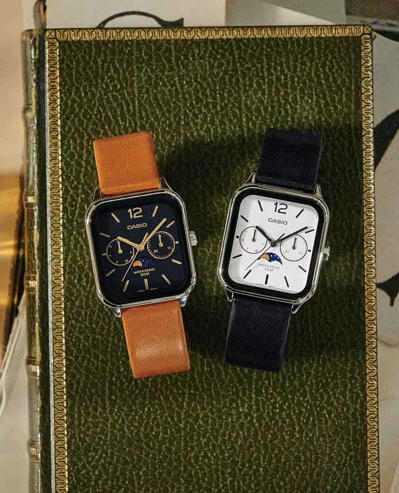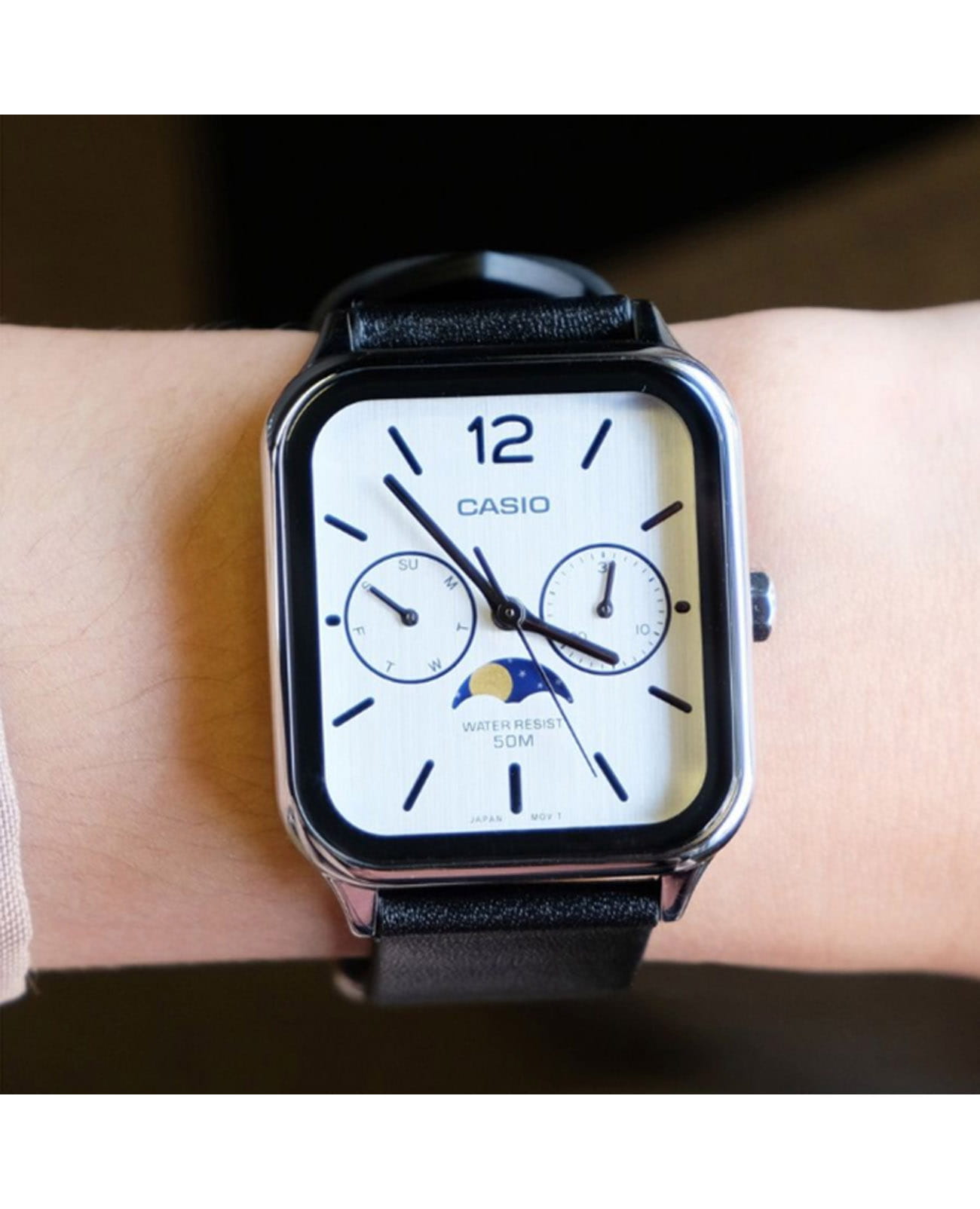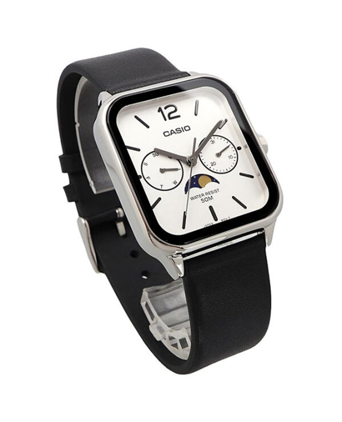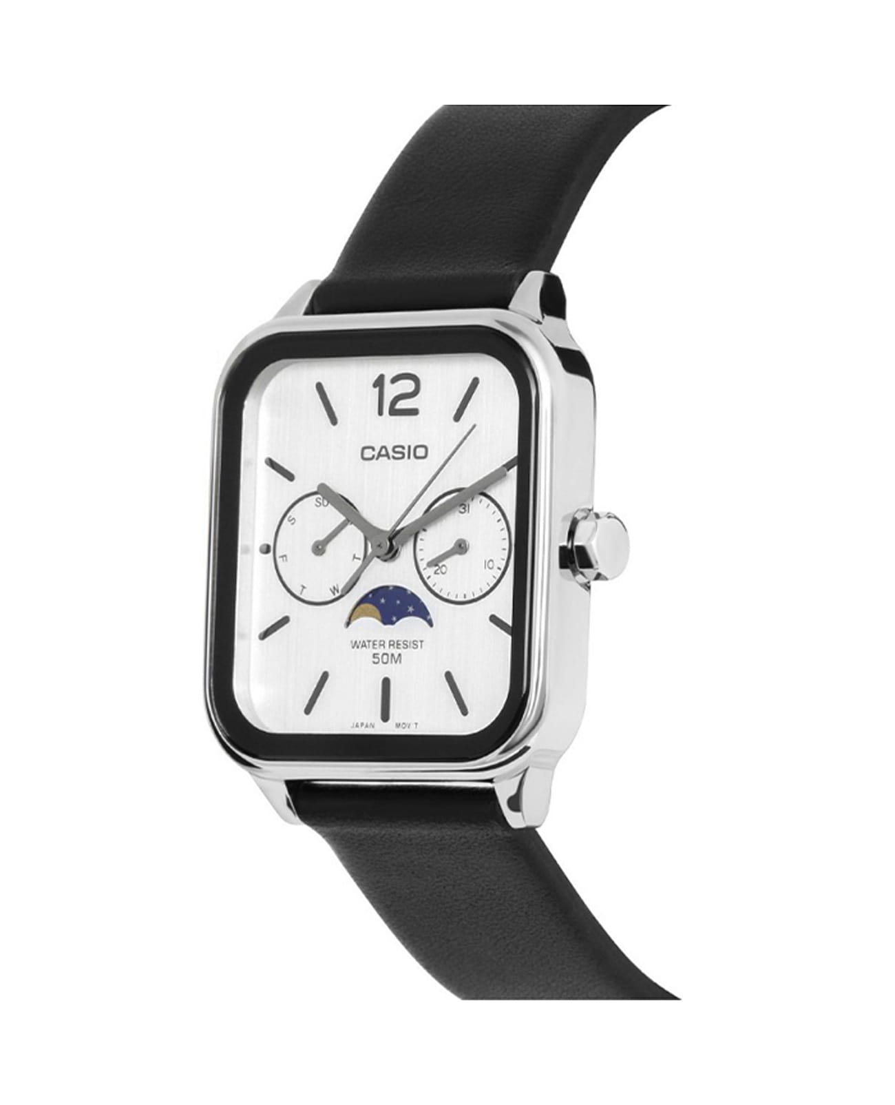 Японские мужские кварцевые часы с минеральным стекломМинеральное стеклоМинеральное стекло представляет собой искусственно выращенный минерал кварца. Такое стекло отличается особой устойчивостью к повреждениям и царапинам. Уступает по некоторым качествам сапфировому стеклу. Casio Collection MTP-M305L-7A, кварцевый механизм с высокой точностью. Корпус часов изготовлен из нержавеющей стали. Циферблат с метками в виде штрихов. Особенностью модели является наличие индикатора фазы луны над шестью часами по циферблату. Индикатор имеет 4 положения и отображается новолуние и полнолуние, а также растущую и убывающую Луну. Батарейка рассчитана на 3 года. Класс водозащиты: 50 метров, позволит защитить корпус от случайных брызг или капель дождя. Кожаный ремешок на стандартной застежке.