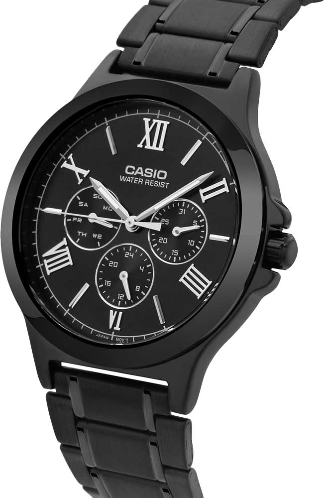 Японские мужские часы с минеральным стекломМинеральное стеклоМинеральное стекло представляет собой искусственно выращенный минерал кварца. Такое стекло отличается особой устойчивостью к повреждениям и царапинам. Уступает по некоторым качествам сапфировому стеклу. Casio CollectionMTP-V300B-1A, кварцевый механизм с высокой точностью. Корпус и браслет часов изготовлены из стали IP-покрытиемIP-покрытиеМетод ионного напыления. Демонстрирует повышенную устойчивость к истиранию, окислению и химическим веществам. Под воздействием высокого давления и температуры около 1500°C молекулы металла надёжно соединяются с частицами корпуса часов.. Люминесцентная подсветкаЛюминесцентное покрытиеПозволяет считывать показания времени в темноте. Производители наносят на стрелки, часовые индексы, безель или поверхность циферблата светонакопительный состав, дающий холодное свечение.. Браслет с раскладной застёжкойРаскладная застёжкаТакой тип застёжки используется только на браслетах из металла. Она никогда не раскрывается полностью, происходит разделение на 2 и более частей. Раскладывающая застёжка снизит вероятность потери часов к минимуму..