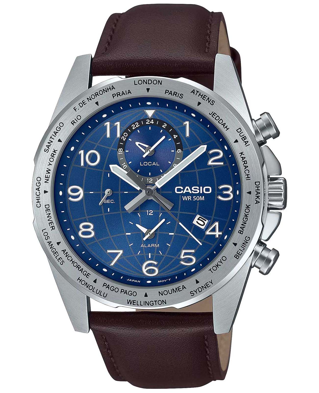 Японские мужские часы-хронографХронографФункция позволяет измерять отрезки времени с особой точностью: часы, минуты, секунды. Верным признаком хронографа является наличие на циферблате 3 дополнительных окошек-счётчиков. с секундомеромСекундомерСекундоме́р — прибор, способный измерять интервалы времени с точностью до долей секунды. Casio Collection MTP-W500L-2A, кварцевый механизм с высокой точностью. Класс водозащиты: 50 метров, позволит защитить корпус от случайных брызг или капель дождя. Корпус и браслет часов изготовлены из стали. Удобное отображение времени домашнего часового пояса и мирового времениМировое время Полезное часовое усложнение, отображающее время в основных городах и известных областях по всему миру, оно связано с часовыми поясами, удобно для путешественников и бизнесменов. (24 города - 24 зоны) позволяет ориентироваться при путешествиях. Кожаный ремешок на стандартной застёжке. БудильникБудильникБуди́льник — часы, в заданный момент времени подающие звуковой, световой и/или в редких случаях другой сигнал./ежечасный сигнал. Минеральное стеклоМинеральное стеклоМинеральное стекло представляет собой искусственно выращенный минерал кварца. Такое стекло отличается особой устойчивостью к повреждениям и царапинам. Уступает по некоторым качествам сапфировому стеклу. устойчивое к мелким механическим повреждениям. Центральные часовая, минутная и секундная стрелки. Индикатор низкого заряда батареи. Синий циферблат с часовыми индексами в виде штрихов и цифр. Стрелки и метки с люминесцентным покрытиемЛюминесцентное покрытиеПозволяет считывать показания времени в темноте. Производители наносят на стрелки, часовые индексы, безель или поверхность циферблата светонакопительный состав, дающий холодное свечение..