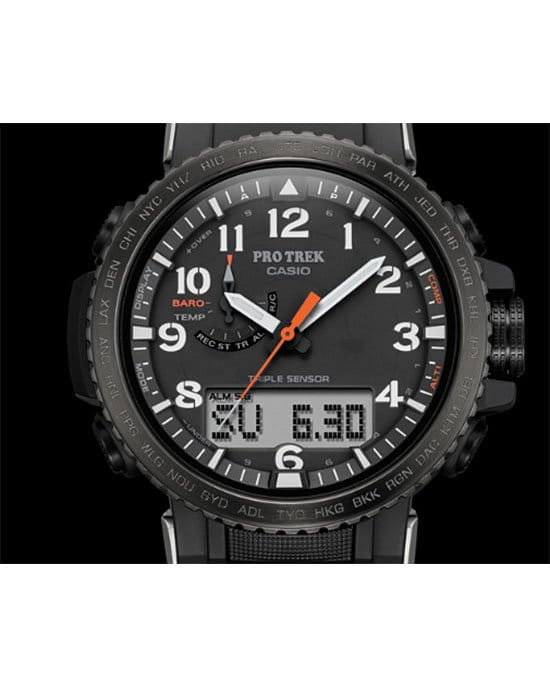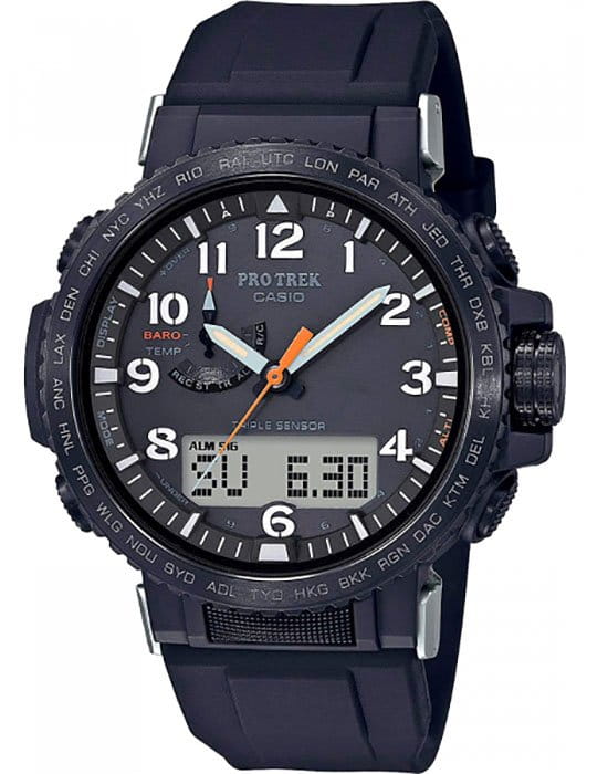 Аксессуар в спортивном стиле станет неотъемлемой частью экипировки опытного туриста, ведь он обладает полезными часовыми усложнениями. Выделяют барометр, цифровой компас, таймер обратного отсчёта, датчик измерения температуры окружающего воздуха -10°C /+60°C, высотомер с памятью данных, мировое времяМировое время Полезное часовое усложнение, отображающее время в основных городах и известных областях по всему миру, оно связано с часовыми поясами, удобно для путешественников и бизнесменов. , приём радиосигнала для настройки точного времени, хронографХронографФункция позволяет измерять отрезки времени с особой точностью: часы, минуты, секунды. Верным признаком хронографа является наличие на циферблате 3 дополнительных окошек-счётчиков., календарь. Японский кварцевый механизм получает энергию для работы от солнечной батареи – технология . Индикатор уровня заряда батареи. Минеральное стекло. Стальной безельБезельВнешний ободок, закрепляющий стекло. В спортивных часах так называется поворотное кольцо с делениями на циферблате, выполняет роль таймера – замеряет отрезки времени на шкале. Неподвижный безель – элемент декора. Однонаправленно вращающийся безель на дайверских часах позволяет фиксировать моменты погружения и выныривания на поверхность. с IP-покрытиемIP-покрытиеМетод ионного напыления. Демонстрирует повышенную устойчивость к истиранию, окислению и химическим веществам. Под воздействием высокого давления и температуры около 1500°C молекулы металла надёжно соединяются с частицами корпуса часов., устойчивым к износу. Аналоговый циферблат и дисплей со светодиодной подсветкойСветодиодная подсветкаСветодиодная или LED-подсветка обеспечивает появление яркого холодного свечения за счёт LED-элементов - маленьких лампочек. Они потребляют минимальное количество энергии, чаще всего можно встретить 1 светодиод, в нижней части циферблата.. Стрелки с подсветкой NeobriteПодсветка NeobriteИспользование светонакопительных составов на основе сульфида цинка или алюмината стронция, яркий свет можно наблюдать на протяжении 6-10 часов после «зарядки» часов около источника света.. Пластиковый ударопрочный корпусУдаропрочный корпусМеханизм заключён в корпус, выполненный из современных материалов, устойчивых к ударам, механическим повреждениям и падению с высоты: инновационный пластик, карбон, нержавеющая сталь, титан. и браслет. Водостойкость до 10 бар. Габариты: 50,5 x 47,2 x 13,3 мм.
