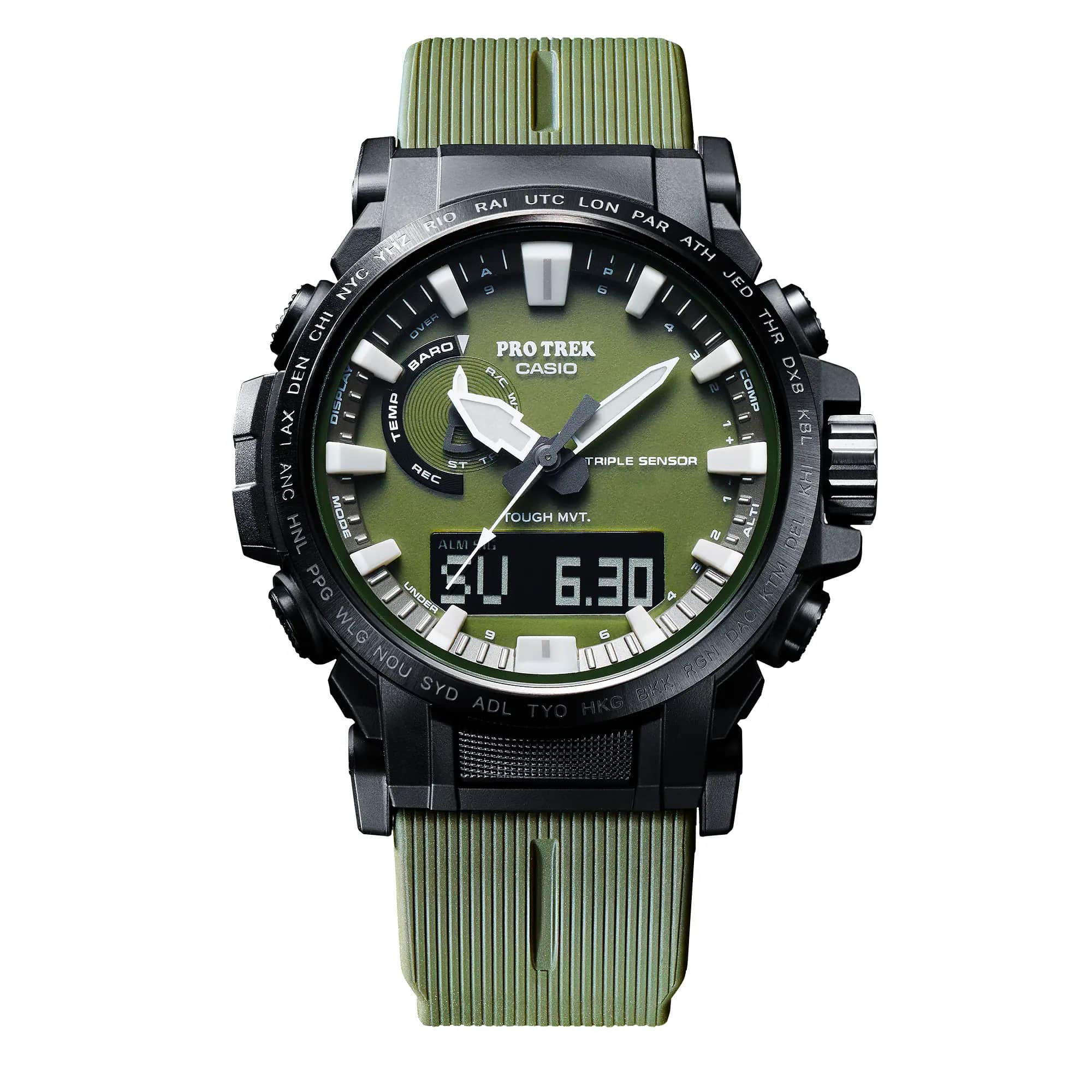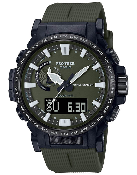 Флагманский аксессуар с аналого-цифровым дисплеем. Ни одна туристическая вылазка не обойдётся без этих часов, ведь они оснащены барометром, термометром -10°C /+60°C, альтиметром, цифровым компасом, хронографомХронографФункция позволяет измерять отрезки времени с особой точностью: часы, минуты, секунды. Верным признаком хронографа является наличие на циферблате 3 дополнительных окошек-счётчиков., таймером, функцией мирового времениМировое время Полезное часовое усложнение, отображающее время в основных городах и известных областях по всему миру, оно связано с часовыми поясами, удобно для путешественников и бизнесменов. – 29 часовых поясов и UTCUTCВсемирное кординационное время, не имеющее привязки к географическому положению Гринвича, основывается на атомном отсчёте времени. Регулировка времени осуществляется более точно, чем устаревшее GMT.