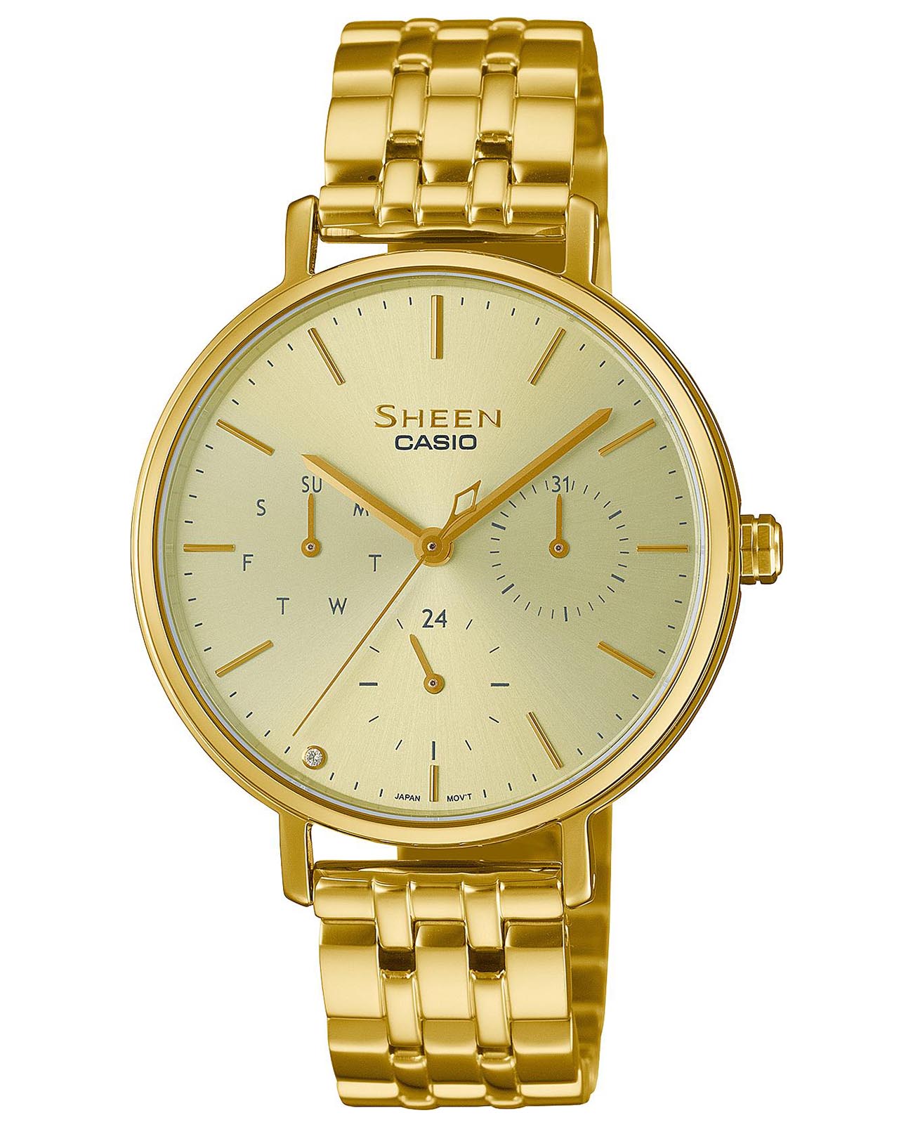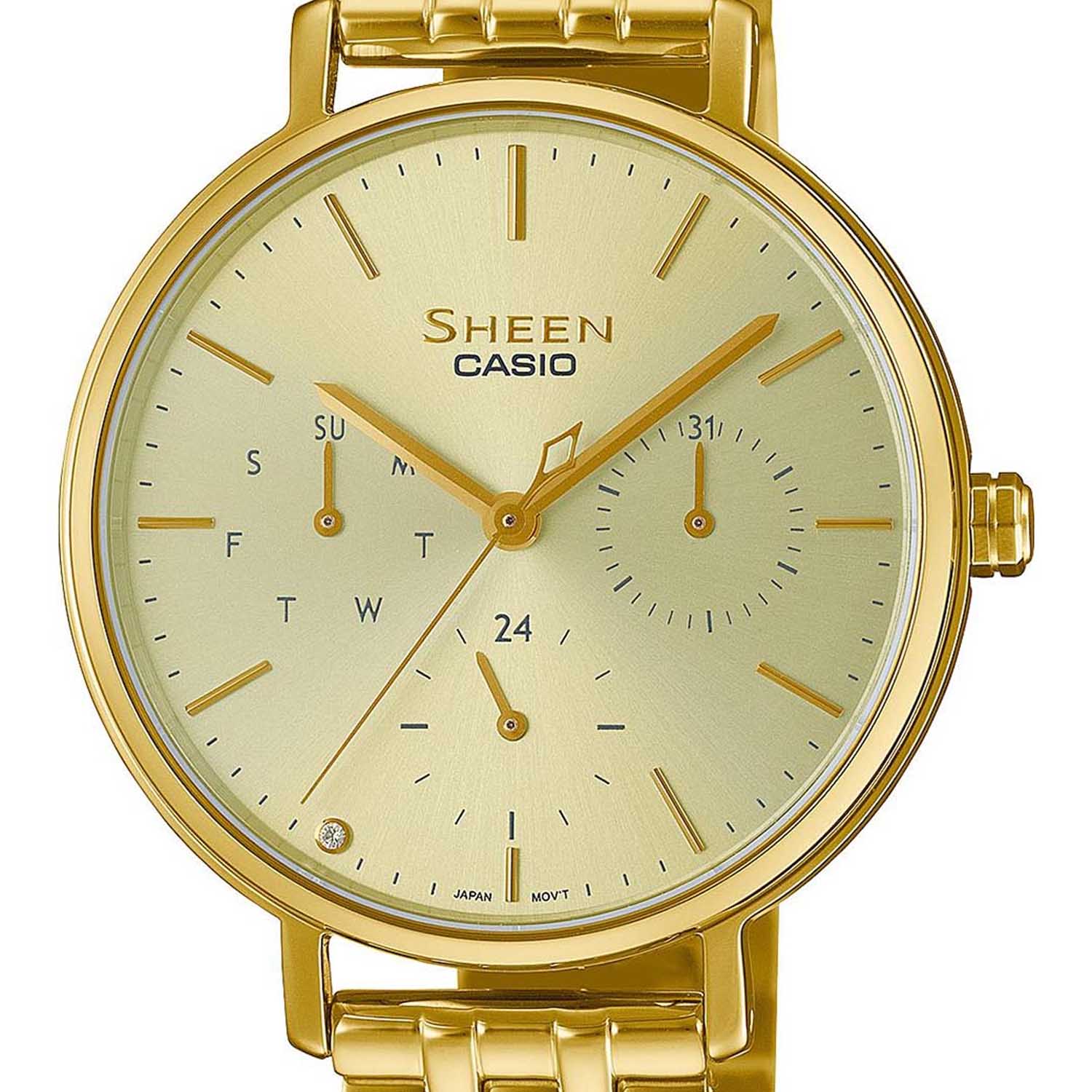 Японские женские часы Casio Sheen SHE-4541G-9A, кварцевый механизм с высокой точностью. Сапфировое стеклоСапфировое стеклоПрочный и надёжный материал из кристалла сапфира синтетического происхождения, характеризующийся особой твёрдостью и устойчивостью к царапинам и повреждениям. устойчивое к появлению царапин, обладающее высокой прозрачностью. Класс водозащиты: 50 метров, позволит защитить корпус от случайных брызг или капель дождя. Корпус и браслет часов изготовлены из стали с IP-покрытиемIP-покрытиеМетод ионного напыления. Демонстрирует повышенную устойчивость к истиранию, окислению и химическим веществам. Под воздействием высокого давления и температуры около 1500°C молекулы металла надёжно соединяются с частицами корпуса часов.. 12-ти и 24-х часовой формат времени, число и день недели отображаются на отдельных циферблатах. Метки в виде штрихов. Браслет с раскладной застёжкойРаскладная застёжкаТакой тип застёжки используется только на браслетах из металла. Она никогда не раскрывается полностью, происходит разделение на 2 и более частей. Раскладывающая застёжка снизит вероятность потери часов к минимуму..