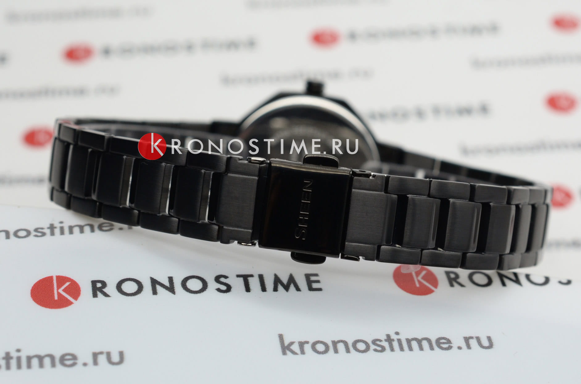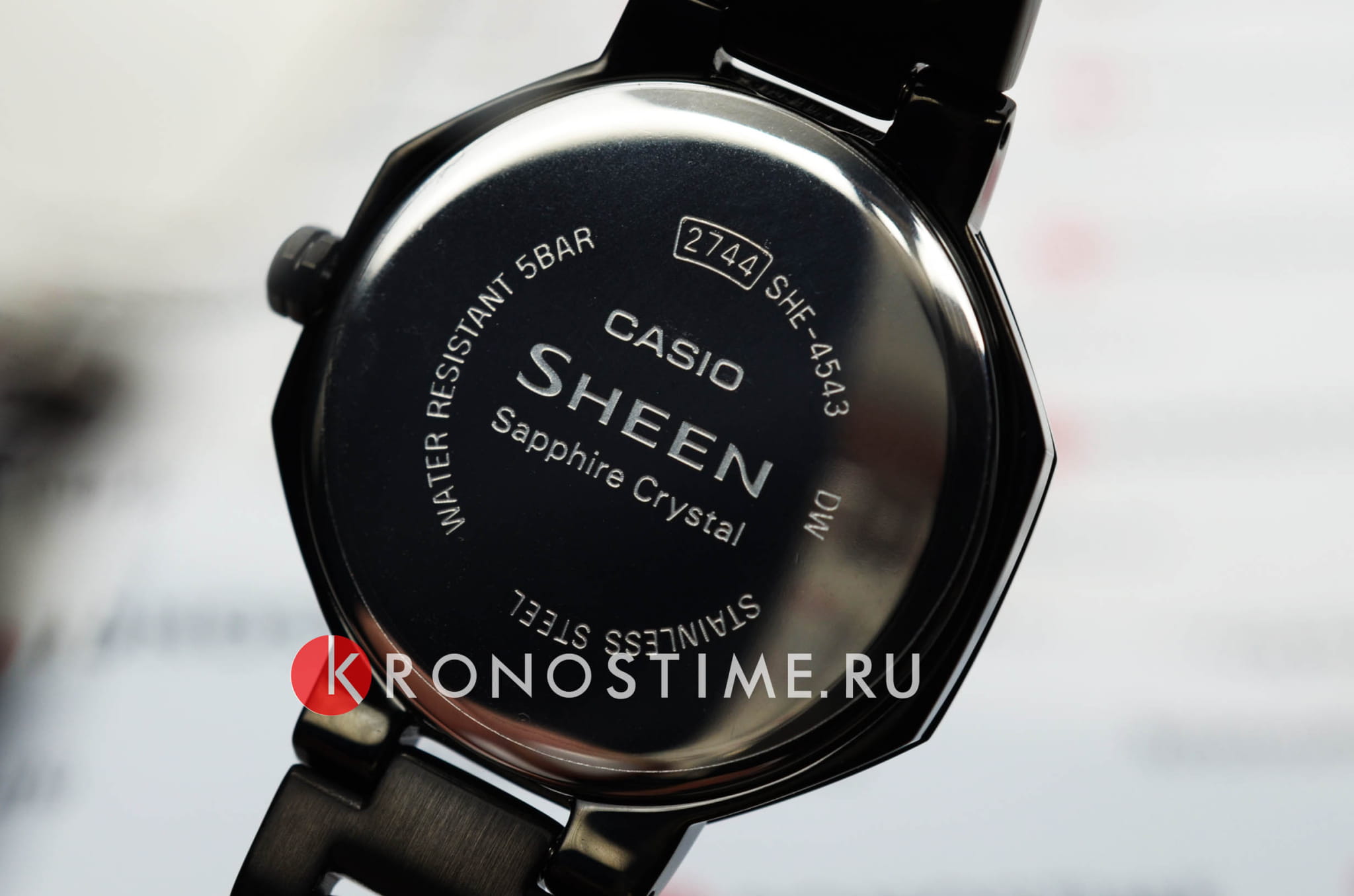 Японские женские часы с минеральным стекломМинеральное стеклоМинеральное стекло представляет собой искусственно выращенный минерал кварца. Такое стекло отличается особой устойчивостью к повреждениям и царапинам. Уступает по некоторым качествам сапфировому стеклу. Casio Sheen SHE-4543BD-1AUER, кварцевый механизм с высокой точностью. Класс водозащиты: 50 метров, позволит защитить корпус от случайных брызг или капель дождя. Корпус часов изготовлен из стали с IP-покрытиемIP-покрытиеМетод ионного напыления. Демонстрирует повышенную устойчивость к истиранию, окислению и химическим веществам. Под воздействием высокого давления и температуры около 1500°C молекулы металла надёжно соединяются с частицами корпуса часов.. Раскладная застёжкаРаскладная застёжкаТакой тип застёжки используется только на браслетах из металла. Она никогда не раскрывается полностью, происходит разделение на 2 и более частей. Раскладывающая застёжка снизит вероятность потери часов к минимуму. с фиксатором.