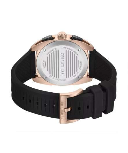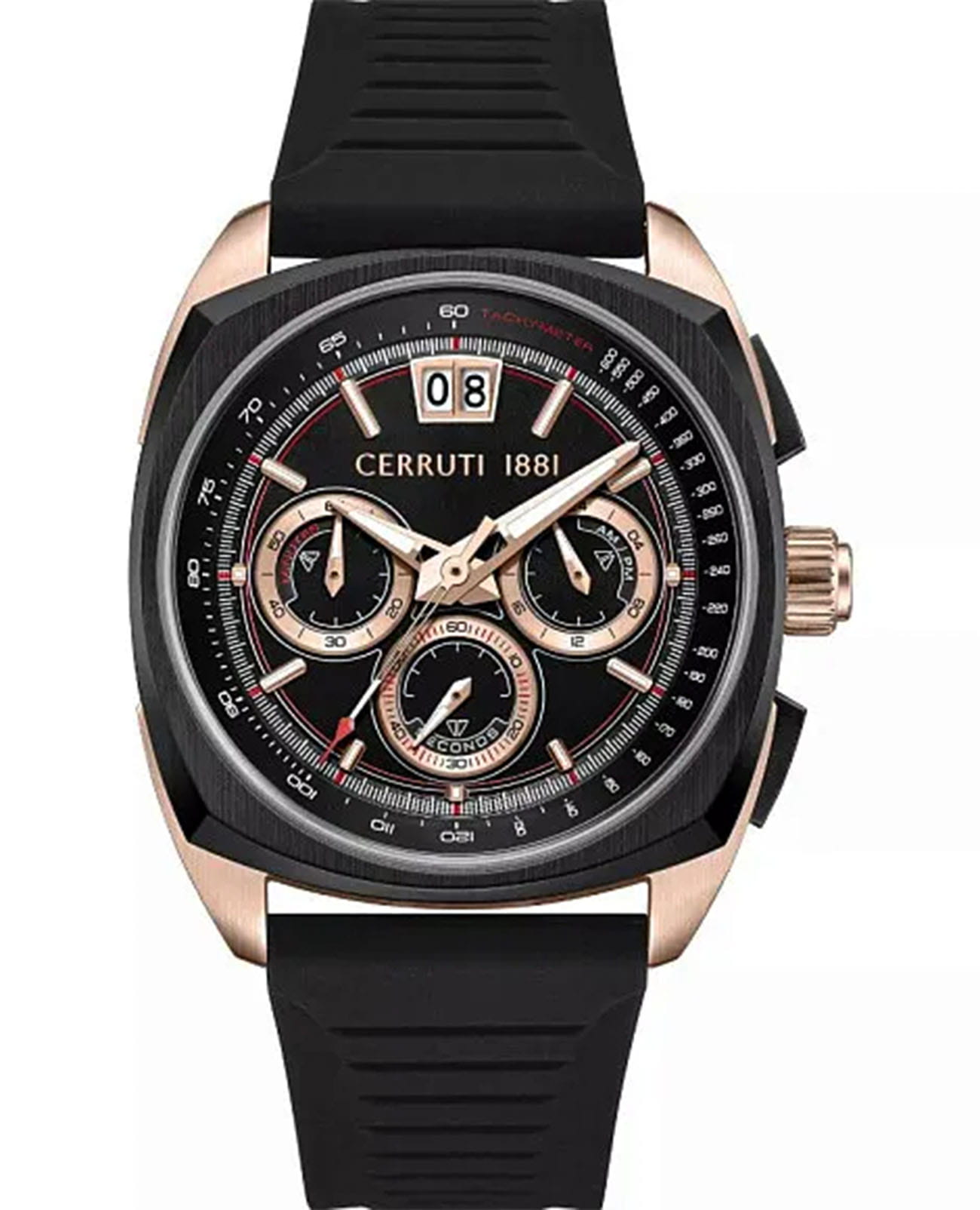 Мужские кварцевые часы Cerruti 1881 Cuneo CIWGO0085102 — спортивный аксессуар с французским дизайном и расширенным функционалом. Корпус из нержавеющей стали 316L с IP-покрытиемIP-покрытиеМетод ионного напыления. Демонстрирует повышенную устойчивость к истиранию, окислению и химическим веществам. Под воздействием высокого давления и температуры около 1500°C молекулы металла надёжно соединяются с частицами корпуса часов., размером 41.3 мм. Циферблат — чёрный с золотыми элементами, с штриховыми метками и окошком даты в положении 12 часов. Стекло — минеральноеМинеральное стеклоМинеральное стекло представляет собой искусственно выращенный минерал кварца. Такое стекло отличается особой устойчивостью к повреждениям и царапинам. Уступает по некоторым качествам сапфировому стеклу. с сапфировым покрытием. Стрелки и метки с люминесцентным покрытиемЛюминесцентное покрытиеПозволяет считывать показания времени в темноте. Производители наносят на стрелки, часовые индексы, безель или поверхность циферблата светонакопительный состав, дающий холодное свечение.. Функции: хронографХронографФункция позволяет измерять отрезки времени с особой точностью: часы, минуты, секунды. Верным признаком хронографа является наличие на циферблате 3 дополнительных окошек-счётчиков., тахиметрТахиметрРазмеченная шкала, располагается на ободке или безеле часов. Тахиметр позволяет рассчитать скорость на определённом участке пути, расстояние измеряется в километрах или милях., секундомер. Ремешок — чёрный силиконовый на стандартной застёжке. Водонепроницаемость 50 м. Идеальный выбор для тех, кто ценит французский дизайн и спортивный стиль.