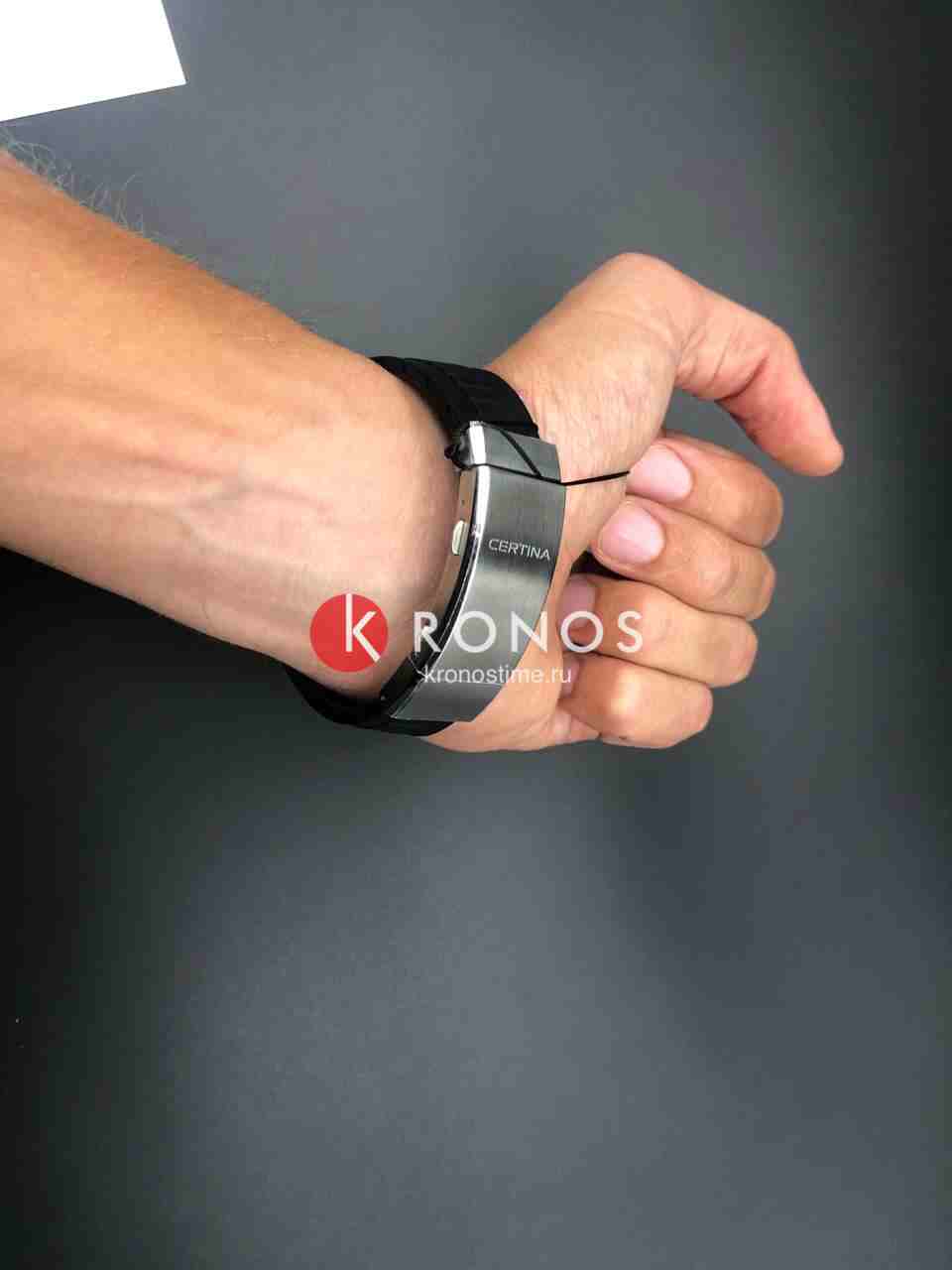 Наручные часы отличаются привлекательным дизайном, чёрный циферблат имеет крупную индикацию времени, расставлены акценты красного цвета. Модель комплектуется кварцевым механизмом ETA Precidrive™Precidrive™Инновационный кварцевый механизм Certina. Часы, оснащённые этим швейцарским калибром, приравниваются к точности к сертифицированным хронометрам, точность хода составляет +/-10 секунд в год., отличающимся отменной точностью хода. Вращающийся безельБезельВнешний ободок, закрепляющий стекло. В спортивных часах так называется поворотное кольцо с делениями на циферблате, выполняет роль таймера – замеряет отрезки времени на шкале. Неподвижный безель – элемент декора. Однонаправленно вращающийся безель на дайверских часах позволяет фиксировать моменты погружения и выныривания на поверхность. имеет чёрное PVD-покрытиеPVDУльтратонкое покрытие наносится в технике вакуумного напыления, сочетает в себе нитрид титана особой прочности со слоем золота или оксида хрома. Несёт в себе декоративную или защитную функцию., защищающее от царапин. Сапфировое стекло с антибликовой обработкой. Силиконовый ремешок. Индикатор EOLEOLПредставляет собой систему, уведомляющую владельца часов о необходимости замены элемента питания. За 2 недели до полного разряда батарейки секундная стрелка перестаёт ходить чётко и начинает перепрыгивать на 3-4 деления.. Секундомер, хронографХронографФункция позволяет измерять отрезки времени с особой точностью: часы, минуты, секунды. Верным признаком хронографа является наличие на циферблате 3 дополнительных окошек-счётчиков., окошко даты. Диаметр корпуса: 43 мм.