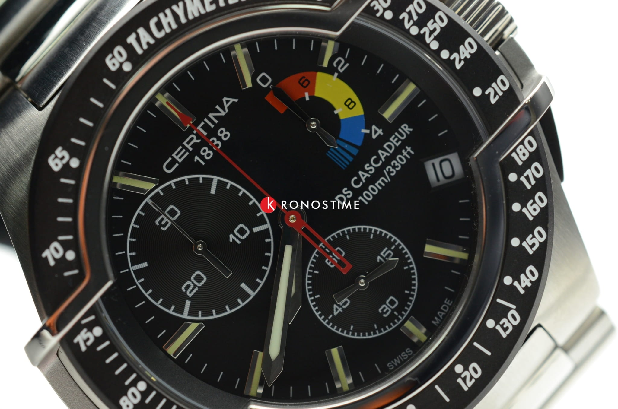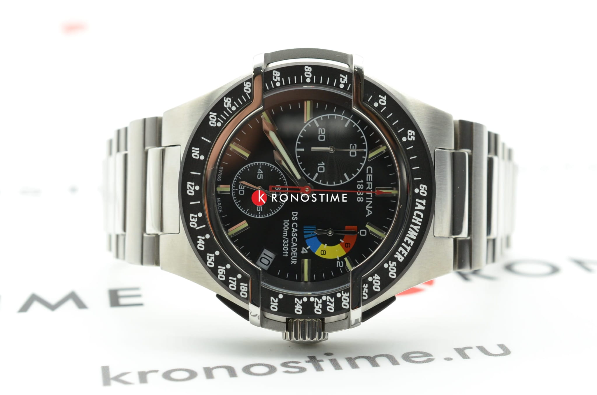 Надёжный корпус основан на концепции Двойной Надёжности DSDS ConceptDouble Security Concept, обозначает двойную надёжность и безупречную точность часов Certina. Двойная система защиты подразумевает обеспечение максимальной устойчивости к ударам и высоких показателей водонепроницаемости., выполнен из стали 316L с частичным PVD-финишемPVDУльтратонкое покрытие наносится в технике вакуумного напыления, сочетает в себе нитрид титана особой прочности со слоем золота или оксида хрома. Несёт в себе декоративную или защитную функцию.. Модель оснащена тахиметромТахиметрРазмеченная шкала, располагается на ободке или безеле часов. Тахиметр позволяет рассчитать скорость на определённом участке пути, расстояние измеряется в километрах или милях., секундомером, календарём, хронографомХронографФункция позволяет измерять отрезки времени с особой точностью: часы, минуты, секунды. Верным признаком хронографа является наличие на циферблате 3 дополнительных окошек-счётчиков.. Работу часов обеспечивает швейцарский кварцевый калибр ETA G10.211.