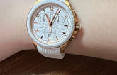 Устойчивое к появлению царапин сапфировое стекло, водозащита до 100м. Безель выполнен из керамики.