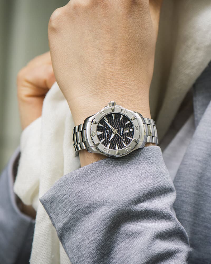 Компактный циферблат дополнен необычным узором в виде волн с блестящими акцентами, что стало выражением любви бренда Certina к морской стихии. Изящный аксессуар внутри просто «кремень», чему способствует система DS ConceptDS ConceptDouble Security Concept, обозначает двойную надёжность и безупречную точность часов Certina. Двойная система защиты подразумевает обеспечение максимальной устойчивости к ударам и высоких показателей водонепроницаемости.: водонепроницаемость 300 метров, завинчивающаяся задняя крышка и заводная головка с системой блокировки, сапфировое стекло, хирургическая сталь 316L. Швейцарский кварцевый механизм ETA F04.411 Precidrive™Precidrive™Инновационный кварцевый механизм Certina. Часы, оснащённые этим швейцарским калибром, приравниваются к точности к сертифицированным хронометрам, точность хода составляет +/-10 секунд в год. отмечен сертификатом хронометра COSCСертификат COSCОфициальный сертификат, подтверждающий то, что часы ходят с особо высокой точностью. Для получения документа часы подвергаются тестовым испытаниям, разработанным швейцарским институтом тестирования хронометров COSC. Допустимая норма для механических часов -4/+6 секунд в день, для кварцевых моделей +/- 0,07 секунд в день. за безупречную точность хода. Вращающийся безельБезельВнешний ободок, закрепляющий стекло. В спортивных часах так называется поворотное кольцо с делениями на циферблате, выполняет роль таймера – замеряет отрезки времени на шкале. Неподвижный безель – элемент декора. Однонаправленно вращающийся безель на дайверских часах позволяет фиксировать моменты погружения и выныривания на поверхность.. Яркая люминесцентная подсветкаЛюминесцентное покрытиеПозволяет считывать показания времени в темноте. Производители наносят на стрелки, часовые индексы, безель или поверхность циферблата светонакопительный состав, дающий холодное свечение.. Апертура даты, функция EOLEOLПредставляет собой систему, уведомляющую владельца часов о необходимости замены элемента питания. За 2 недели до полного разряда батарейки секундная стрелка перестаёт ходить чётко и начинает перепрыгивать на 3-4 деления.. Диаметр корпуса: 34 мм.