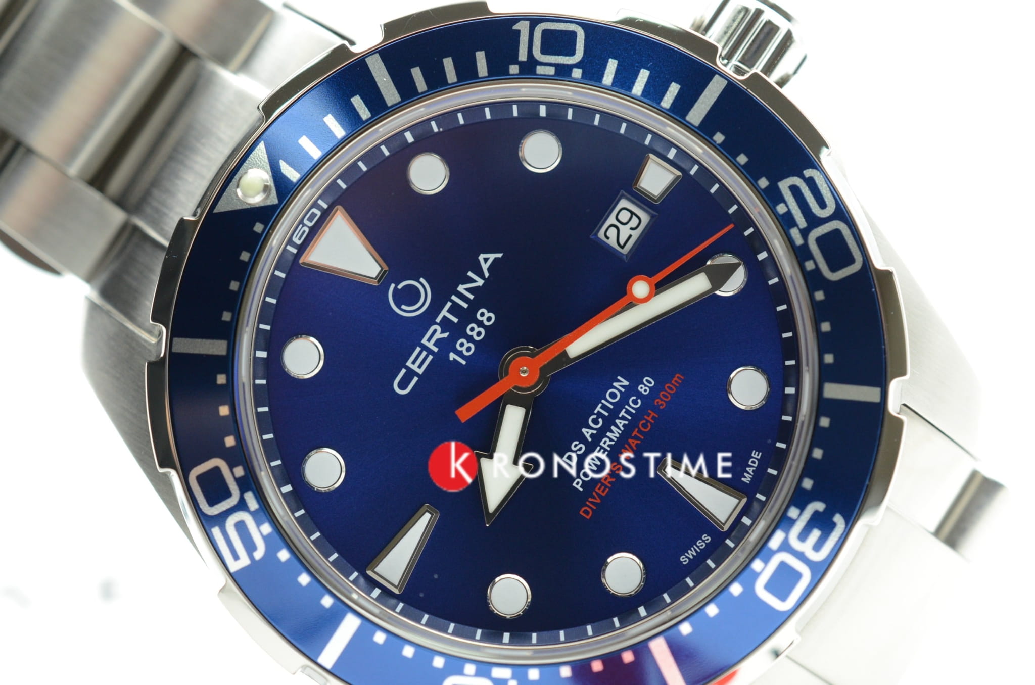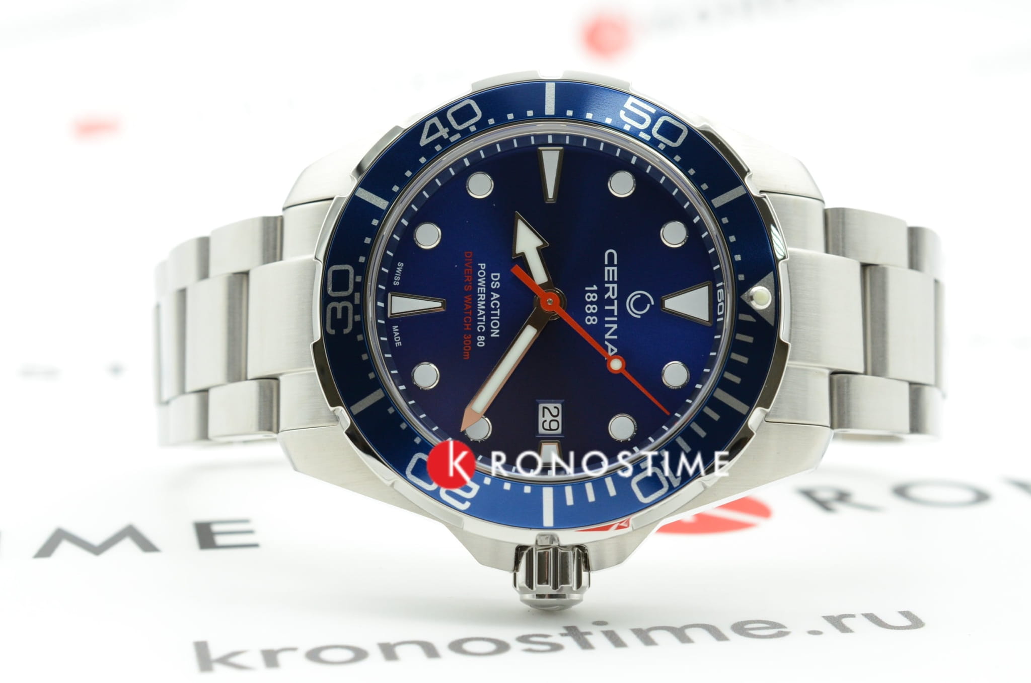 Серебристый аксессуар с синим циферблатом подходит для создания яркого акцента для делового образа. Красная секундная стрелка и крупные метки обеспечивают превосходную читаемость показаний времени. Автоподзавод. Швейцарский калибр ETA Powermatic 80Powermatic 80Эксклюзивный калибр от швейцарской компании ETA с увеличенным запасом хода до 80 часов за счёт удлинённой заводной пружины. Характеризуется улучшенной системой спуска со сниженным трением. с 80-часовым запасом хода. Реализация системы DS ConceptDS ConceptDouble Security Concept, обозначает двойную надёжность и безупречную точность часов Certina. Двойная система защиты подразумевает обеспечение максимальной устойчивости к ударам и высоких показателей водонепроницаемости.. Сапфировое стекло. Вращающийся безельБезельВнешний ободок, закрепляющий стекло. В спортивных часах так называется поворотное кольцо с делениями на циферблате, выполняет роль таймера – замеряет отрезки времени на шкале. Неподвижный безель – элемент декора. Однонаправленно вращающийся безель на дайверских часах позволяет фиксировать моменты погружения и выныривания на поверхность. из лёгкого алюминия. Водонепроницаемость 300 метров. Люминесцентная подсветкаЛюминесцентное покрытиеПозволяет считывать показания времени в темноте. Производители наносят на стрелки, часовые индексы, безель или поверхность циферблата светонакопительный состав, дающий холодное свечение.. Корпус и браслет из нержавеющей стали 316L. Застёжка с фиксатором и удлинением для дайверовУдлинение для дайверовЗастёжка с удлинением для дайверов представляет собой безопасное крепление, которое позволяет надевать часы поверх гидрокостюма. Гибкая застёжка удлиняется на 1-2 миллиметра.. Апертура даты. Диаметр корпуса: 43 мм.