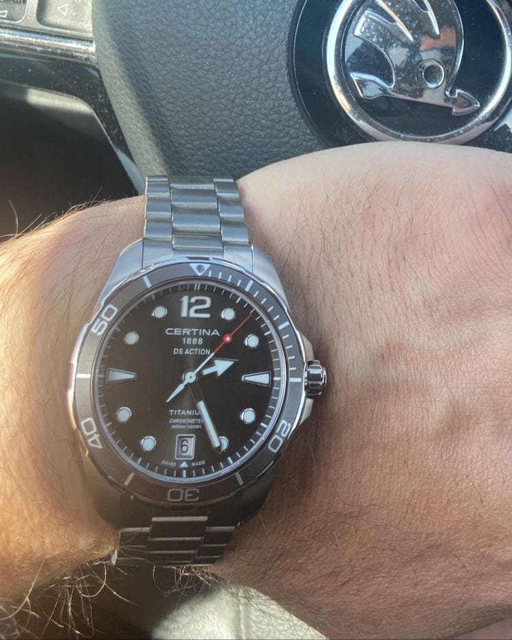 Брендовый аксессуар с антрацитовым циферблатом - идеальное дополнение как к деловому, так и к повседневному стилю. Модель отличается предельной точностью швейцарского кварцевого механизма ETA F07.412 Precidrive™Precidrive™Инновационный кварцевый механизм Certina. Часы, оснащённые этим швейцарским калибром, приравниваются к точности к сертифицированным хронометрам, точность хода составляет +/-10 секунд в год., что подтверждается официальным сертификатом COSCСертификат COSCОфициальный сертификат, подтверждающий то, что часы ходят с особо высокой точностью. Для получения документа часы подвергаются тестовым испытаниям, разработанным швейцарским институтом тестирования хронометров COSC. Допустимая норма для механических часов -4/+6 секунд в день, для кварцевых моделей +/- 0,07 секунд в день.. Высокое качество проявляет себя невооружённым глазом: титановый ударопрочный корпусУдаропрочный корпусМеханизм заключён в корпус, выполненный из современных материалов, устойчивых к ударам, механическим повреждениям и падению с высоты: инновационный пластик, карбон, нержавеющая сталь, титан. с антимагнитными свойствами, водонепроницаемость до 30 бар, сапфировое стекло, устойчивое к образованию царапин, реализация фирменной разработки DS Concept DS ConceptDouble Security Concept, обозначает двойную надёжность и безупречную точность часов Certina. Двойная система защиты подразумевает обеспечение максимальной устойчивости к ударам и высоких показателей водонепроницаемости.. Завинчивающаяся заводная головка с защитой. Закручивающиеся кнопки и задняя крышка. Одностороннее антибликовое покрытие для стекла. Вращающийся безельБезельВнешний ободок, закрепляющий стекло. В спортивных часах так называется поворотное кольцо с делениями на циферблате, выполняет роль таймера – замеряет отрезки времени на шкале. Неподвижный безель – элемент декора. Однонаправленно вращающийся безель на дайверских часах позволяет фиксировать моменты погружения и выныривания на поверхность.. Отображение текущего числа. Индикатор EOLEOLПредставляет собой систему, уведомляющую владельца часов о необходимости замены элемента питания. За 2 недели до полного разряда батарейки секундная стрелка перестаёт ходить чётко и начинает перепрыгивать на 3-4 деления.. Дайверская застёжка с фиксатором и специальным удлинениемУдлинение для дайверовЗастёжка с удлинением для дайверов представляет собой безопасное крепление, которое позволяет надевать часы поверх гидрокостюма. Гибкая застёжка удлиняется на 1-2 миллиметра.. Диаметр корпуса: 43 мм.