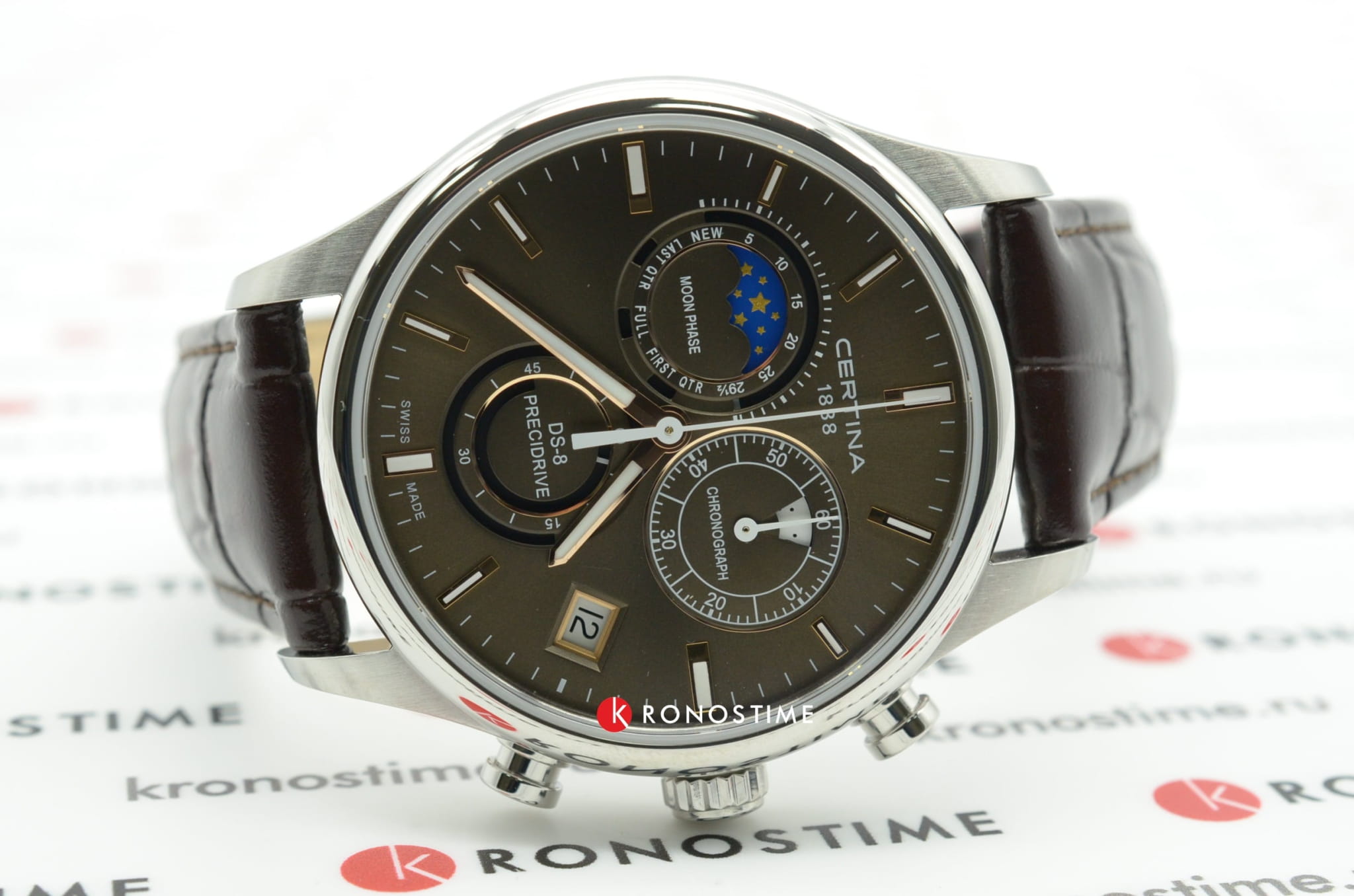 Модель, благодаря классической цветовой гамме и отсутствию броских деталей, станет универсальным аксессуаром к вашему образу. Брендовый хронографХронографФункция позволяет измерять отрезки времени с особой точностью: часы, минуты, секунды. Верным признаком хронографа является наличие на циферблате 3 дополнительных окошек-счётчиков. измеряет время с высокой точностью, что обеспечивает швейцарский кварцевый калибр ETA G10.962 Precidrive™Precidrive™Инновационный кварцевый механизм Certina. Часы, оснащённые этим швейцарским калибром, приравниваются к точности к сертифицированным хронометрам, точность хода составляет +/-10 секунд в год.. Коричневый ремешок из натуральной кожи. Сапфировое стекло с двухсторонним антибликовым покрытием. Корпус из нержавеющей стали 316L. Водостойкость 10 бар. Люминесцентная подсветкаЛюминесцентное покрытиеПозволяет считывать показания времени в темноте. Производители наносят на стрелки, часовые индексы, безель или поверхность циферблата светонакопительный состав, дающий холодное свечение.. Задняя крышка с гравировкой. Секундомер, дата, индикатор EOLEOLПредставляет собой систему, уведомляющую владельца часов о необходимости замены элемента питания. За 2 недели до полного разряда батарейки секундная стрелка перестаёт ходить чётко и начинает перепрыгивать на 3-4 деления., отображение лунных фаз. Диаметр корпуса: 41 мм.