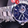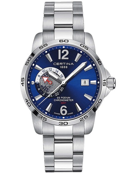 Аксессуар имеет ярко-синий циферблат, дополненный крупной индикацией времени. Оригинально смотрится функциональный счётчик, обеспечивающий индикацию часовых поясов. Корпус и браслет изготовлены из нержавеющей стали 316L, материал высоко ценится за долговечность и устойчивость к царапинам. Швейцарский кварцевый механизм ETA Precidrive™Precidrive™Инновационный кварцевый механизм Certina. Часы, оснащённые этим швейцарским калибром, приравниваются к точности к сертифицированным хронометрам, точность хода составляет +/-10 секунд в год., в 8-10 раз более точен, чем обычные кварцевые часы, это официально подтверждено сертификатом хронометра COSCСертификат COSCОфициальный сертификат, подтверждающий то, что часы ходят с особо высокой точностью. Для получения документа часы подвергаются тестовым испытаниям, разработанным швейцарским институтом тестирования хронометров COSC. Допустимая норма для механических часов -4/+6 секунд в день, для кварцевых моделей +/- 0,07 секунд в день.. Одностороннее антибликовое покрытие сапфирового стекла. Заводная головка с защитой. Люминесцентная подсветкаЛюминесцентное покрытиеПозволяет считывать показания времени в темноте. Производители наносят на стрелки, часовые индексы, безель или поверхность циферблата светонакопительный состав, дающий холодное свечение.. Водонепроницаемость 100 метров. . Календарь, функция GMTGMTОтображение времени второго часового пояса.Такая функция особенно актуальна для путешественников и бизнесменов,которые общаются с людьми из разных стран,теперь вы всегда будете знать,какой час у вашего партнёра или близкого человека., индикатор EOLEOLПредставляет собой систему, уведомляющую владельца часов о необходимости замены элемента питания. За 2 недели до полного разряда батарейки секундная стрелка перестаёт ходить чётко и начинает перепрыгивать на 3-4 деления.. Диаметр корпуса: 43 мм.