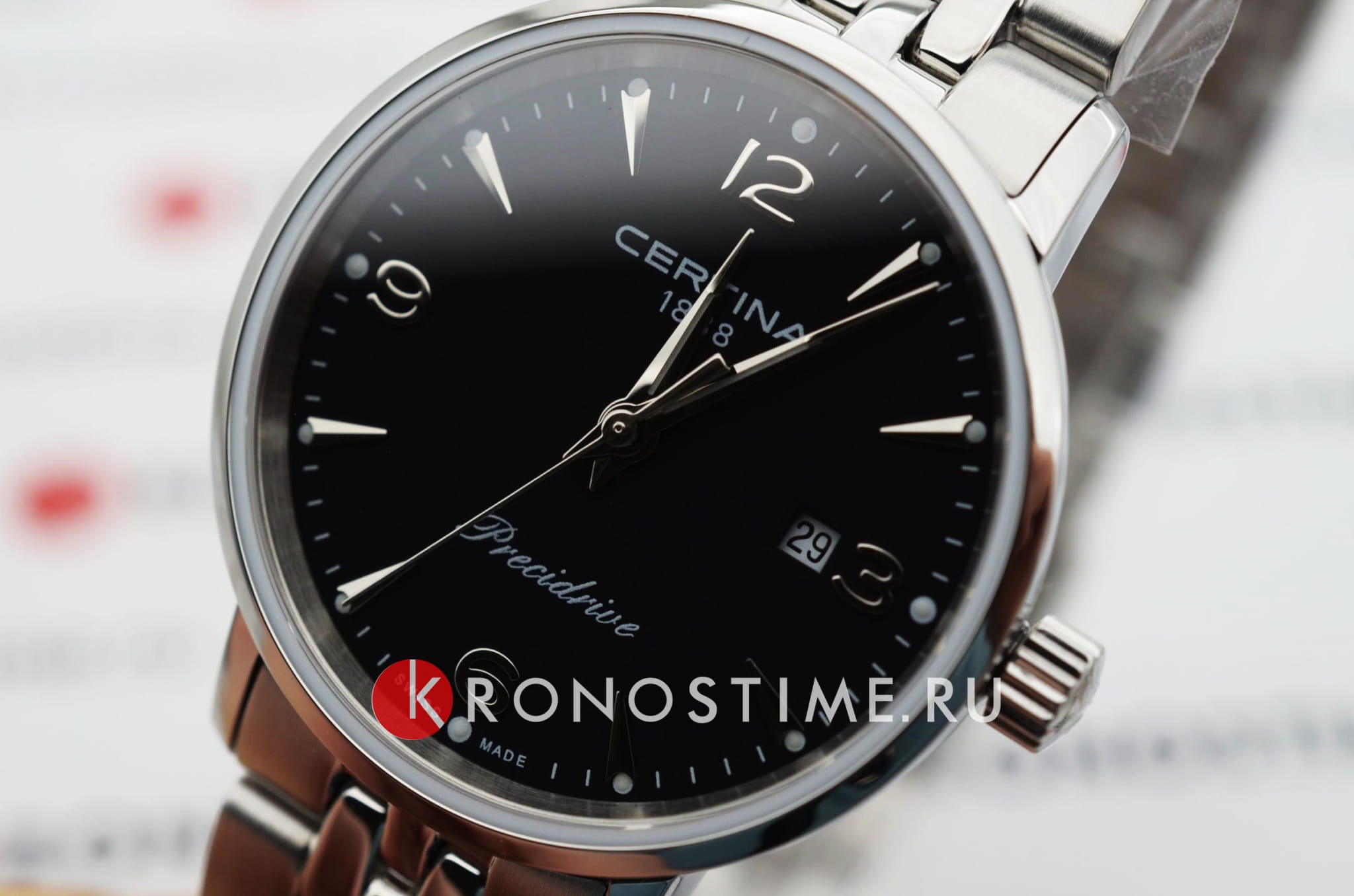 Классический дизайн всегда актуален. Швейцарский кварцевый калибр ETA F03.411 Precidrive™Precidrive™Инновационный кварцевый механизм Certina. Часы, оснащённые этим швейцарским калибром, приравниваются к точности к сертифицированным хронометрам, точность хода составляет +/-10 секунд в год.. Сапфировое стекло сапфира с антибликовым покрытием. Водозащита WR 100. Корпус и браслет из нержавеющей стали. Апертура даты, функция EOLEOLПредставляет собой систему, уведомляющую владельца часов о необходимости замены элемента питания. За 2 недели до полного разряда батарейки секундная стрелка перестаёт ходить чётко и начинает перепрыгивать на 3-4 деления..