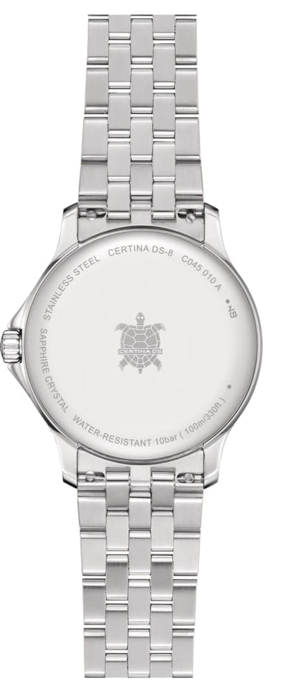 Стальной браслет из нескольких рядов переплетающихся звеньев элегантно выглядит на запястье. Ударопрочность и водонепроницаемость 10 бар – концепция DS ConceptDS ConceptDouble Security Concept, обозначает двойную надёжность и безупречную точность часов Certina. Двойная система защиты подразумевает обеспечение максимальной устойчивости к ударам и высоких показателей водонепроницаемости.. Одностороннее антибликовое покрытие стекла из сапфира. . Индикация текущего числа, функция EOLEOLПредставляет собой систему, уведомляющую владельца часов о необходимости замены элемента питания. За 2 недели до полного разряда батарейки секундная стрелка перестаёт ходить чётко и начинает перепрыгивать на 3-4 деления.. Диаметр корпуса: 31 мм.