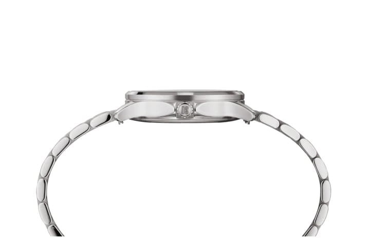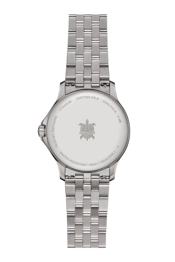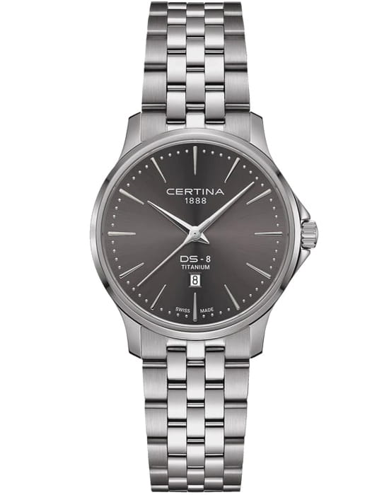 Титановый браслет из нескольких рядов переплетающихся звеньев элегантно выглядит на запястье. Ударопрочность и водонепроницаемость 10 бар – концепция DS ConceptDS ConceptDouble Security Concept, обозначает двойную надёжность и безупречную точность часов Certina. Двойная система защиты подразумевает обеспечение максимальной устойчивости к ударам и высоких показателей водонепроницаемости.. Одностороннее антибликовое покрытие стекла из сапфира. Титановый браслет на застёжке-бабочке с кнопкамиЗастёжка "бабочка"Такой вид застёжки дополняется предохранителями, помогающими избежать случайного раскрытия браслета. Обладают изящным исполнением. . Индикация текущего числа, функция EOLEOLПредставляет собой систему, уведомляющую владельца часов о необходимости замены элемента питания. За 2 недели до полного разряда батарейки секундная стрелка перестаёт ходить чётко и начинает перепрыгивать на 3-4 деления.. Диаметр корпуса: 31 мм.