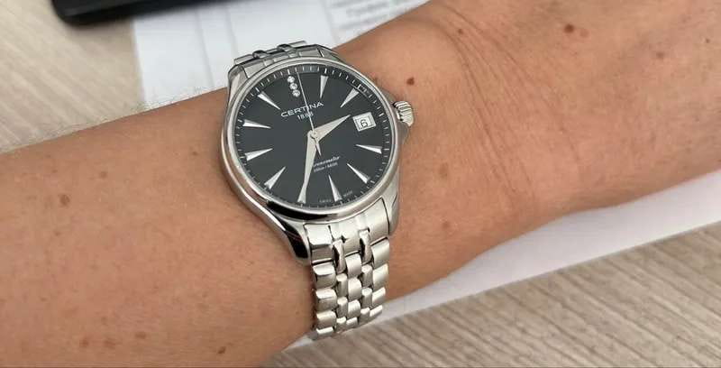 Брендовая модель с серебристым блеском является идеальным решением для торжественного мероприятия или вечеринки. Минималистичный чёрный циферблат декорирован 3 бриллиантами оттенка Top Wesselton, стиля добавляет узор по окружности. Наручные часы за безупречную точность хода швейцарского кварцевого калибра ETA F06.411 отмечены сертификатом хронометра COSCСертификат COSCОфициальный сертификат, подтверждающий то, что часы ходят с особо высокой точностью. Для получения документа часы подвергаются тестовым испытаниям, разработанным швейцарским институтом тестирования хронометров COSC. Допустимая норма для механических часов -4/+6 секунд в день, для кварцевых моделей +/- 0,07 секунд в день.. Закручивающаяся заводная головка и задняя крышка. Концепция DS ConceptDS ConceptDouble Security Concept, обозначает двойную надёжность и безупречную точность часов Certina. Двойная система защиты подразумевает обеспечение максимальной устойчивости к ударам и высоких показателей водонепроницаемости.. Сапфировое стекло с односторонним антибликовым покрытием. Водостойкость 200 метров. . Стальной ударопрочный корпусУдаропрочный корпусМеханизм заключён в корпус, выполненный из современных материалов, устойчивых к ударам, механическим повреждениям и падению с высоты: инновационный пластик, карбон, нержавеющая сталь, титан. и браслет. Окошко даты, индикатор EOLEOLПредставляет собой систему, уведомляющую владельца часов о необходимости замены элемента питания. За 2 недели до полного разряда батарейки секундная стрелка перестаёт ходить чётко и начинает перепрыгивать на 3-4 деления.. Диаметр корпуса: 33,8 мм.