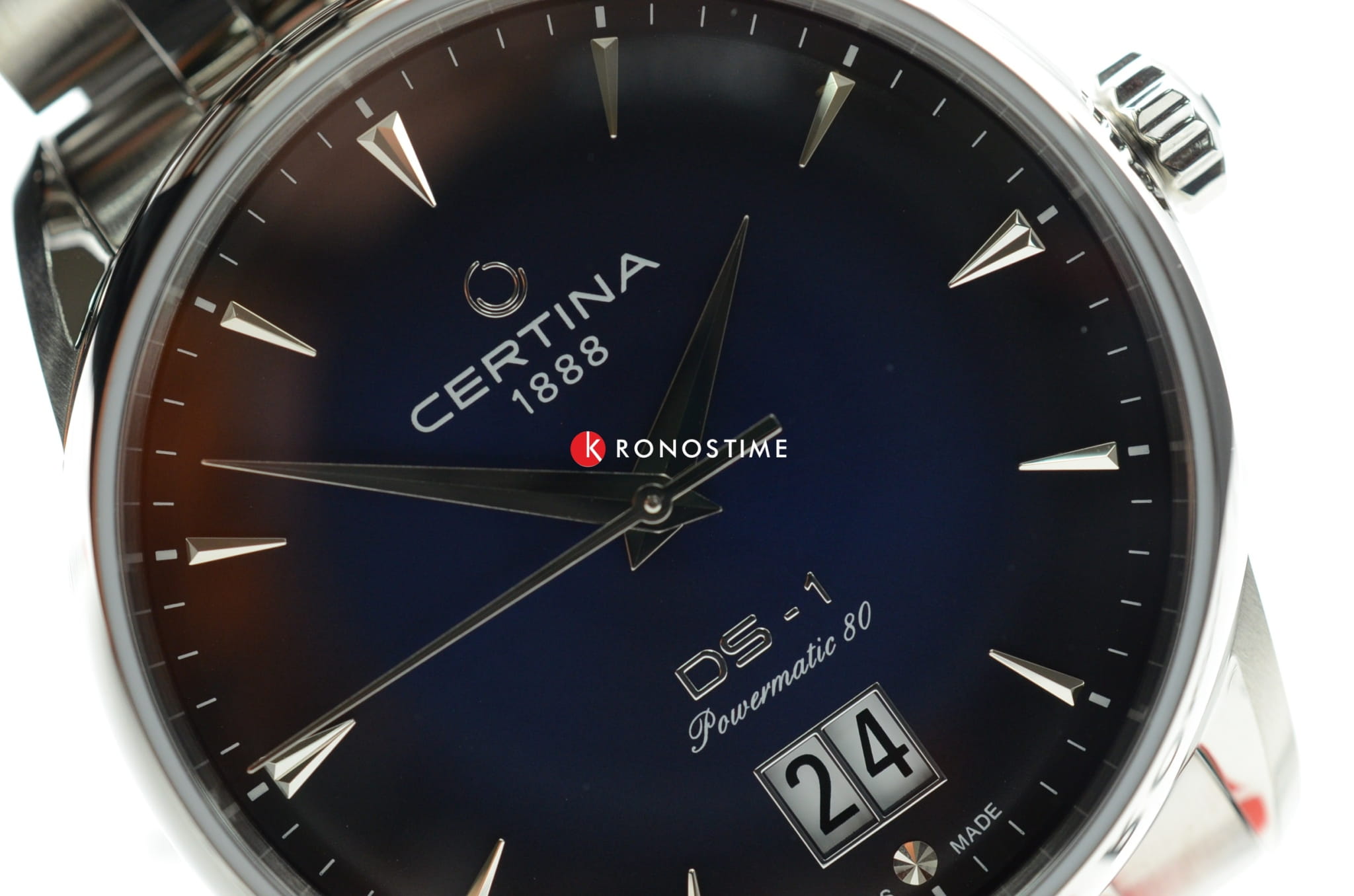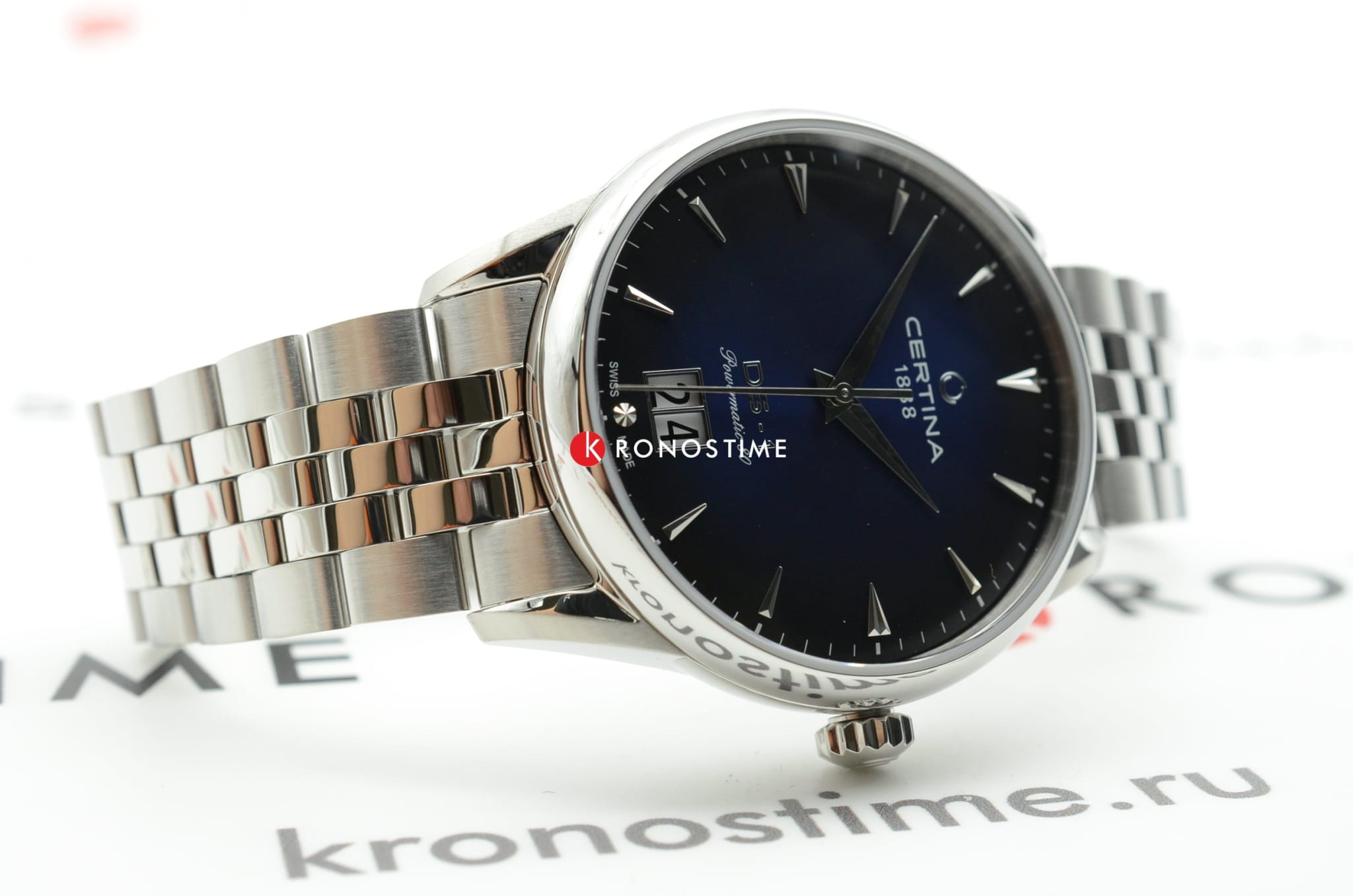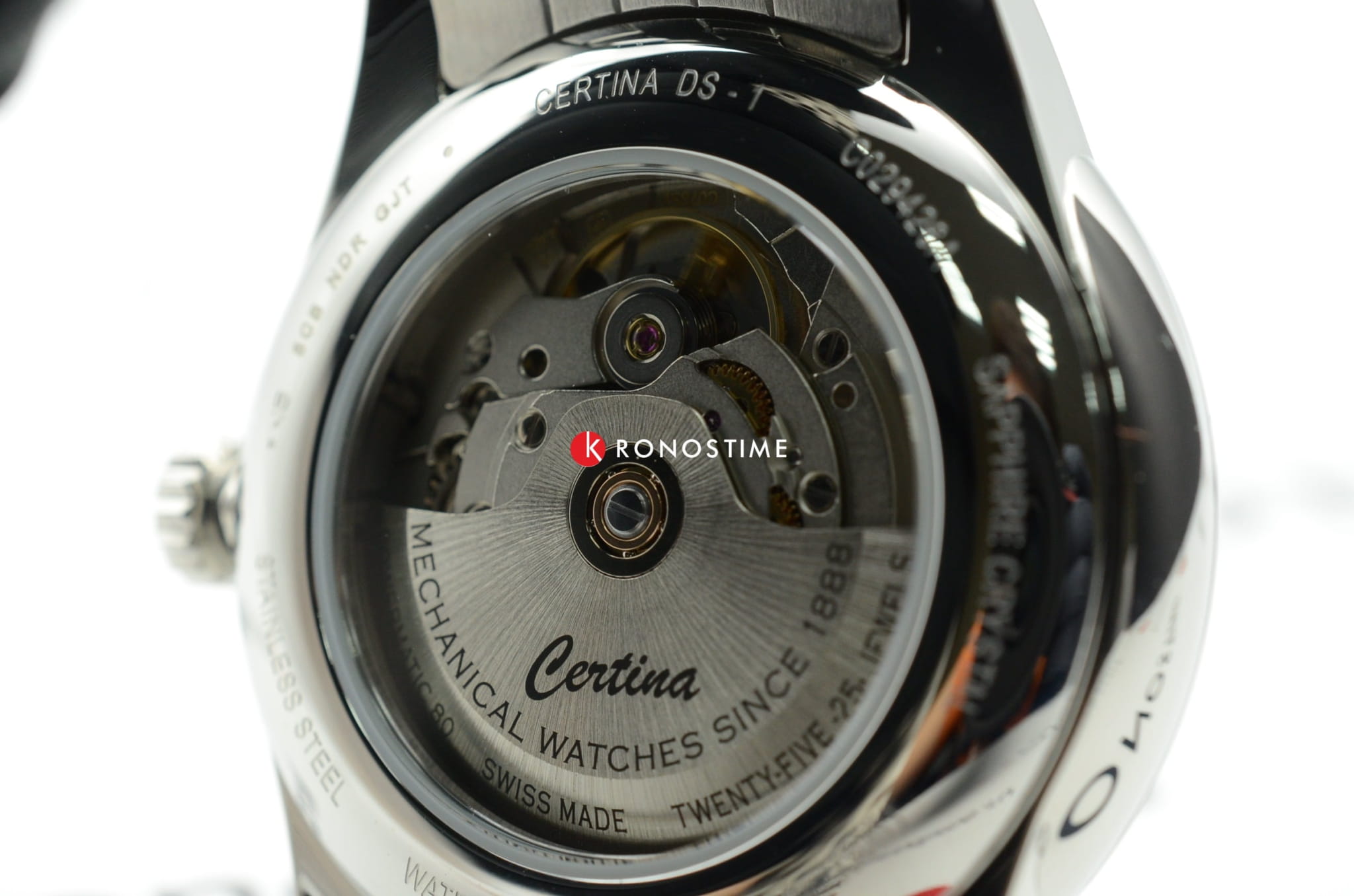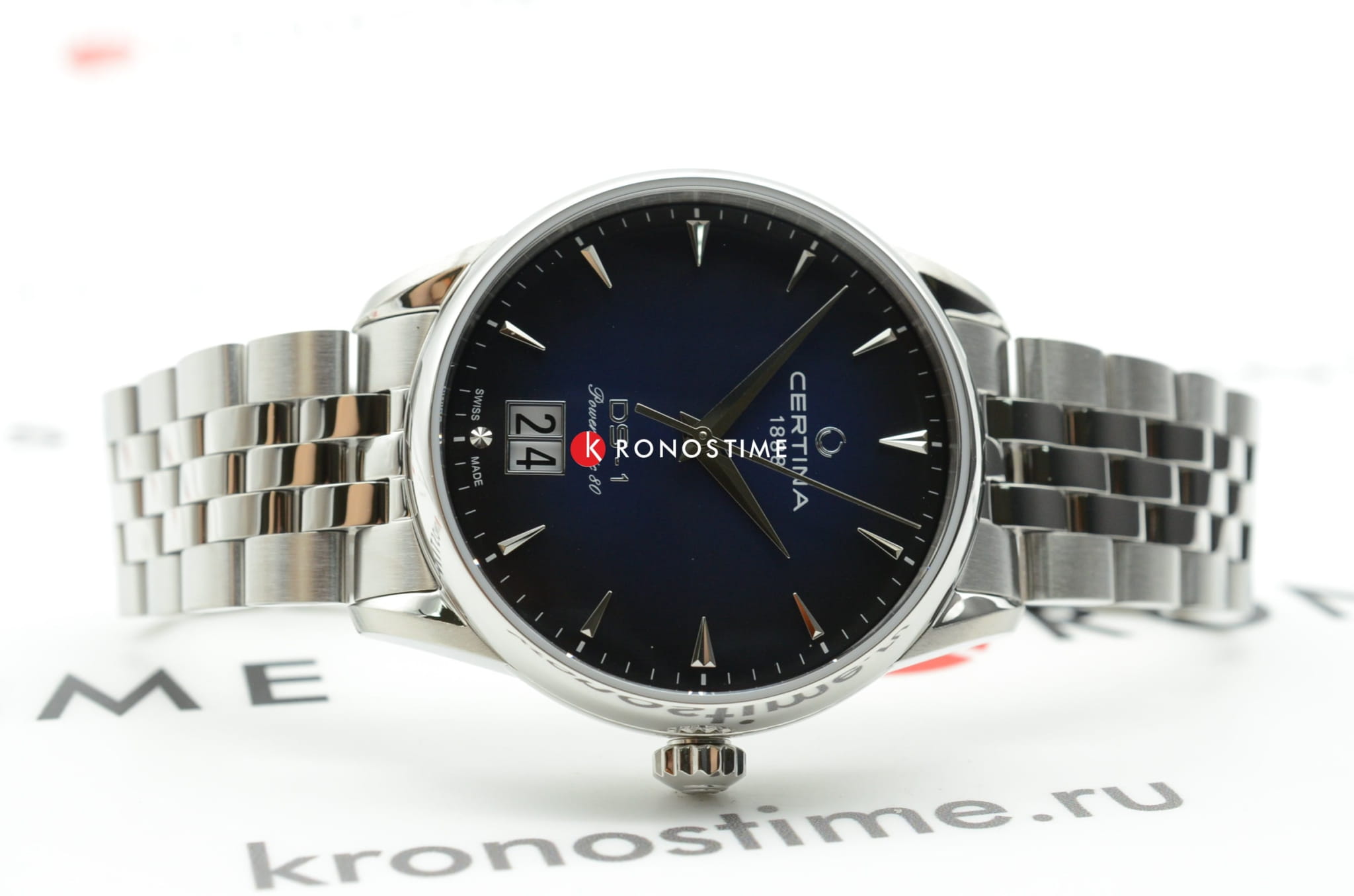 Аксессуар выполнен в классическом стиле, элегантно смотрится сатинированный синий циферблат. Надёжный стальной корпус дополнен уплотнительным кольцом в соответствии с концепцией Двойной Надёжности DSDS ConceptDouble Security Concept, обозначает двойную надёжность и безупречную точность часов Certina. Двойная система защиты подразумевает обеспечение максимальной устойчивости к ударам и высоких показателей водонепроницаемости.. Он защищает швейцарский автоматический механизм ETA Powermatic 80Powermatic 80Эксклюзивный калибр от швейцарской компании ETA с увеличенным запасом хода до 80 часов за счёт удлинённой заводной пружины. Характеризуется улучшенной системой спуска со сниженным трением. с увеличенным запасом хода до 80 часов. Калибр дополнен кремниевой спиралью Nivachron™, устраняющей действие магнитных полей. Выпуклое сапфировое стекло имеет покрытие антиблик. Часы водонепроницаемы до 100 метров. Браслет оснащён системой быстрой замены. В нижней части циферблата размещена крупная апертура даты. Диаметр корпуса: 41 мм.