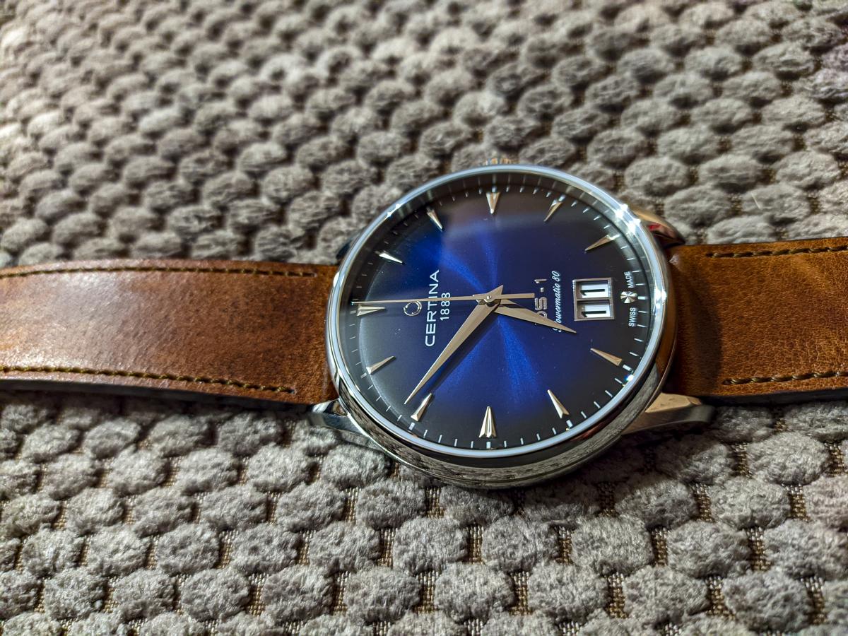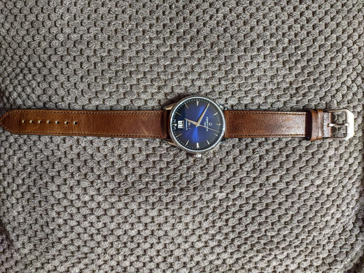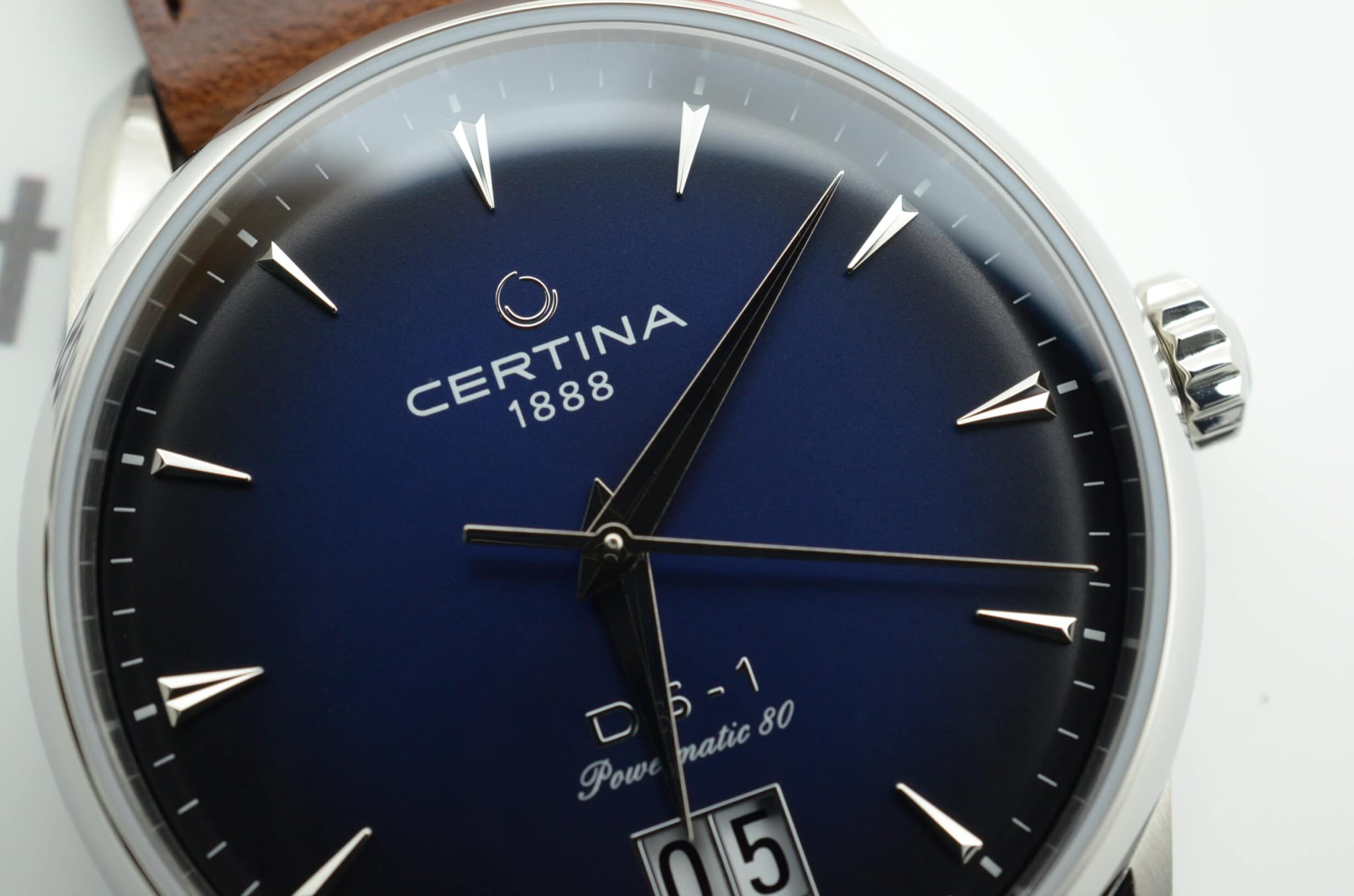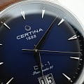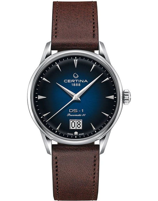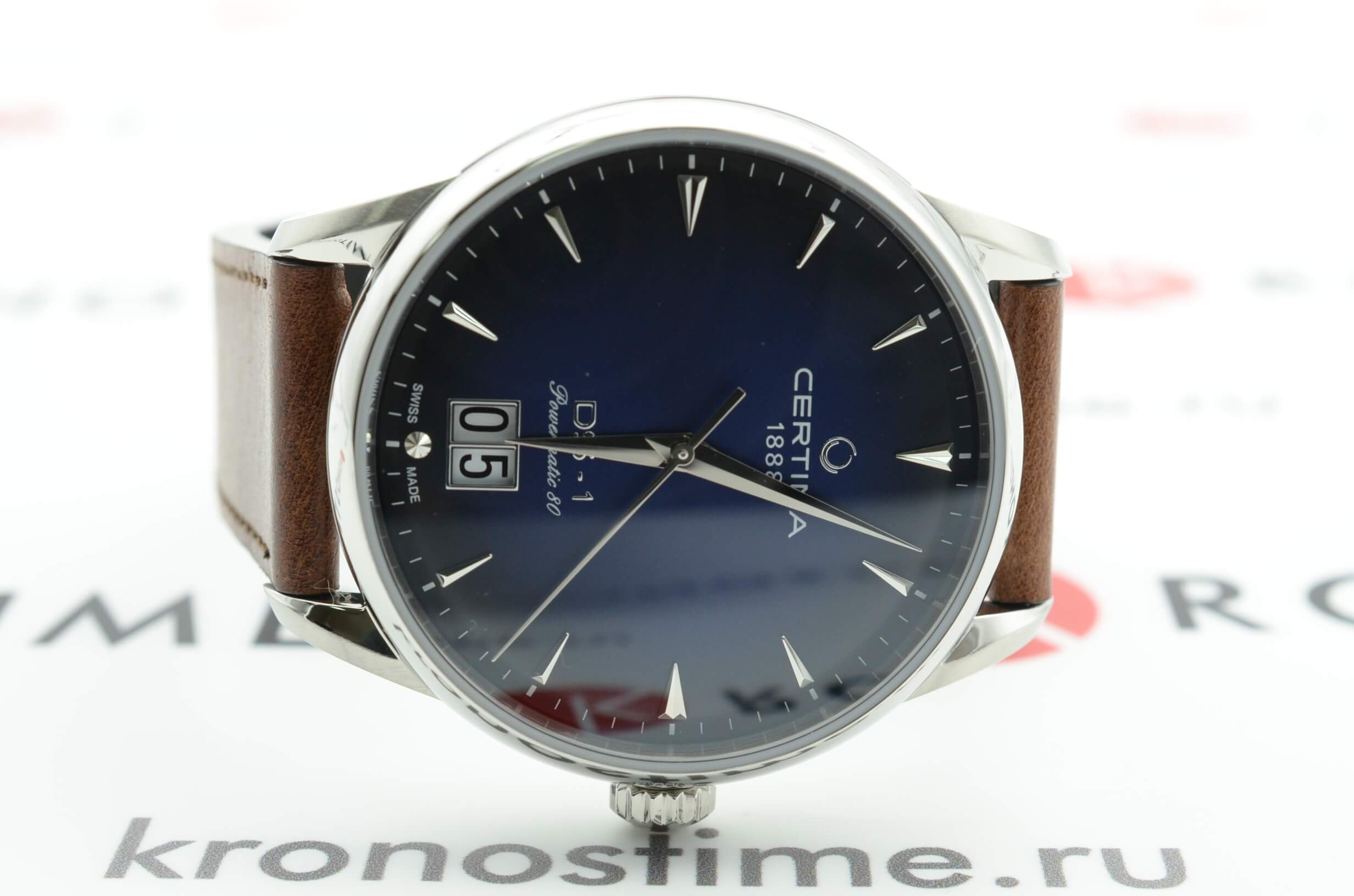 Модель в элегантном исполнении стильно смотрится на запястье, классическим решением стал ремешок из натуральной кожи с функцией быстрой замены. Сатинированный синий циферблат не имеет лишних деталей. Прочный корпус из стали 316L дополнен уплотнительным кольцом, опираясь на систему Двойной Надёжности DSDS ConceptDouble Security Concept, обозначает двойную надёжность и безупречную точность часов Certina. Двойная система защиты подразумевает обеспечение максимальной устойчивости к ударам и высоких показателей водонепроницаемости.. Часы работают за счёт швейцарского автоматического механизма ETA Powermatic 80Powermatic 80Эксклюзивный калибр от швейцарской компании ETA с увеличенным запасом хода до 80 часов за счёт удлинённой заводной пружины. Характеризуется улучшенной системой спуска со сниженным трением. с увеличенным 80-часовым резервом хода. Добиться антимагнитных свойств позволила кремниевая спираль Nivachron™. Улучшить читаемость показателей при ярком свете позволило антибликовое покрытие сапфирового стекла. Аксессуар подходит для плавания – водозащита 10 бар. На метке 6 часов размещено крупное окошко даты. Диаметр корпуса: 41 мм.