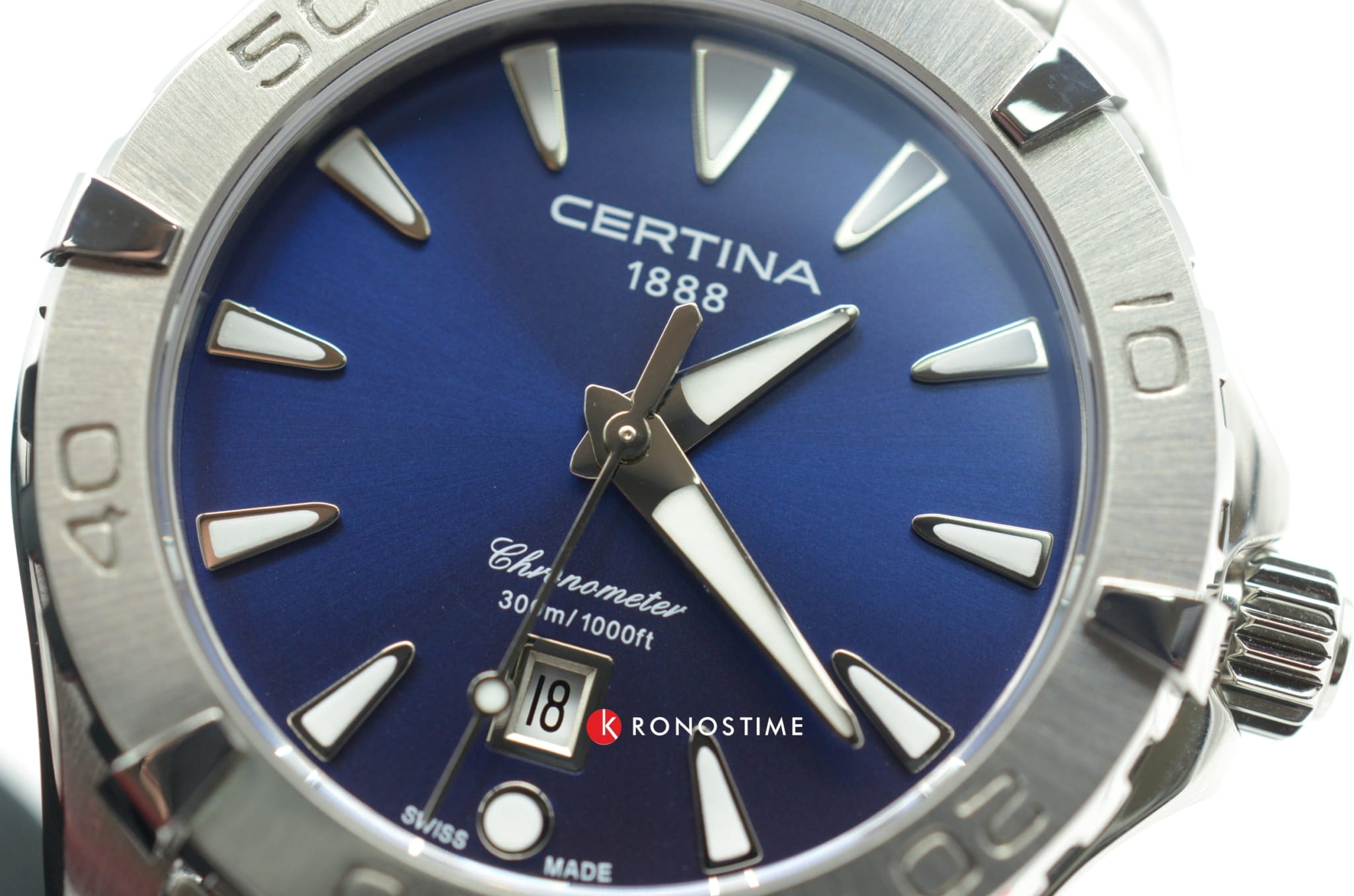 Компактный аксессуар создан по всем правилам дайверской тематики: вращающийся безель, крупная индикация времени, завинчивающаяся заводная головка и задняя крышка. Стильно смотрится сатинированный синий циферблат в сочетании с холодным блеском нержавеющей стали 316L.Часы оснащены швейцарским кварцевым калибром ETA F04.411 Precidrive™Precidrive™Инновационный кварцевый механизм Certina. Часы, оснащённые этим швейцарским калибром, приравниваются к точности к сертифицированным хронометрам, точность хода составляет +/-10 секунд в год., точность хода которого отмечена официальным сертификатом COSCСертификат COSCОфициальный сертификат, подтверждающий то, что часы ходят с особо высокой точностью. Для получения документа часы подвергаются тестовым испытаниям, разработанным швейцарским институтом тестирования хронометров COSC. Допустимая норма для механических часов -4/+6 секунд в день, для кварцевых моделей +/- 0,07 секунд в день.. Модель отличается максимальной водонепроницаемостью 300 метров, сапфировое стекло дополнено антибликовым покрытием. Функции: отображение даты, индикатор EOLEOLПредставляет собой систему, уведомляющую владельца часов о необходимости замены элемента питания. За 2 недели до полного разряда батарейки секундная стрелка перестаёт ходить чётко и начинает перепрыгивать на 3-4 деления.. Диаметр корпуса: 34,3 мм.