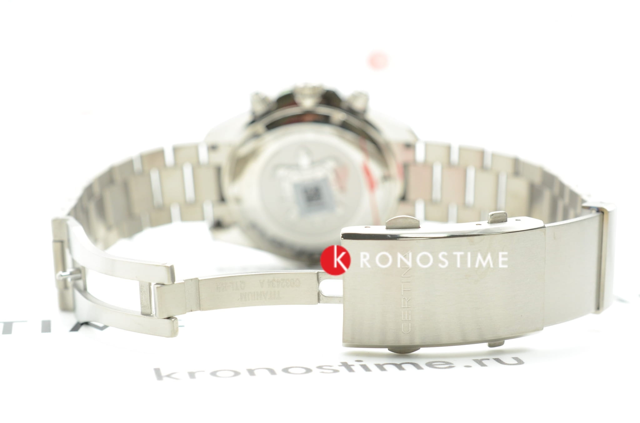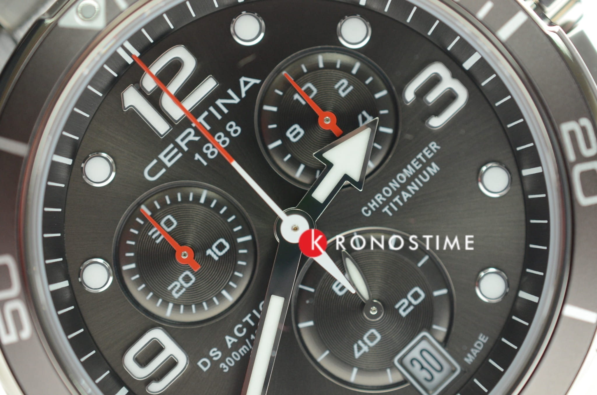 Дайверский хронографХронографФункция позволяет измерять отрезки времени с особой точностью: часы, минуты, секунды. Верным признаком хронографа является наличие на циферблате 3 дополнительных окошек-счётчиков. станет идеальным завершением делового, повседневного образа. Модель сделана из гипоаллергенного титана, востребованного благодаря прочности и антимагнетизму. Точность хода швейцарского автоматического механизма G10.212 AA PRECIDRIVE приравнивается к хронометрической, что подтверждено сертификатом COSCСертификат COSCОфициальный сертификат, подтверждающий то, что часы ходят с особо высокой точностью. Для получения документа часы подвергаются тестовым испытаниям, разработанным швейцарским институтом тестирования хронометров COSC. Допустимая норма для механических часов -4/+6 секунд в день, для кварцевых моделей +/- 0,07 секунд в день.. Улучшению читаемости показателей в солнечные дни способствует антибликовое покрытие сапфирового стекла. Максимальная водостойкость 300 метров. Концепция DSDS ConceptDouble Security Concept, обозначает двойную надёжность и безупречную точность часов Certina. Двойная система защиты подразумевает обеспечение максимальной устойчивости к ударам и высоких показателей водонепроницаемости.. Люминесцентная подсветкаЛюминесцентное покрытиеПозволяет считывать показания времени в темноте. Производители наносят на стрелки, часовые индексы, безель или поверхность циферблата светонакопительный состав, дающий холодное свечение.. Секундомер, отображение даты. Диаметр корпуса: 43 мм.