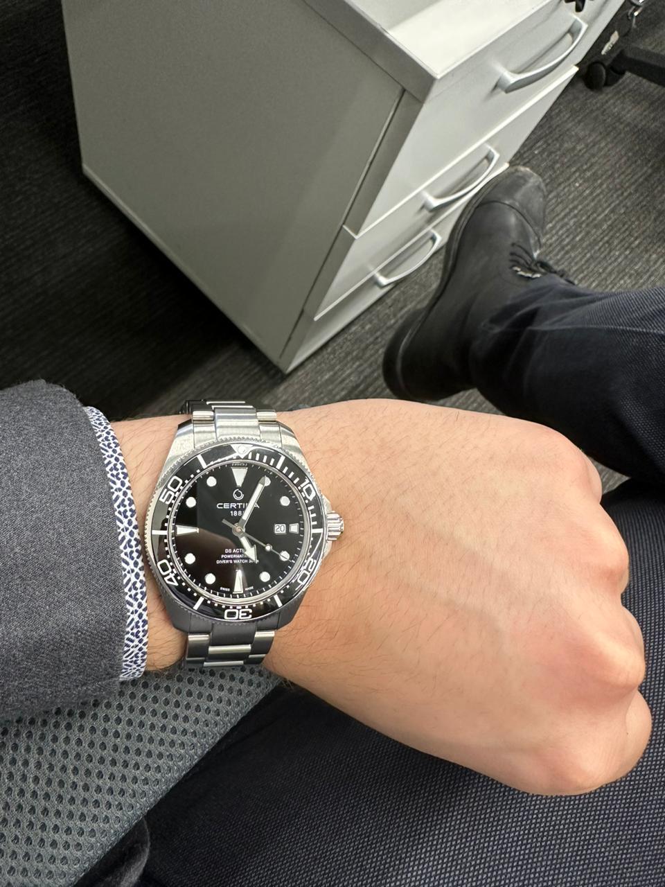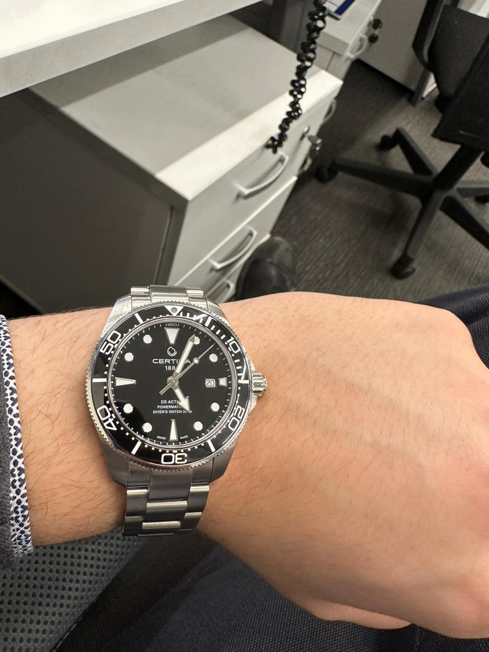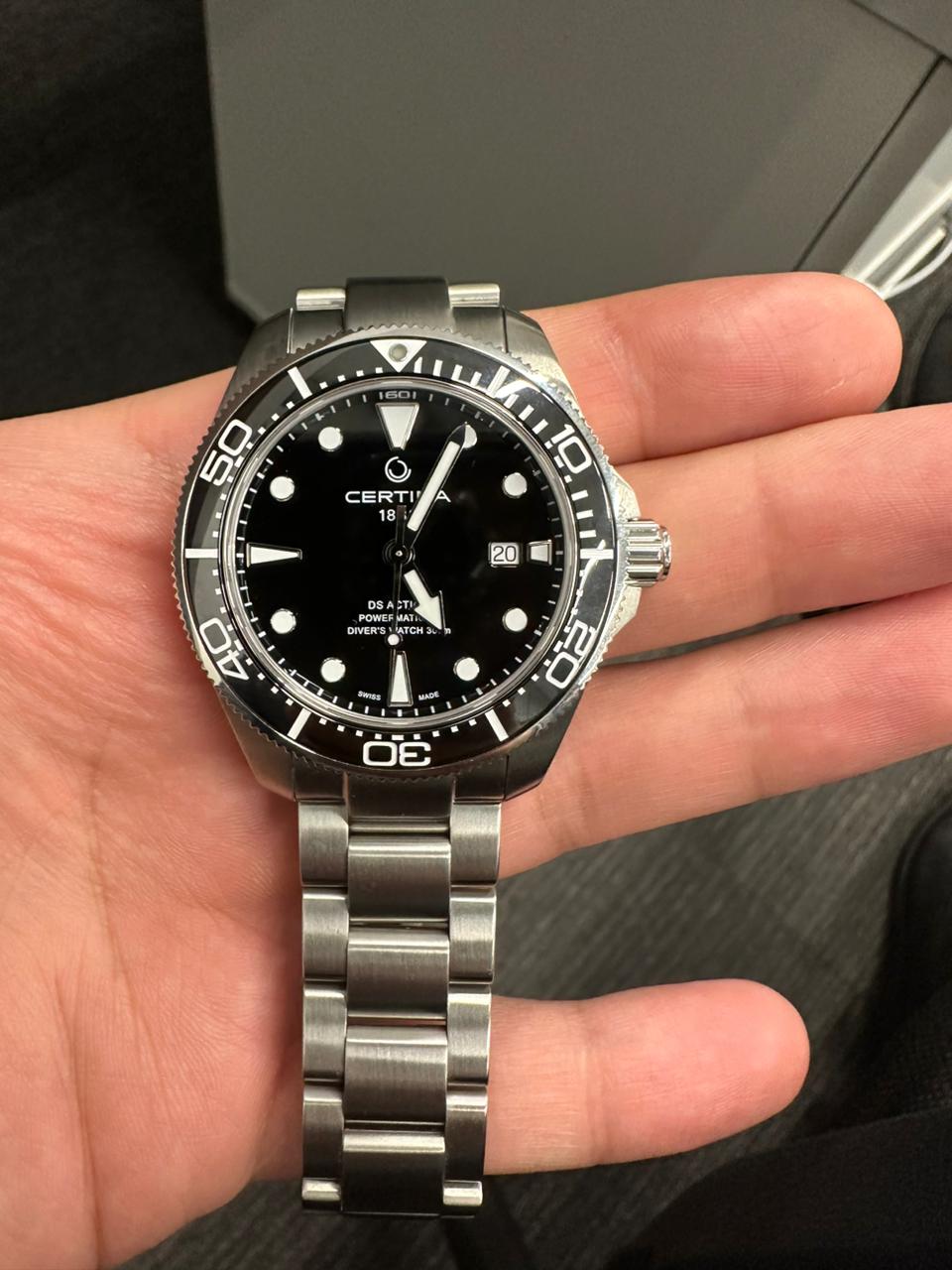 Приятно делать дорогую покупку у проверенного поставщика.Certina  часы, изготовленные с изысканной точностью. Все стрелки аккуратны и серебряные. Отличное сочетания с черным оттенком циферблата. Стекло сапфировое- верный гарант надежности. Также часы обладают высокой степенью влагоустойчивости.  Дополнительный акцент роскоши черепашка на тыльной стороне корпуса часов.