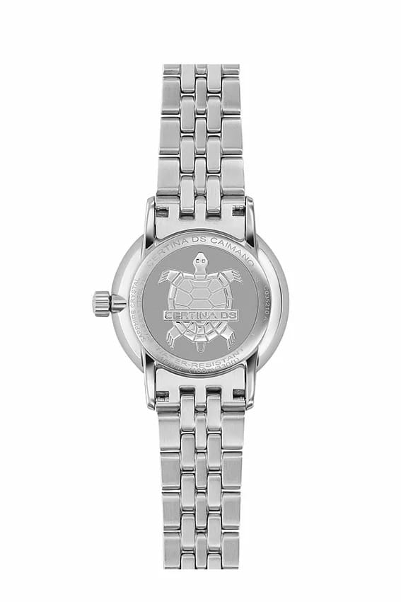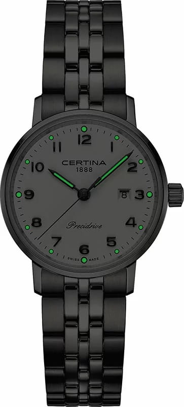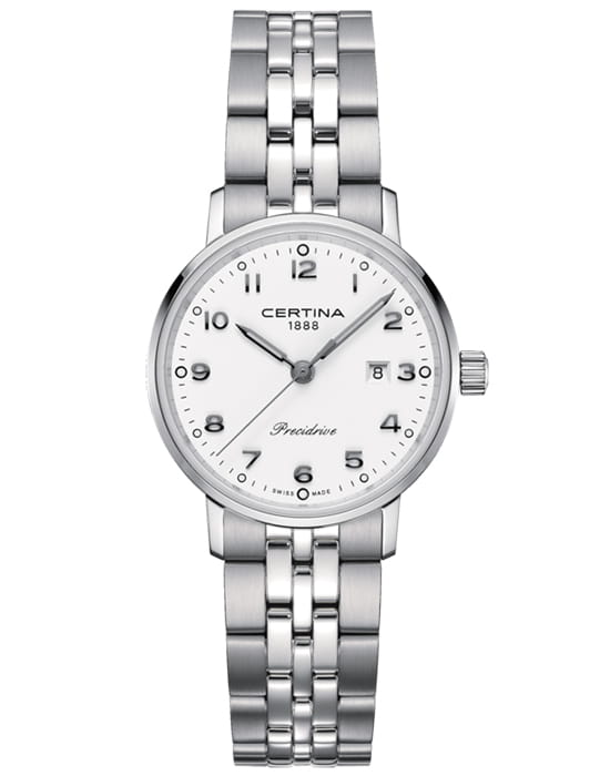 Модель отражает элегантность и изысканность. Швейцарский кварцевый механизм ETA F03.411 Precidrive™Precidrive™Инновационный кварцевый механизм Certina. Часы, оснащённые этим швейцарским калибром, приравниваются к точности к сертифицированным хронометрам, точность хода составляет +/-10 секунд в год.. Корпус и браслет из нержавеющей стали 316L. Система DS ConceptDS ConceptDouble Security Concept, обозначает двойную надёжность и безупречную точность часов Certina. Двойная система защиты подразумевает обеспечение максимальной устойчивости к ударам и высоких показателей водонепроницаемости.. Сапфировое стекло с антибликовым покрытием. Индикация числа, функция EOLEOLПредставляет собой систему, уведомляющую владельца часов о необходимости замены элемента питания. За 2 недели до полного разряда батарейки секундная стрелка перестаёт ходить чётко и начинает перепрыгивать на 3-4 деления..