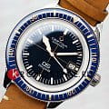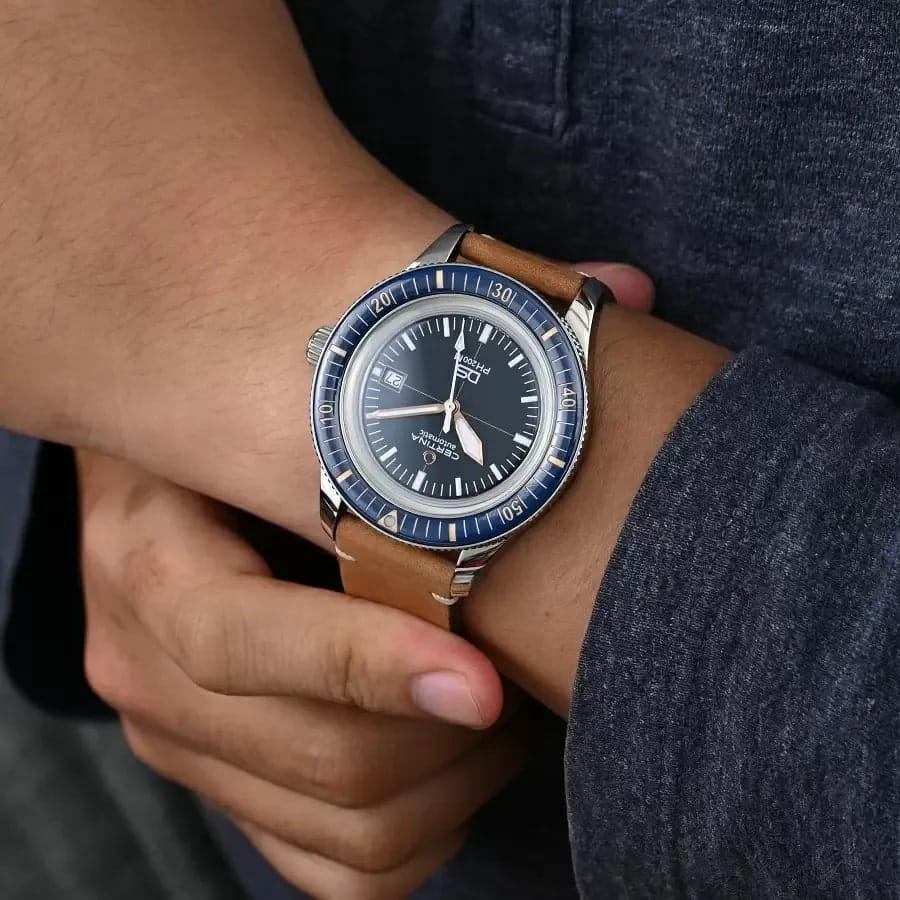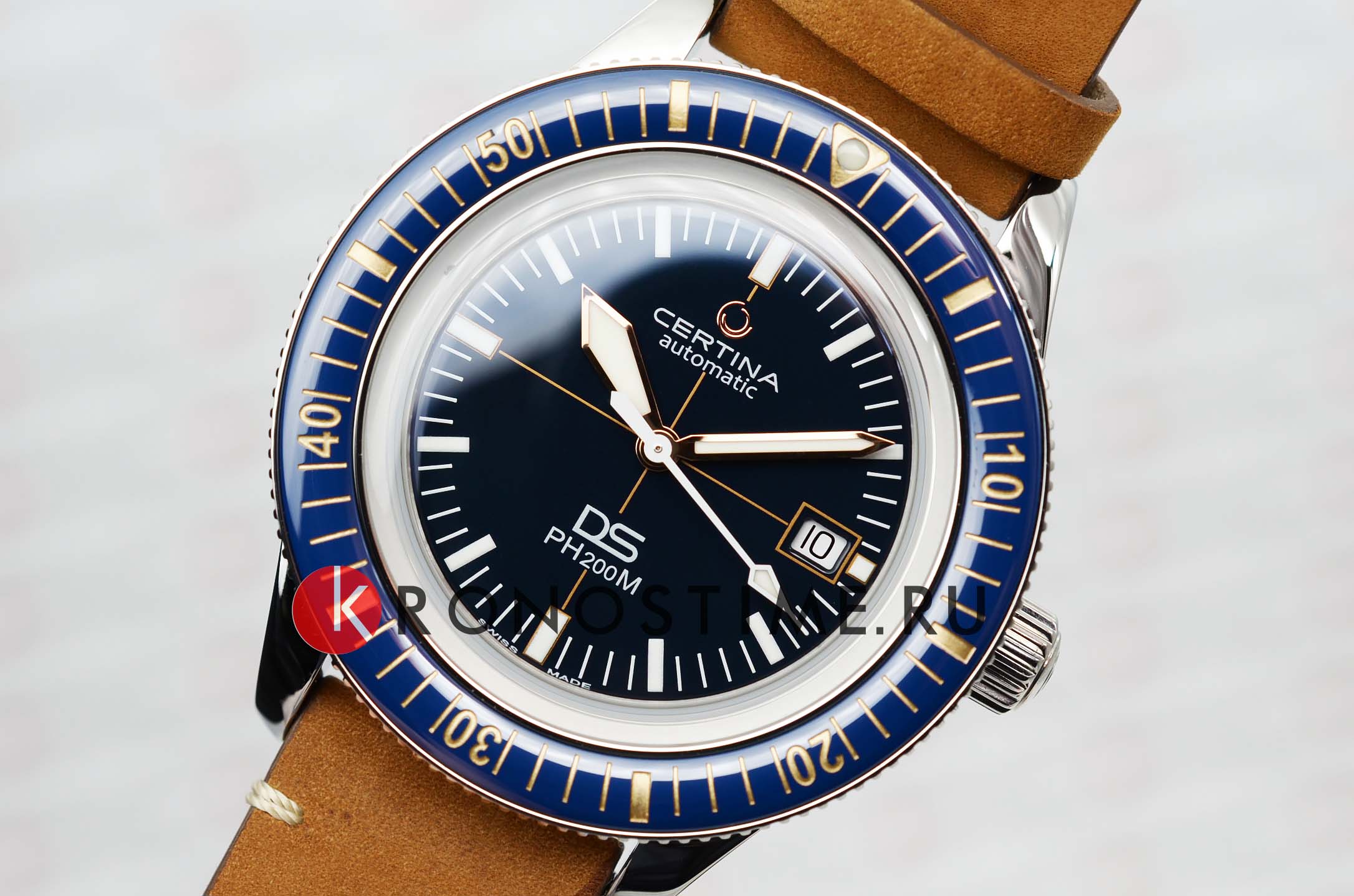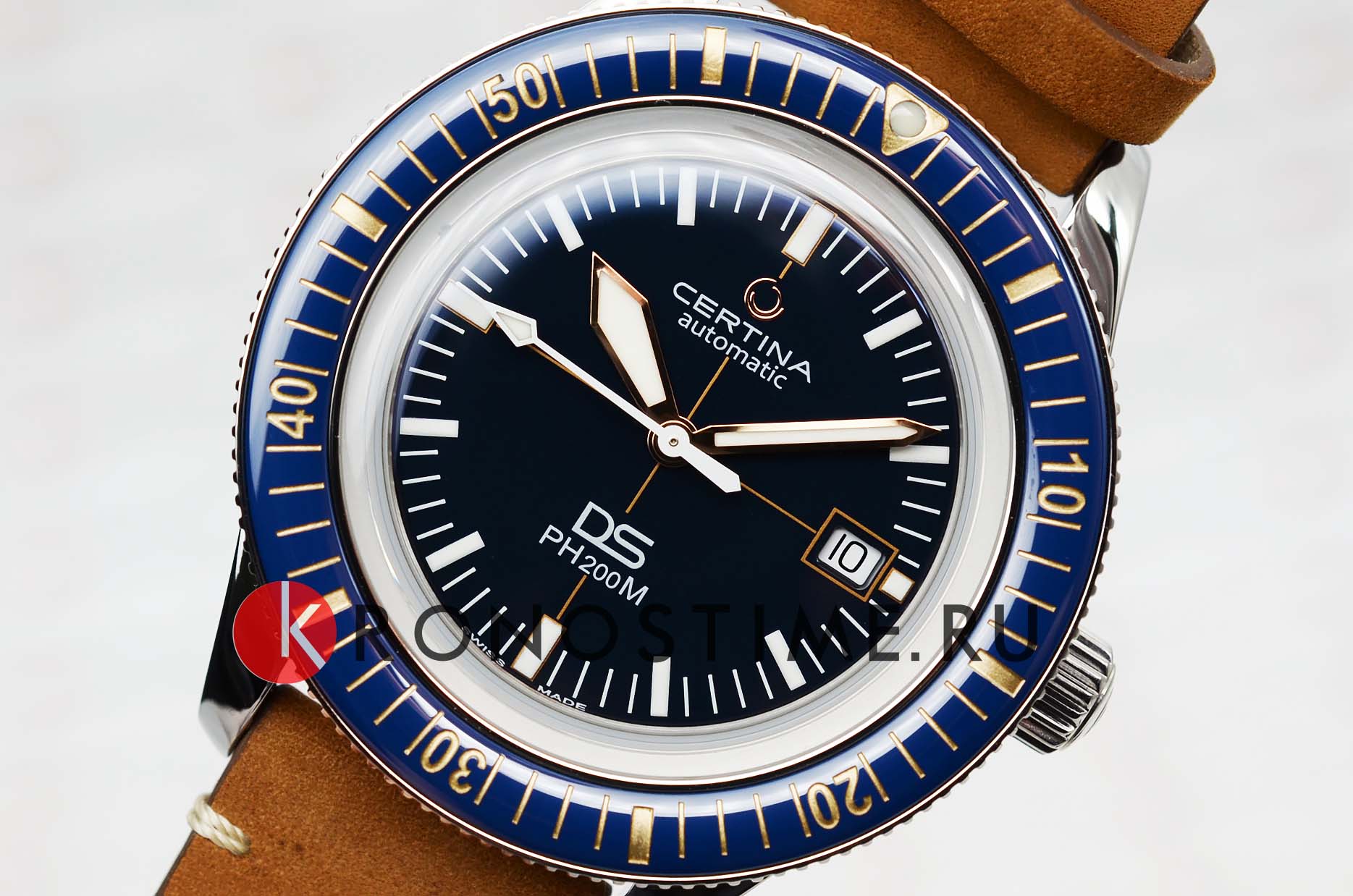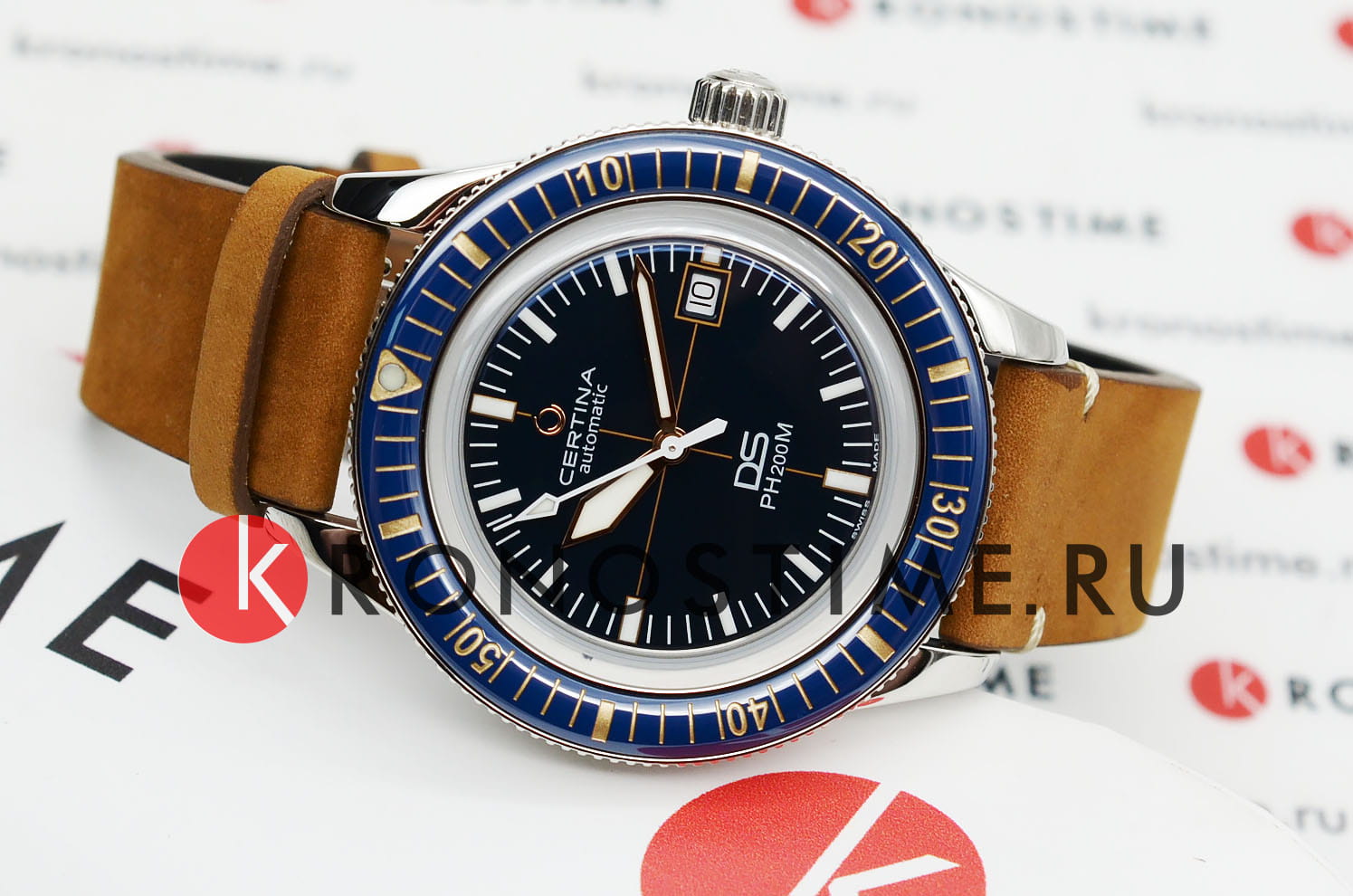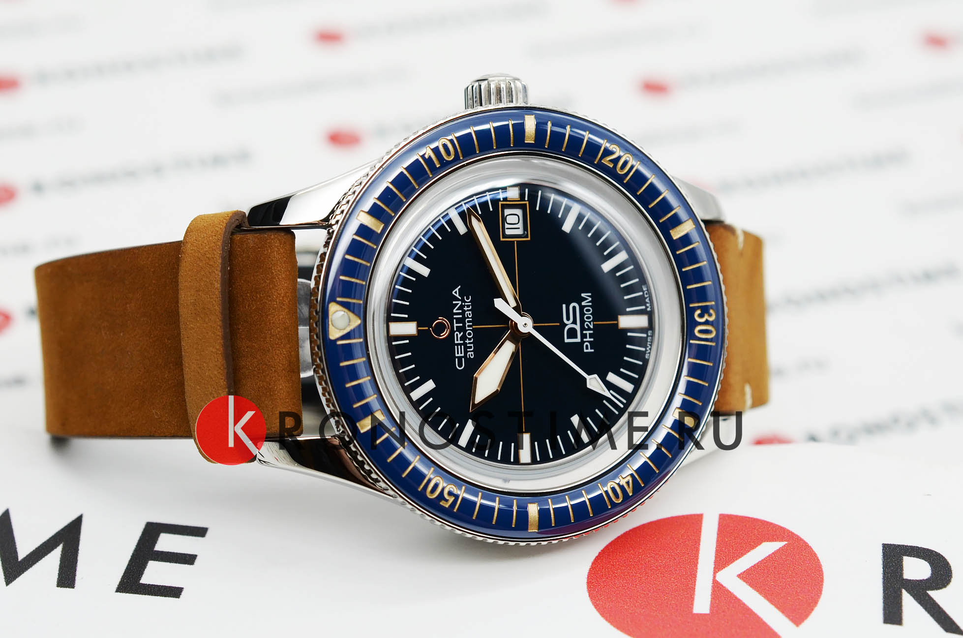Оригинальный циферблат понравится ценителям ретро-дизайна. В комплекте с кожаным ремешком вы получаете дополнительный вариант из текстиля. Меняя их, вы можете экспериментировать с разными стилями. Уникальностью обладает не только аксессуар, но и упаковка, сделанная в виде бокса для дайвинга. Часы комплектуются автоматическим механизмом ETA Powermatic 80Powermatic 80Эксклюзивный калибр от швейцарской компании ETA с увеличенным запасом хода до 80 часов за счёт удлинённой заводной пружины. Характеризуется улучшенной системой спуска со сниженным трением. с 80-часовым запасом хода. Технология DS ConceptDS ConceptDouble Security Concept, обозначает двойную надёжность и безупречную точность часов Certina. Двойная система защиты подразумевает обеспечение максимальной устойчивости к ударам и высоких показателей водонепроницаемости.. Стекло с покрытием Nex scratchguard, устойчивым к царапинам. Вращающийся безельБезельВнешний ободок, закрепляющий стекло. В спортивных часах так называется поворотное кольцо с делениями на циферблате, выполняет роль таймера – замеряет отрезки времени на шкале. Неподвижный безель – элемент декора. Однонаправленно вращающийся безель на дайверских часах позволяет фиксировать моменты погружения и выныривания на поверхность.. Диаметр корпуса: 42,8 мм.