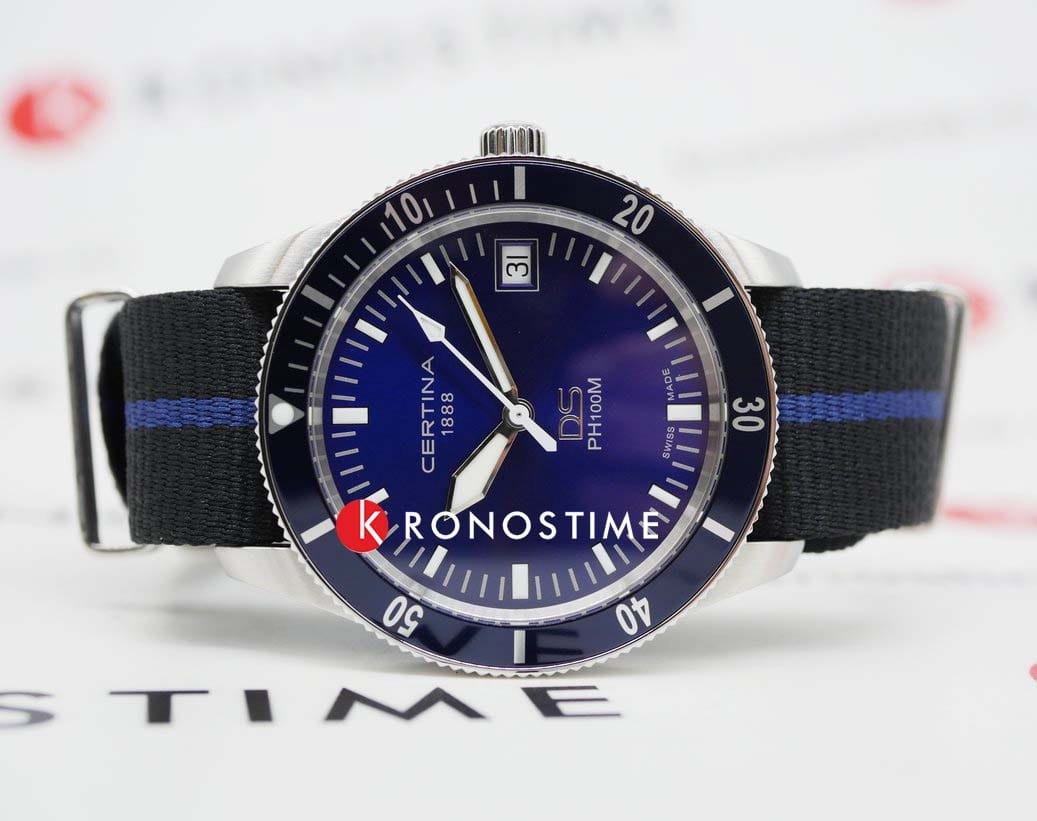 Certina DS PH100M Gent C044.410.18.040.00 – часы для поклонников ярких аксессуаров. Корпус изготовлен из высококачественной нержавеющей стали 316L с . Под твердым сапфировым стекломСапфировое стеклоПрочный и надёжный материал из кристалла сапфира синтетического происхождения, характеризующийся особой твёрдостью и устойчивостью к царапинам и повреждениям. с антибликовым покрытиемАнтибликовое покрытиеСлой оксида металла в 0,13-0,3 микрон, благодаря которому стекло часов не бликует и не отражает свет. Антибликовое покрытие уменьшает отражение света в 10 раз, обеспечивая отличную читаемость показателей циферблата. находится черный циферблат на котором вы найдете окошко даты в положении 3 часа, а также маркировку, покрытую люминесцентным покрытиемЛюминесцентное покрытиеПозволяет считывать показания времени в темноте. Производители наносят на стрелки, часовые индексы, безель или поверхность циферблата светонакопительный состав, дающий холодное свечение. Super-LumiNova. Класс водозащиты: 100 метров, позволит плавать, нырять и заниматься другими водными видами спорта. Тканевый ремешок. БезельБезельВнешний ободок, закрепляющий стекло. В спортивных часах так называется поворотное кольцо с делениями на циферблате, выполняет роль таймера – замеряет отрезки времени на шкале. Неподвижный безель – элемент декора. Однонаправленно вращающийся безель на дайверских часах позволяет фиксировать моменты погружения и выныривания на поверхность. из нержавеющей стали с PVD-покрытиемPVDУльтратонкое покрытие наносится в технике вакуумного напыления, сочетает в себе нитрид титана особой прочности со слоем золота или оксида хрома. Несёт в себе декоративную или защитную функцию.