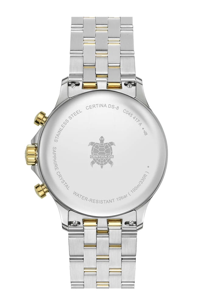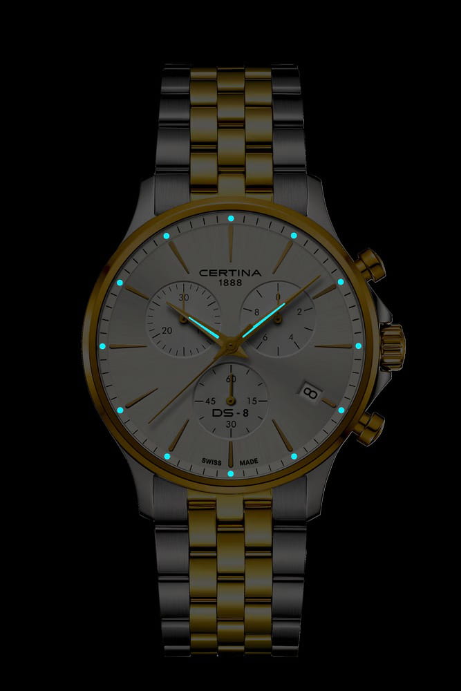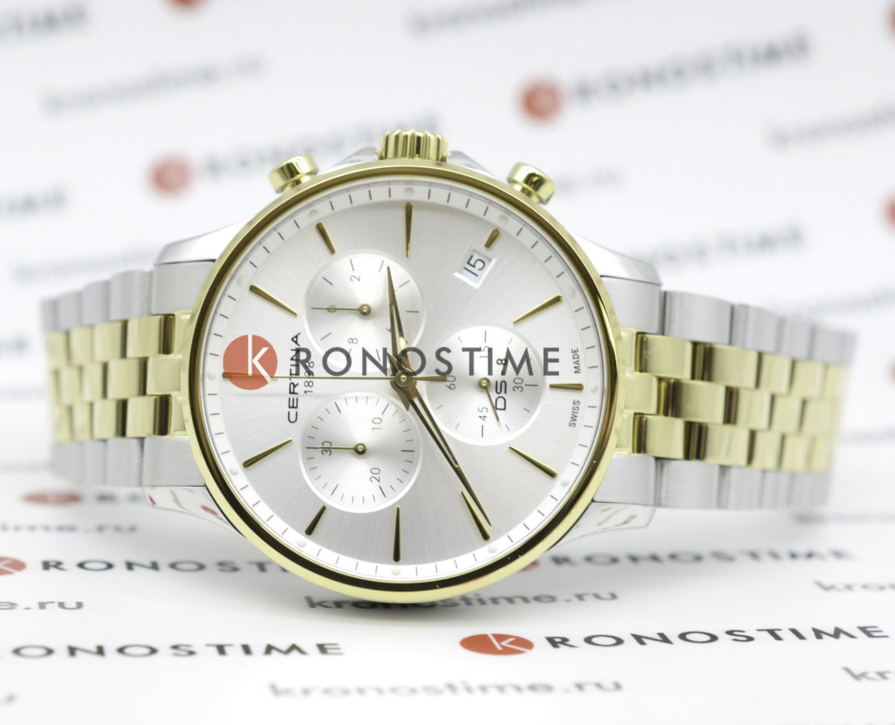 Высокая точность хода швейцарского кварцевого калибра ETA G15.212 AA Precidrive™Precidrive™Инновационный кварцевый механизм Certina. Часы, оснащённые этим швейцарским калибром, приравниваются к точности к сертифицированным хронометрам, точность хода составляет +/-10 секунд в год. отмечена сертификатом COSCСертификат COSCОфициальный сертификат, подтверждающий то, что часы ходят с особо высокой точностью. Для получения документа часы подвергаются тестовым испытаниям, разработанным швейцарским институтом тестирования хронометров COSC. Допустимая норма для механических часов -4/+6 секунд в день, для кварцевых моделей +/- 0,07 секунд в день.. Сапфировое стеклоСапфировое стеклоПрочный и надёжный материал из кристалла сапфира синтетического происхождения, характеризующийся особой твёрдостью и устойчивостью к царапинам и повреждениям. с покрытием «антиблик». ХронографХронографФункция позволяет измерять отрезки времени с особой точностью: часы, минуты, секунды. Верным признаком хронографа является наличие на циферблате 3 дополнительных окошек-счётчиков., секундомер, дата, EOLEOLПредставляет собой систему, уведомляющую владельца часов о необходимости замены элемента питания. За 2 недели до полного разряда батарейки секундная стрелка перестаёт ходить чётко и начинает перепрыгивать на 3-4 деления.. Концепция Двойной Надёжности DSDS ConceptDouble Security Concept, обозначает двойную надёжность и безупречную точность часов Certina. Двойная система защиты подразумевает обеспечение максимальной устойчивости к ударам и высоких показателей водонепроницаемости.. Стрелки с люминесцентным покрытиемЛюминесцентное покрытиеПозволяет считывать показания времени в темноте. Производители наносят на стрелки, часовые индексы, безель или поверхность циферблата светонакопительный состав, дающий холодное свечение.. Стальной браслет на застёжке-бабочке с кнопкамиЗастёжка "бабочка"Такой вид застёжки дополняется предохранителями, помогающими избежать случайного раскрытия браслета. Обладают изящным исполнением. .