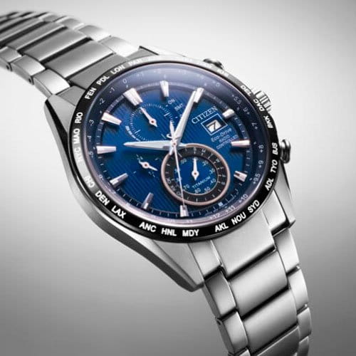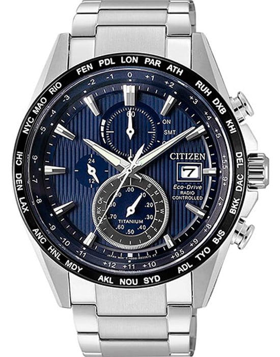 Многофункциональные мужские часы в премиум исполнении. Корпус и литой браслет из титана с суперпрочным покрытием Super Titanium. Сапфировое стекло. Кварцевый механизм Eco-Drive. Коррекция по радиосигналам, хронограф, мировое время и вечный календарь.