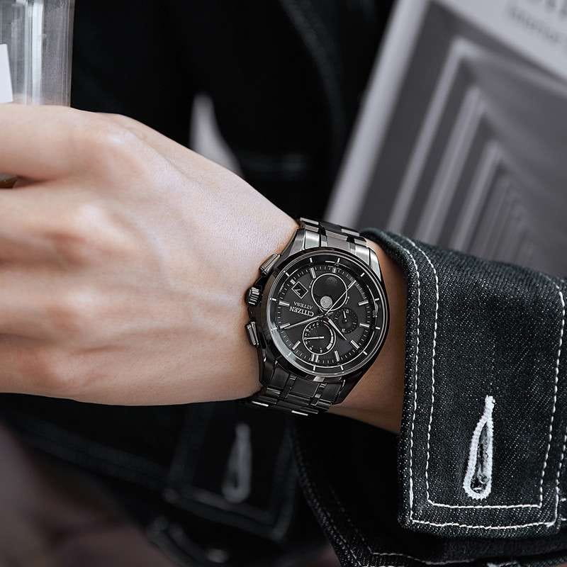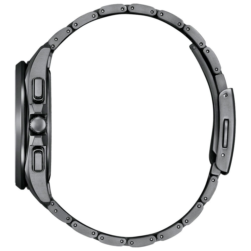 Часы Citizen BY1006-62E — это гармоничное сочетание современного японского стиля, передовых технологий и высокого уровня надежности. Модель выполнена в прочном и легком корпусе из инновационного суперлегкого титана Super Titanium Duratect TIC с черным DLC-покрытиемDLC-покрытиеDiamond like carbon - одно из лучших видов покрытия, представляющее собой углерод с алмазными свойствами. На поверхность материала наносятся распавшиеся молекулы углерода, превращающиеся в плёнку из алмазоподобных связей, которая перенимает твёрдость алмаза. диаметром 41,5 мм и толщиной 10,8 мм, дополненном браслетом шириной 22 мм с удобной раскладной застёжкойРаскладная застёжкаТакой тип застёжки используется только на браслетах из металла. Она никогда не раскрывается полностью, происходит разделение на 2 и более частей. Раскладывающая застёжка снизит вероятность потери часов к минимуму.. Кварцевый механизм калибра Citizen H874 оснащен системой Eco-Drive, которая работает на солнечной энергии, не требуя замены батарейки, и обеспечивает запас хода до 180 дней. Часы отличаются высокой точностью хода — отклонение составляет всего +/- 15 секунд в месяц. Среди функциональных особенностей — автоматическая настройка времени по радиосигналу для Германии, Японии, США и Китая, вечный календарь, функция мирового времениМировое время Полезное часовое усложнение, отображающее время в основных городах и известных областях по всему миру, оно связано с часовыми поясами, удобно для путешественников и бизнесменов. , 12/24-часовой формат, автоматическое переключение летнего и зимнего времени, а также уникальный полностью автоматизированный радиоуправляемый механизм определения фаз Луны с возможностью отображения как для северного, так и южного полушария. На черном циферблате расположена апертура даты в положении 4 часа, все стрелки с люминесцентным покрытиемЛюминесцентное покрытиеПозволяет считывать показания времени в темноте. Производители наносят на стрелки, часовые индексы, безель или поверхность циферблата светонакопительный состав, дающий холодное свечение. для отличной читаемости в любое время суток. Устойчивое к царапинам сапфировое стеклоСапфировое стеклоПрочный и надёжный материал из кристалла сапфира синтетического происхождения, характеризующийся особой твёрдостью и устойчивостью к царапинам и повреждениям. с антибликовым покрытиемАнтибликовое покрытиеСлой оксида металла в 0,13-0,3 микрон, благодаря которому стекло часов не бликует и не отражает свет. Антибликовое покрытие уменьшает отражение света в 10 раз, обеспечивая отличную читаемость показателей циферблата. надежно защищает циферблат. Водозащита уровня WR 100 позволяет использовать часы при плавании без погружения.