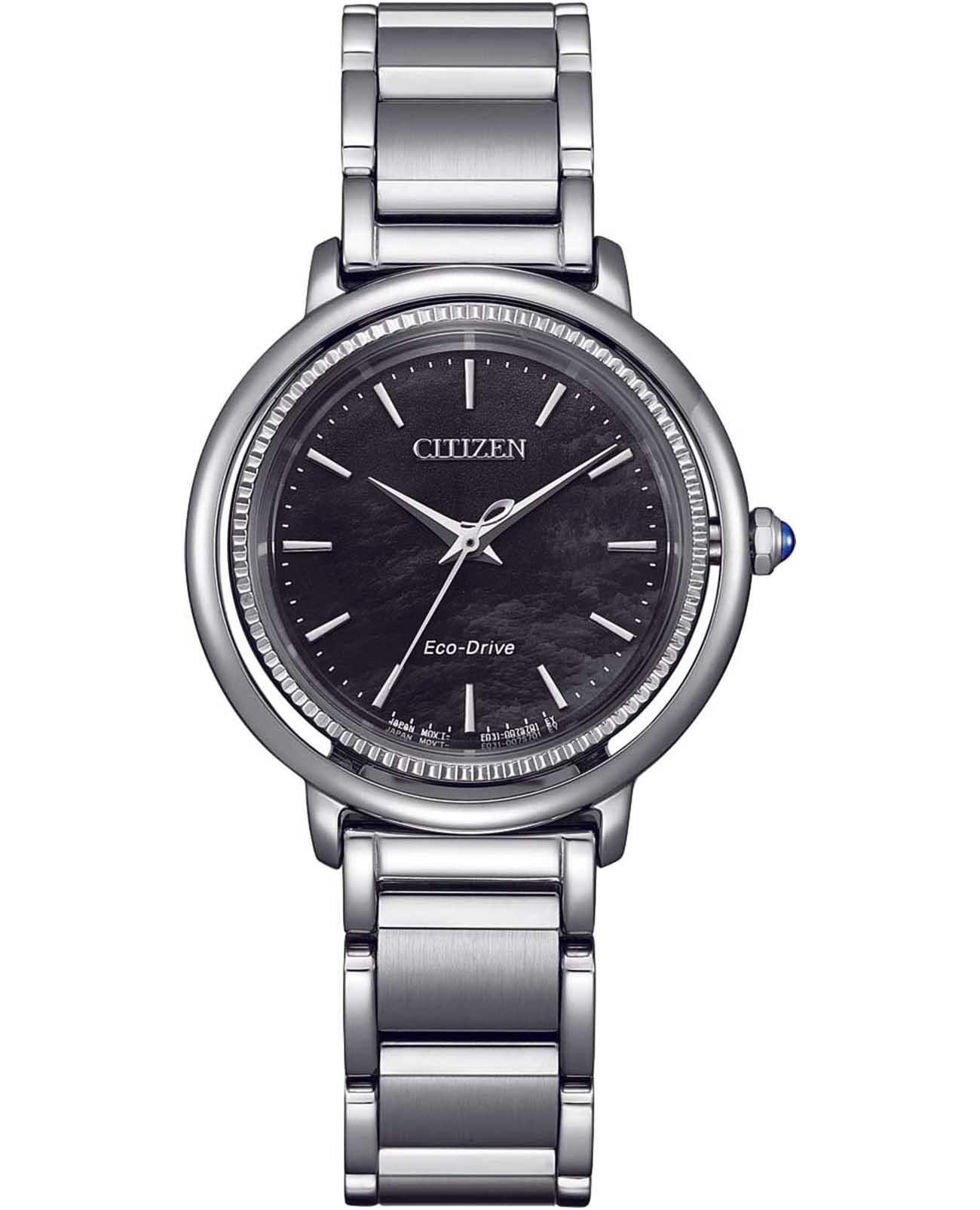 Элегантные часы Citizen EM1100-84H произведены в Японии и оснащены современным кварцевым механизмом Citizen E031 с инновационной системой Eco-Drive, которая использует энергию солнечного света и не требует замены батарейки, обеспечивая до 180 дней работы в автономном режиме. Корпус и браслет выполнены из высококачественной нержавеющей стали, что гарантирует долговечность и износостойкость. Перламутровый черный циферблат с изящными штриховыми метками защищён выпуклым сапфировым стекломСапфировое стеклоПрочный и надёжный материал из кристалла сапфира синтетического происхождения, характеризующийся особой твёрдостью и устойчивостью к царапинам и повреждениям., устойчивым к царапинам. БезельБезельВнешний ободок, закрепляющий стекло. В спортивных часах так называется поворотное кольцо с делениями на циферблате, выполняет роль таймера – замеряет отрезки времени на шкале. Неподвижный безель – элемент декора. Однонаправленно вращающийся безель на дайверских часах позволяет фиксировать моменты погружения и выныривания на поверхность. часов декорирован алмазной гранью, а заводная головка украшена камнем в форме кабошона, что придаёт модели особый шарм. Задняя крышка закреплена на четырёх винтах, что повышает надёжность конструкции. Часы имеют водозащиту до 50 метров, а также функцию индикации заряда и предотвращения перезарядки. Размер корпуса составляет 31,2 мм в диаметре и 8 мм в толщину, вес — 71 грамм. Застежка «бабочка»Застёжка "бабочка"Такой вид застёжки дополняется предохранителями, помогающими избежать случайного раскрытия браслета. Обладают изящным исполнением. у браслета обеспечивает комфортное и надёжное ношение. Эта модель идеально подчеркнёт изысканный стиль и индивидуальность своей обладательницы.