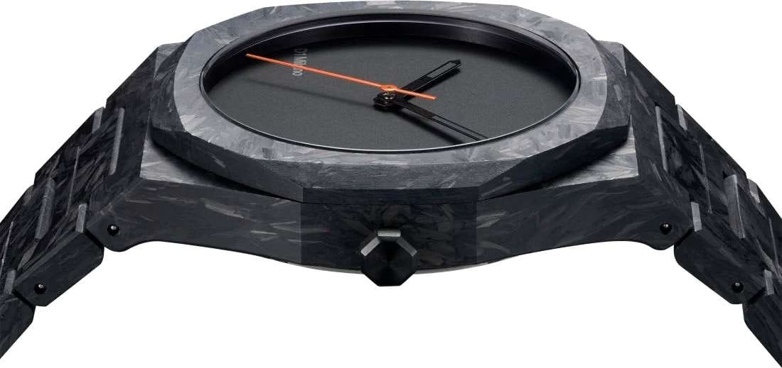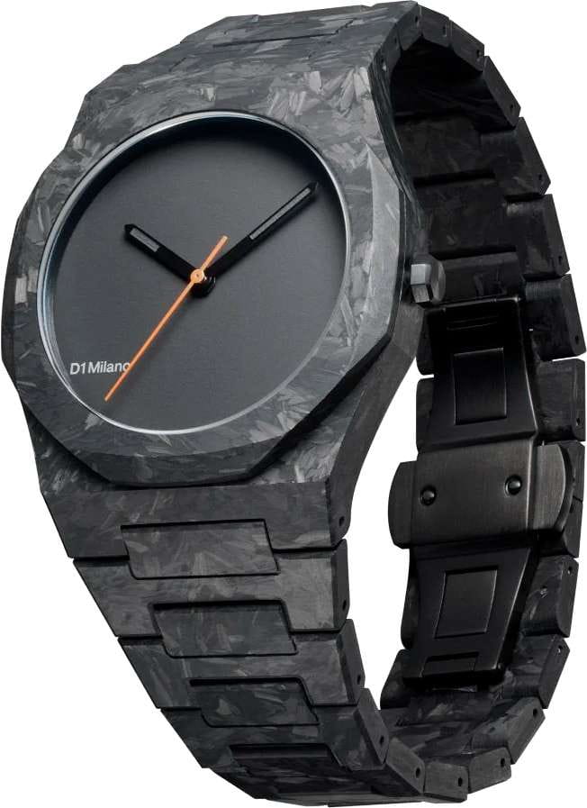 Мужские часы D1 Milano CRBJ01 из коллекции Carbonlite - воплощение инновационного дизайна и передовых материалов. Carbon Limited Edition. Мужские механические часы с автоподзаводом. В механизме 24 камня, частота 28800 полуколебаний в час. Запас хода 42 часа. Лимитированная серия. Корпус из карбона с текстурированным рисунком. Циферблат лаконичный из карбона. Сапфировое стеклоСапфировое стеклоПрочный и надёжный материал из кристалла сапфира синтетического происхождения, характеризующийся особой твёрдостью и устойчивостью к царапинам и повреждениям. и браслет из карбона с текстурой и застёжкой «бабочка» с кнопкамиЗастёжка "бабочка"Такой вид застёжки дополняется предохранителями, помогающими избежать случайного раскрытия браслета. Обладают изящным исполнением. . Водонепроницаемость 5 АТМ. Особенность этой коллекции - использование композитных материалов из углеродного нейлона и волокна, специально разработанных D1 Milano. Нить изготовлена из EPA-CF, прочность на растяжение 140 МПа, деформация 155 градусов, ударная вязкость 18,67 кДж/м2.