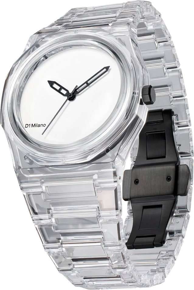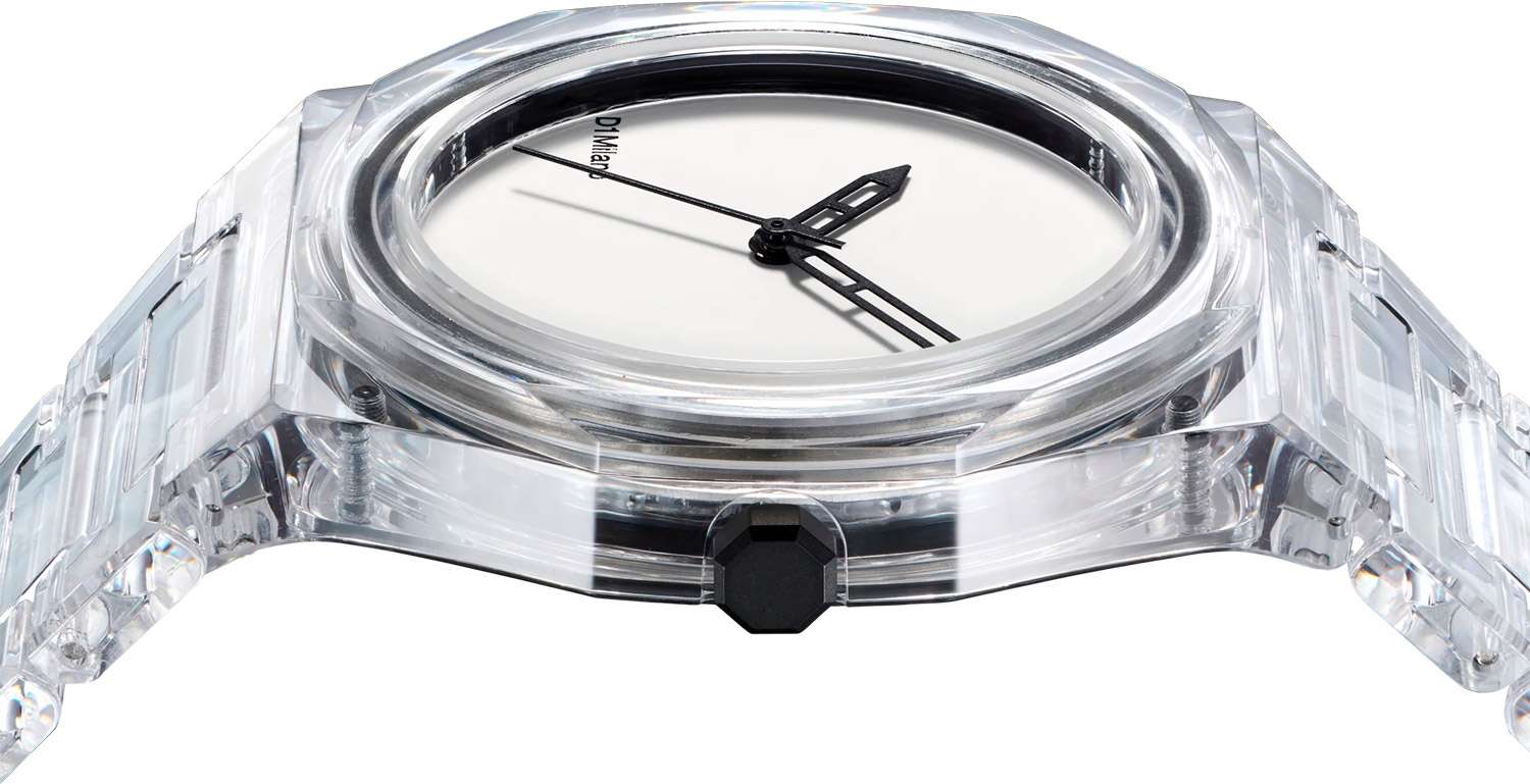 Часы D1 Milano Nylon NYBJ01 – модный и стильный аксессуар-унисекс лаконичного дизайна. Корпус выполнен из прозрачного нейлона. Белый матовый циферблат без индексов. Стрелки-скелетон из латуни. Задняя крышка из стали с черным PVD-покрытиемPVDУльтратонкое покрытие наносится в технике вакуумного напыления, сочетает в себе нитрид титана особой прочности со слоем золота или оксида хрома. Несёт в себе декоративную или защитную функцию. закреплена на 4 винтах. Ремешок из прозрачного нейлона имеет застёжку «бабочка» с кнопкамиЗастёжка "бабочка"Такой вид застёжки дополняется предохранителями, помогающими избежать случайного раскрытия браслета. Обладают изящным исполнением. .