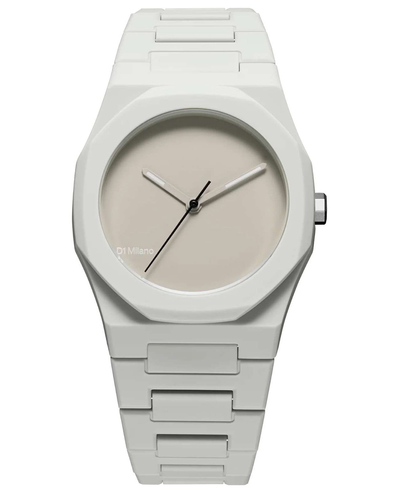 Часы D1 Milano Polycarbon PCBU08 – молодежные часы в стиле унисекс для повседневных образов, стильные и комфортные. Модель имеет белый корпус и браслет из поликарбоната с покрытием Софт-Тач.. Циферблат лаконичный с индексами в виде штрихов, защищен минеральным стекломМинеральное стеклоМинеральное стекло представляет собой искусственно выращенный минерал кварца. Такое стекло отличается особой устойчивостью к повреждениям и царапинам. Уступает по некоторым качествам сапфировому стеклу. с антибликовым покрытием. Стальная задняя крышка на 4 винтах. Пластиковый браслет на застёжке-бабочке с кнопкамиЗастёжка "бабочка"Такой вид застёжки дополняется предохранителями, помогающими избежать случайного раскрытия браслета. Обладают изящным исполнением. .