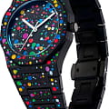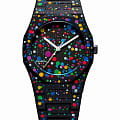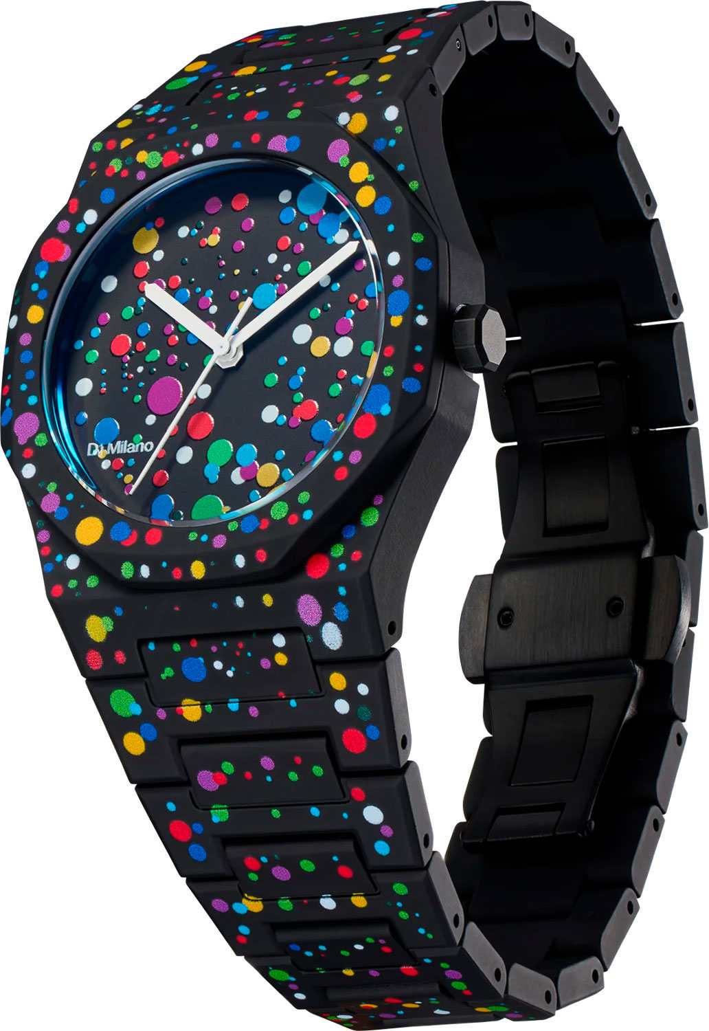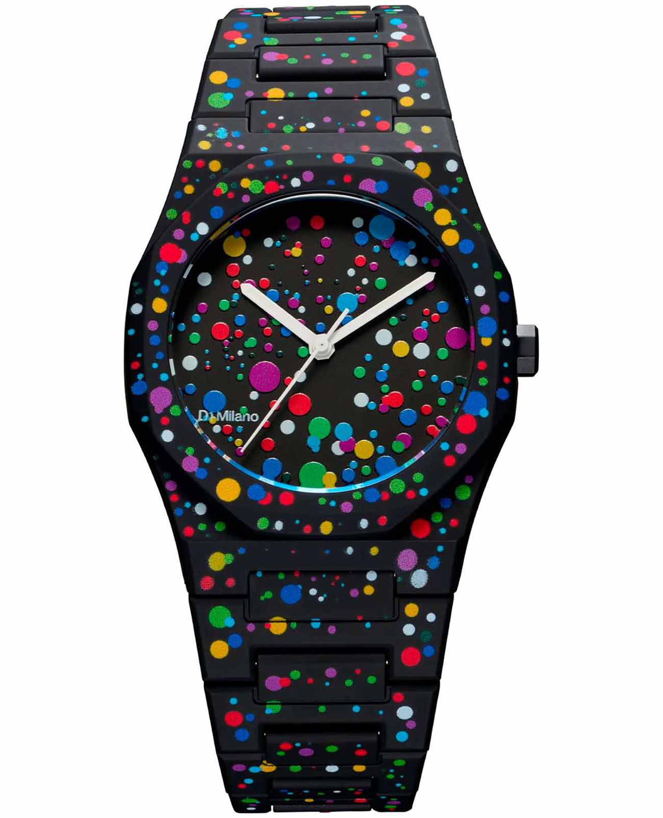 Часы D1 Milano Polycarbon PCBU11 – молодежные часы в стиле унисекс для повседневных образов, стильные и комфортные.  Модель Poly Dot имеет черные с цветными брызгами корпус и браслет  из поликарбоната с покрытием Софт-Тач. Циферблат лаконичный, защищен минеральным стекломМинеральное стеклоМинеральное стекло представляет собой искусственно выращенный минерал кварца. Такое стекло отличается особой устойчивостью к повреждениям и царапинам. Уступает по некоторым качествам сапфировому стеклу. с антибликовым покрытием. Стальная задняя крышка на 4 винтах.  Пластиковый браслет на застёжке-бабочке с кнопкамиЗастёжка "бабочка"Такой вид застёжки дополняется предохранителями, помогающими избежать случайного раскрытия браслета. Обладают изящным исполнением. .