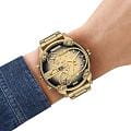 Мужские кварцевые часы Diesel Mr. Daddy 2.0 DZ7490 — это многофункциональный аксессуар, сочетающий в себе стиль и технические возможности. Модель оснащена хронографомХронографФункция позволяет измерять отрезки времени с особой точностью: часы, минуты, секунды. Верным признаком хронографа является наличие на циферблате 3 дополнительных окошек-счётчиков. с секундомеромСекундомерСекундоме́р — прибор, способный измерять интервалы времени с точностью до долей секунды., что делает её удобной для измерения времени с высокой точностью. Циферблат золотистого цвета, а его дизайн включает штриховые метки, а также окошко даты в положении 3 часов. Защиту циферблата обеспечивает Минеральное стеклоМинеральное стеклоМинеральное стекло представляет собой искусственно выращенный минерал кварца. Такое стекло отличается особой устойчивостью к повреждениям и царапинам. Уступает по некоторым качествам сапфировому стеклу., устойчивое к мелким повреждениям. Корпус диаметром 54 мм выполнен из стали с золотым PVD-покрытиемPVDУльтратонкое покрытие наносится в технике вакуумного напыления, сочетает в себе нитрид титана особой прочности со слоем золота или оксида хрома. Несёт в себе декоративную или защитную функцию., включающим матовые и полированные детали. Стальной браслет с золотым PVD-покрытиемPVDУльтратонкое покрытие наносится в технике вакуумного напыления, сочетает в себе нитрид титана особой прочности со слоем золота или оксида хрома. Несёт в себе декоративную или защитную функцию. оснащён раскладной застёжкойРаскладная застёжкаТакой тип застёжки используется только на браслетах из металла. Она никогда не раскрывается полностью, происходит разделение на 2 и более частей. Раскладывающая застёжка снизит вероятность потери часов к минимуму. с двумя кнопками, обеспечивающей комфорт и надёжную фиксацию на запястье. Водонепроницаемость 30WR позволяет использовать модель при мытье рук или под лёгким дождём. Эти часы станут универсальным аксессуаром для тех, кто ценит сочетание функциональности, эстетики и надёжности — идеальный выбор для повседневного использования и активного образа жизни.