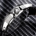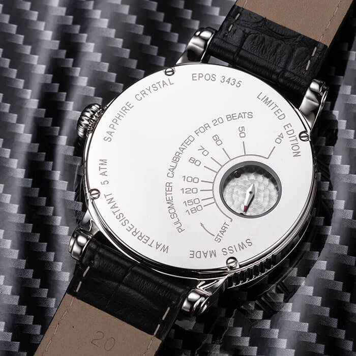 Мужские механические часы с ручным подзаводом Epos из коллекции Verso 2 — это уникальное произведение часового искусства. Корпус диаметром 43,5 мм и толщиной 11 мм выполнен из нержавеющей стали 316L. Циферблат белого цвета с винтажным дизайном оформлен печатными римскими цифрами чёрного цвета и стрелками в стиле «яблоко Бреге» с синением. Циферблат защищён сапфировым стекломСапфировое стеклоПрочный и надёжный материал из кристалла сапфира синтетического происхождения, характеризующийся особой твёрдостью и устойчивостью к царапинам и повреждениям.. Часовая и минутная стрелки смещены от центра, а малая секундная стрелка пульсометра выведена на обратную сторону корпуса. Механизм — швейцарский калибр ETA Unitas 6497 с ручным подзаводом, частично скелетонизированный, с декорированными мостами, гравировкой и жемчужным зернением. Заводная головка — винтовая, формы «луковица». Модель оснащена кожаным ремешком чёрного цвета с тиснением под аллигатора и классической пряжкой. Функция пульсометра позволяет измерять частоту сердечных сокращений. Модель выпущена ограниченной серией — 888 экземпляров. Водонепроницаемость 50 м позволяет использовать часы в повседневных условиях. Гарантия — 24 месяца. Уникальный выбор для ценителя редких и эксклюзивных механизмов.
