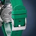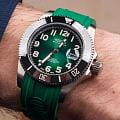Мужские механические часы с автоподзаводом — это профессиональный дайверский инструмент с швейцарским качеством. Корпус диаметром 41,5 мм и толщиной 13,3 мм выполнен из титана с PVD-покрытиемPVDУльтратонкое покрытие наносится в технике вакуумного напыления, сочетает в себе нитрид титана особой прочности со слоем золота или оксида хрома. Несёт в себе декоративную или защитную функцию., что обеспечивает лёгкость и высокую прочность. Циферблат зелёного цвета оформлен контрастными метками и стрелками. Циферблат защищён сапфировым стекломСапфировое стеклоПрочный и надёжный материал из кристалла сапфира синтетического происхождения, характеризующийся особой твёрдостью и устойчивостью к царапинам и повреждениям.. Механизм — швейцарский калибр Sellita SW200. Окошко даты расположено в положении 3 часов. БезельБезельВнешний ободок, закрепляющий стекло. В спортивных часах так называется поворотное кольцо с делениями на циферблате, выполняет роль таймера – замеряет отрезки времени на шкале. Неподвижный безель – элемент декора. Однонаправленно вращающийся безель на дайверских часах позволяет фиксировать моменты погружения и выныривания на поверхность. — однонаправленный вращающийся. Завинчивающаяся коронка и автоматический гелиевый клапан позволяют использовать часы при глубоководных погружениях. Часы оснащены каучуковым ремешком зелёного цвета с стандартной застёжкой. Водонепроницаемость 500 м соответствует требованиям для профессионального дайвинга. Вес — 98 г. Гарантия — 24 месяца. Идеальный выбор для тех, кто ценит надёжность, точность и экстремальные условия.