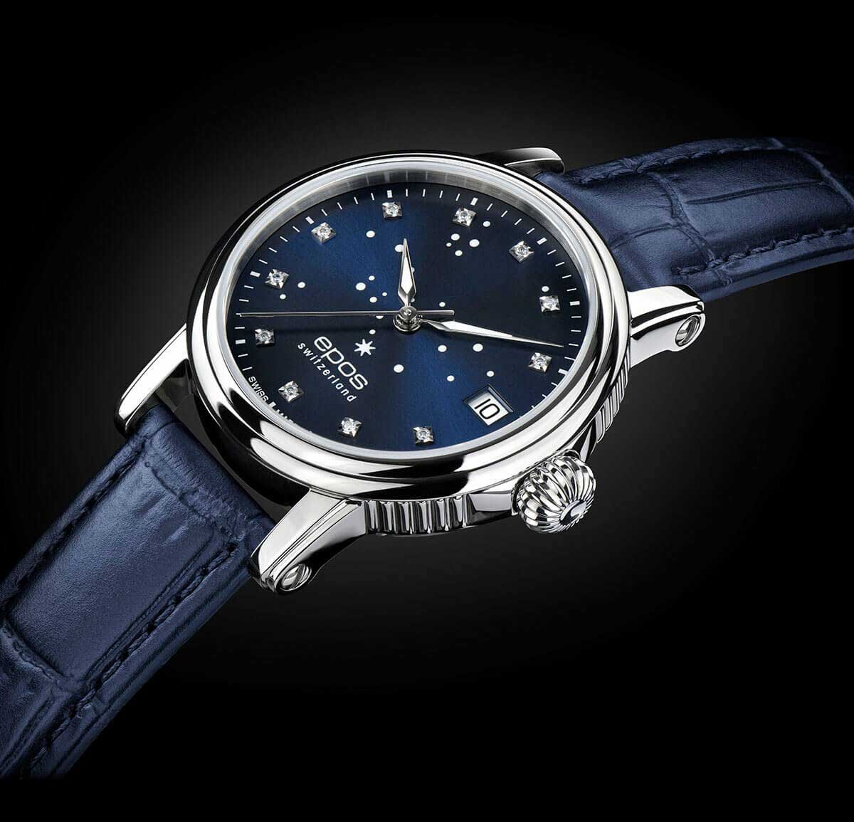 Женские механические часы с автоподзаводом Epos Ladies 4390.152.20.96.16. Сапфировое стеклоСапфировое стеклоПрочный и надёжный материал из кристалла сапфира синтетического происхождения, характеризующийся особой твёрдостью и устойчивостью к царапинам и повреждениям. устойчивое к появлению царапин, обладающее высокой прозрачностью. Корпус часов изготовлен из нержавеющей стали. В механизме 21 камень, частота 28800 полуколебаний в час. Запас хода 42 часа. Циферблат украшен 11 бриллиантами. Метки в виде точек. Окошко даты находится в положении 3 часа. Часовой механизм декорирован. Прозрачная задняя крышка с минеральным стекломМинеральное стеклоМинеральное стекло представляет собой искусственно выращенный минерал кварца. Такое стекло отличается особой устойчивостью к повреждениям и царапинам. Уступает по некоторым качествам сапфировому стеклу.. Крупная рельефная заводная головка. Водостойкость: 50 метров, позволит защитить корпус от случайных брызг или капель дождя. Кожаный ремешок на стандартной застёжке.