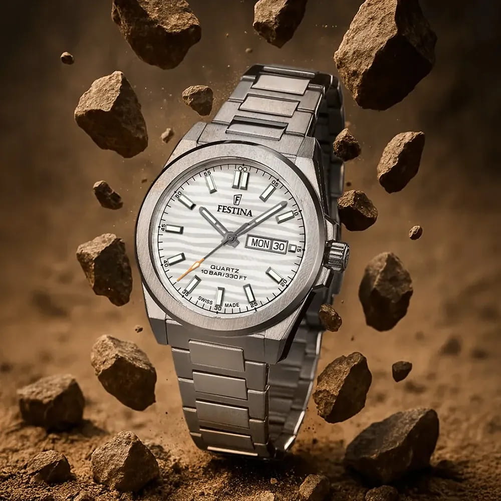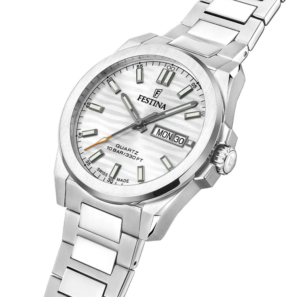 Мужские кварцевые часы Festina F20073/1 из коллекции Swiss Made — это стильный аксессуар с швейцарским качеством и повседневным дизайном. Корпус диаметром 40 мм выполнен из нержавеющей стали серебряного цвета. Циферблат белого цвета дополнен окошком даты и дня недели в положении 3 часов. Циферблат защищён сапфировым стекломСапфировое стеклоПрочный и надёжный материал из кристалла сапфира синтетического происхождения, характеризующийся особой твёрдостью и устойчивостью к царапинам и повреждениям.. Секундная стрелка — оранжевого цвета, что добавляет модели яркий акцент. Заводная головка — вытягивающегося типа, задняя крышка — завинчивающаяся. Часы оснащены стальным браслетом на раскладной застёжкеРаскладная застёжкаТакой тип застёжки используется только на браслетах из металла. Она никогда не раскрывается полностью, происходит разделение на 2 и более частей. Раскладывающая застёжка снизит вероятность потери часов к минимуму. с кнопками. Механизм — швейцарский кварцевый калибр Ronda 517 с 45-месячным сроком службы батареи. Водонепроницаемость 100 м позволяет использовать часы для плавания. Универсальный выбор для тех, кто ценит точность, надёжность и лаконичный стиль.